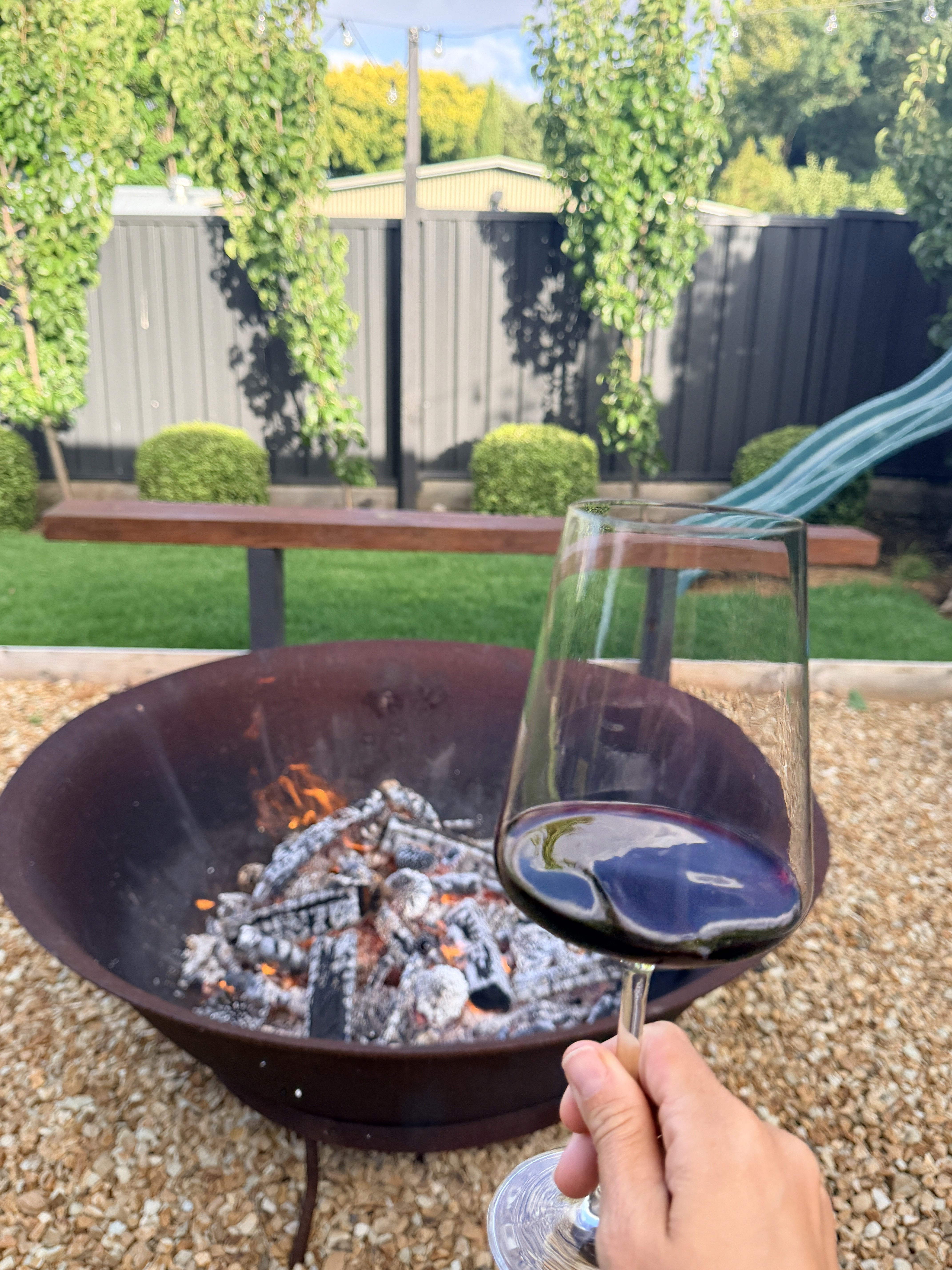 Abbiamo trovato un Airbnb meraviglioso: fuoco acceso in giardino, bottiglia di vino pronta e una casa curata in ogni dettaglio. Dopo giorni intensi, è stato un piccolo rifugio.