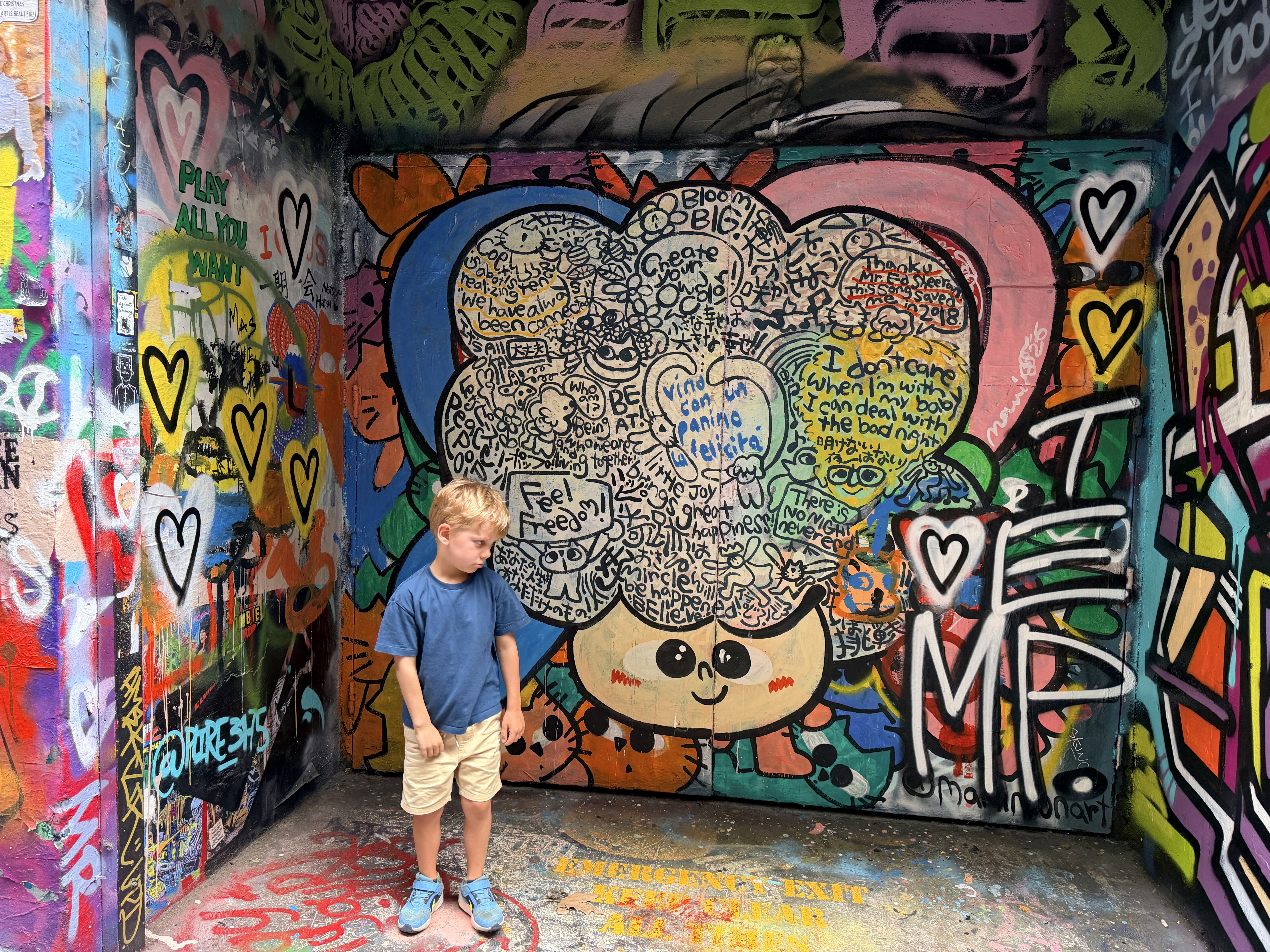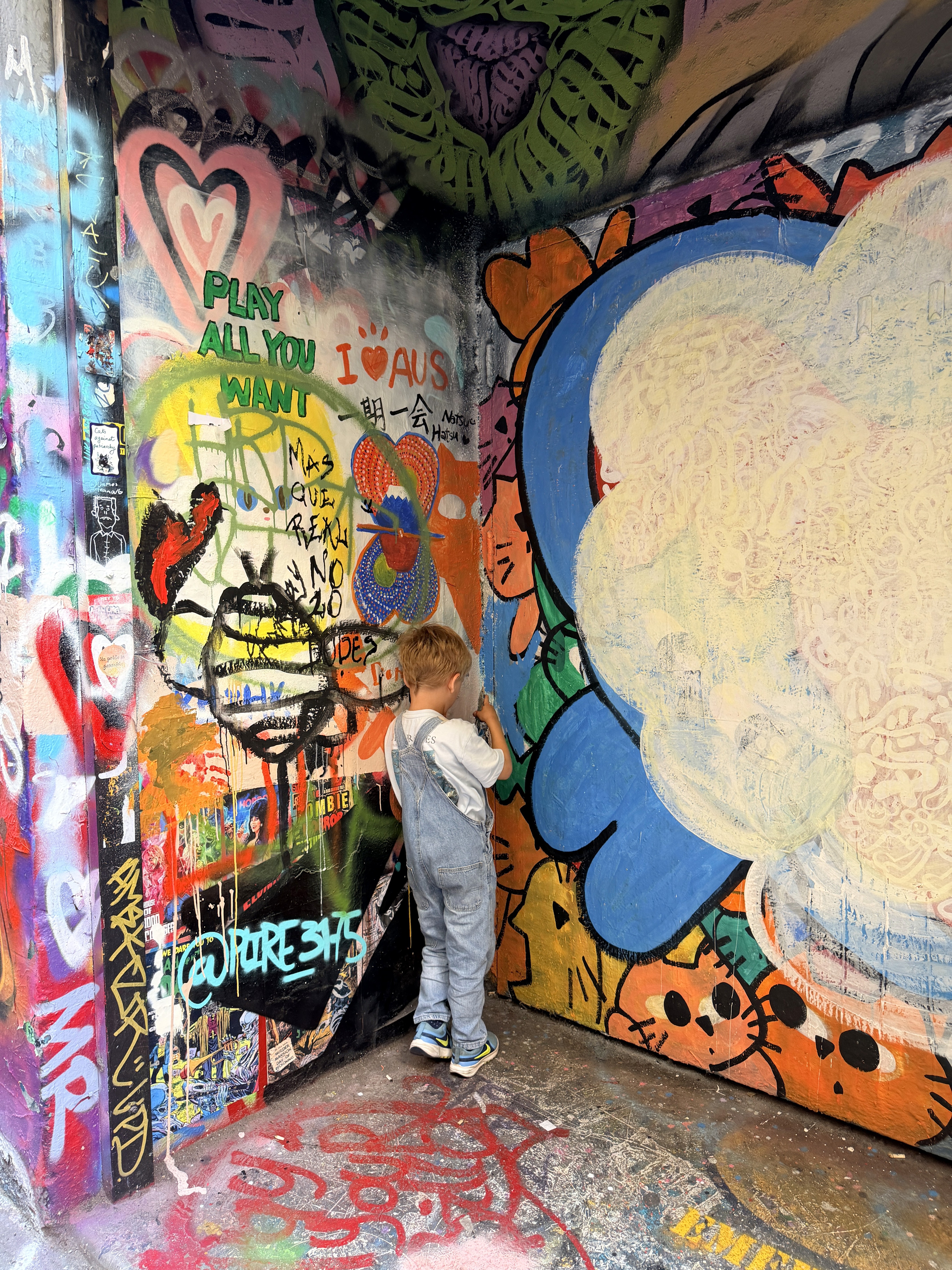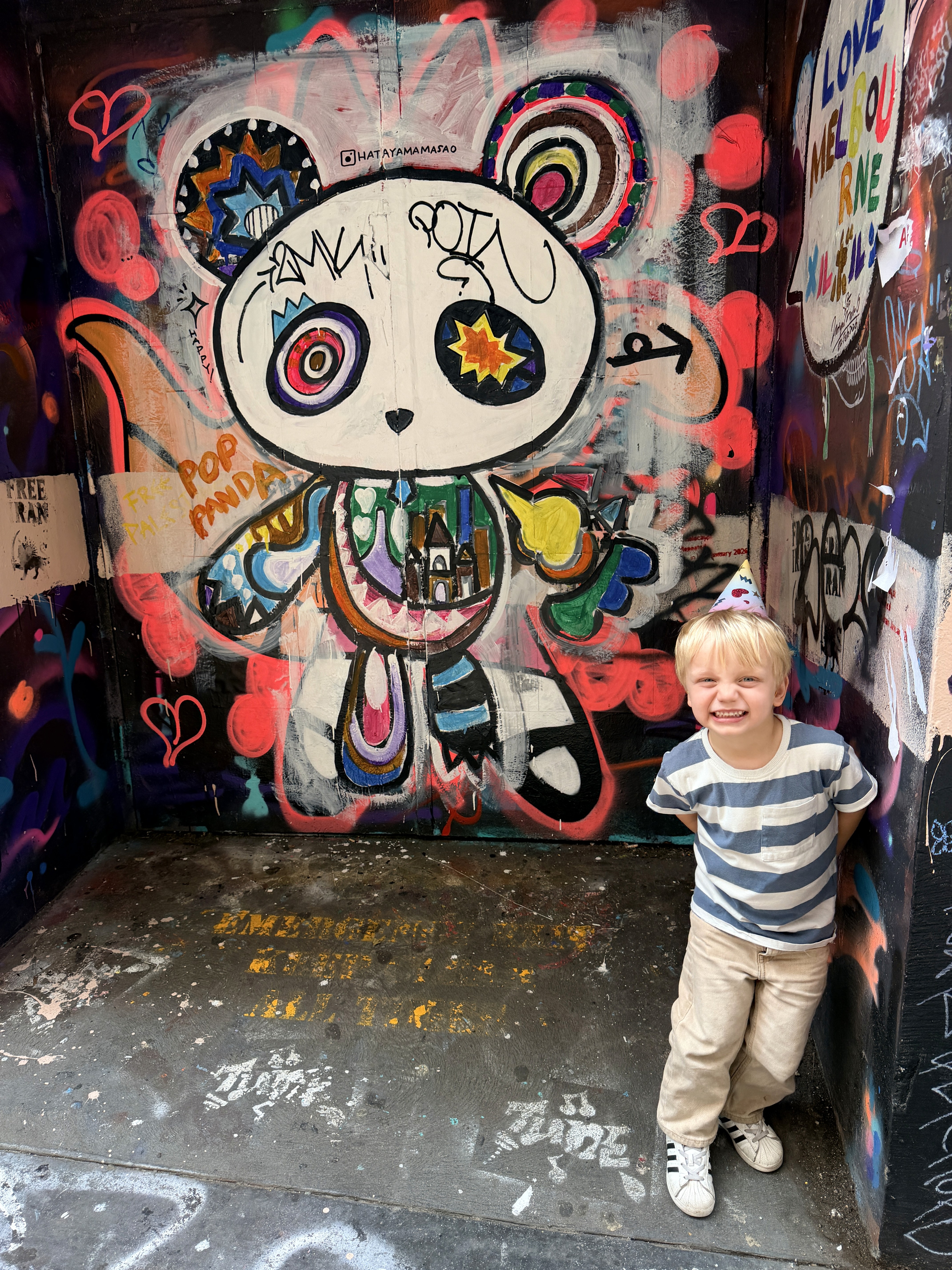 Proprio quel giorno abbiamo incontrato di nuovo Mamimun (@mamimunart), artista giapponese conosciuta sul Puffing Billy. Mamimun è una street artist che vive tra Giappone e Australia: il suo lavoro è pieno di colori, simboli giocosi e una gioia contagiosa, e trasforma i muri urbani in spazi accessibili anche ai bambini.