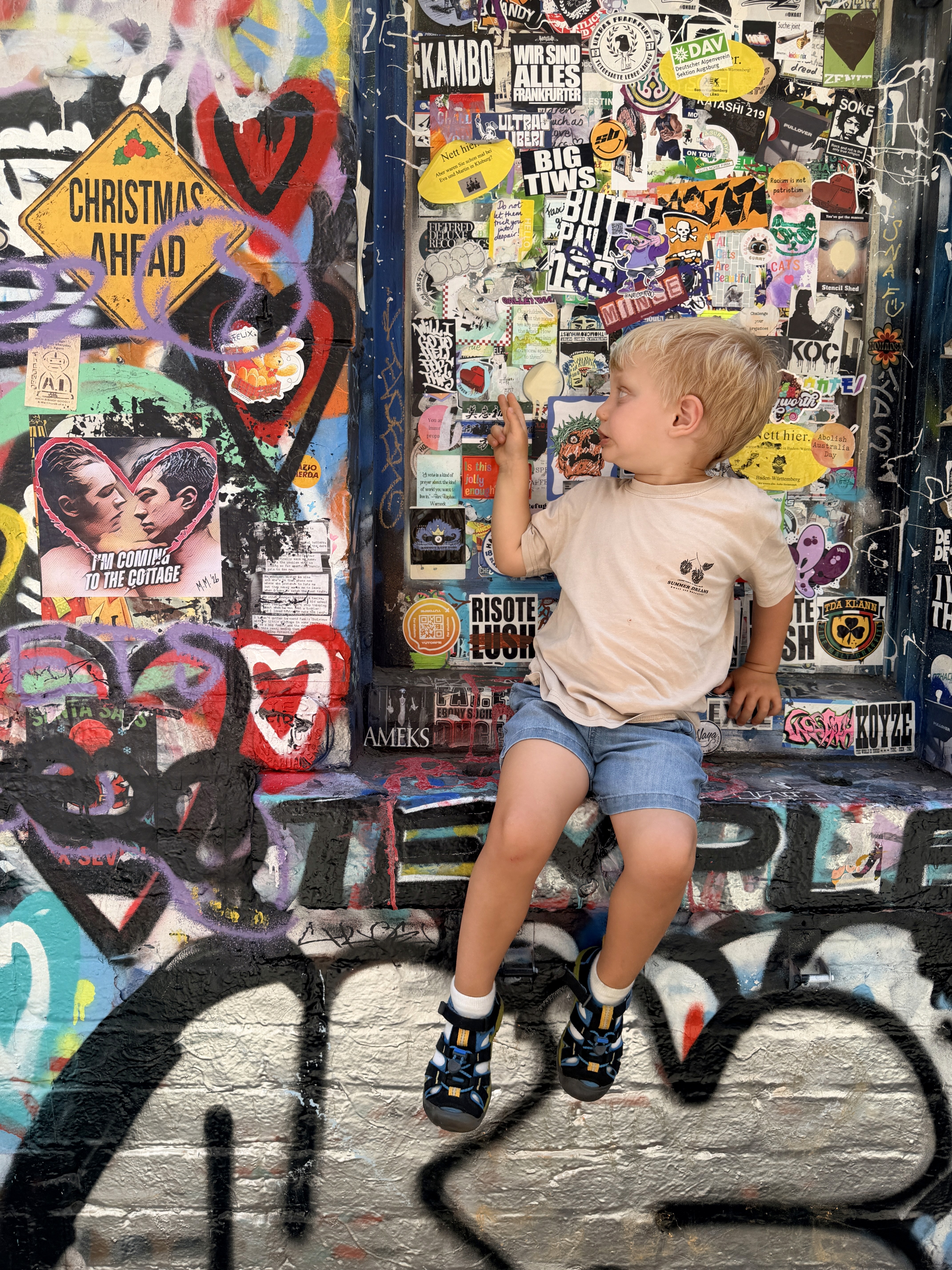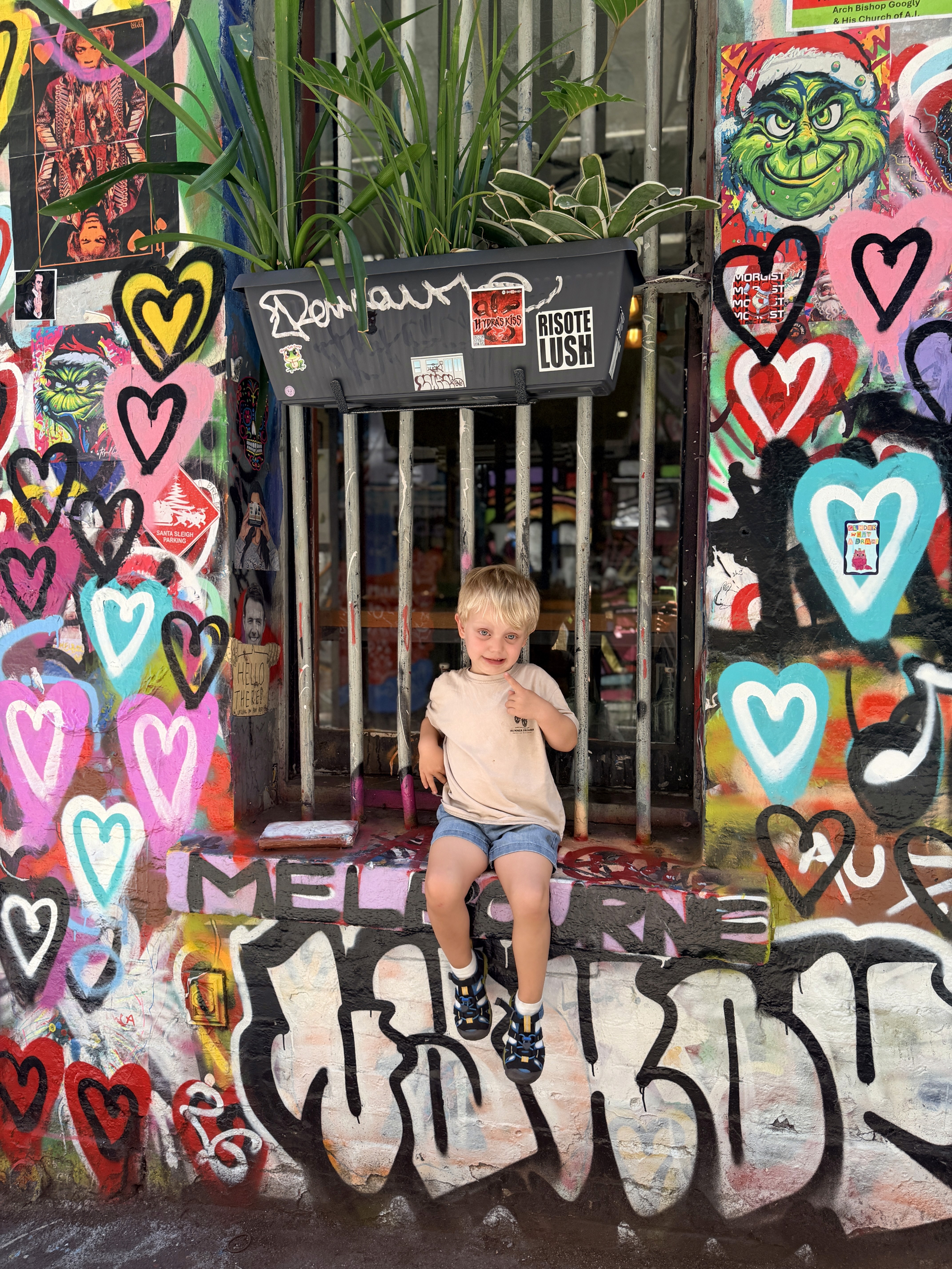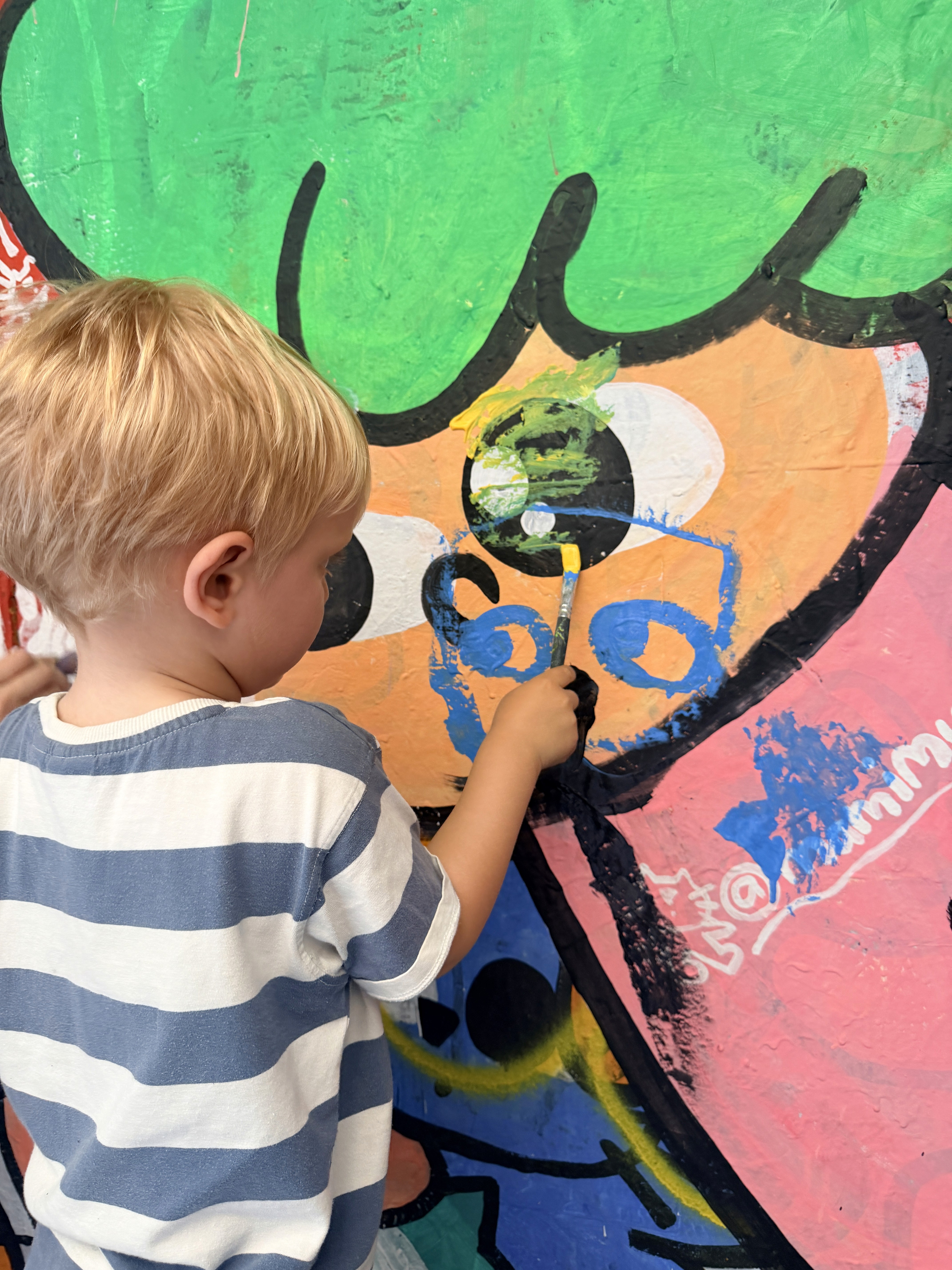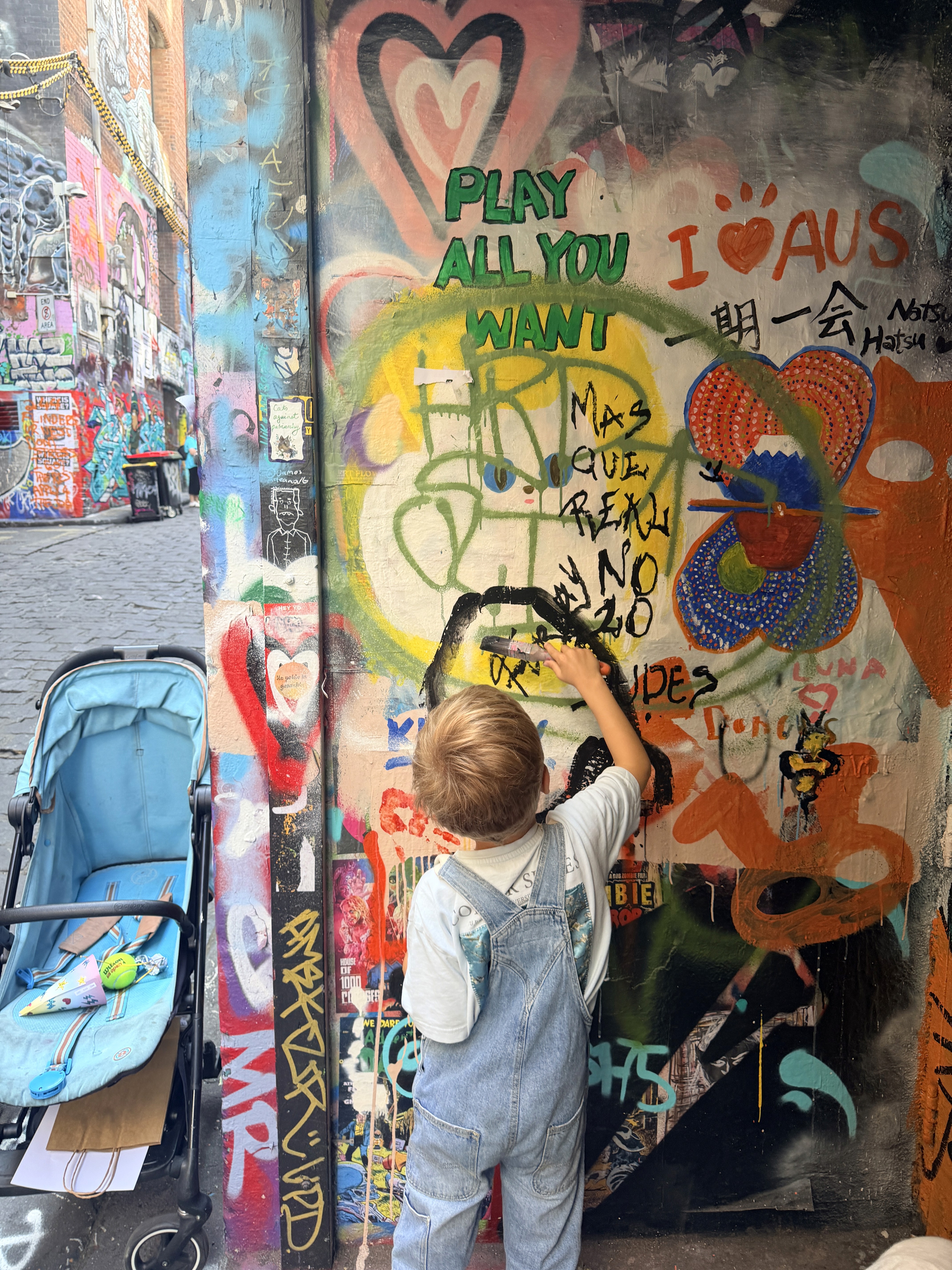 Proprio quel giorno abbiamo incontrato di nuovo Mamimun (@mamimunart), artista giapponese conosciuta sul Puffing Billy. Mamimun è una street artist che vive tra Giappone e Australia: il suo lavoro è pieno di colori, simboli giocosi e una gioia contagiosa, e trasforma i muri urbani in spazi accessibili anche ai bambini.