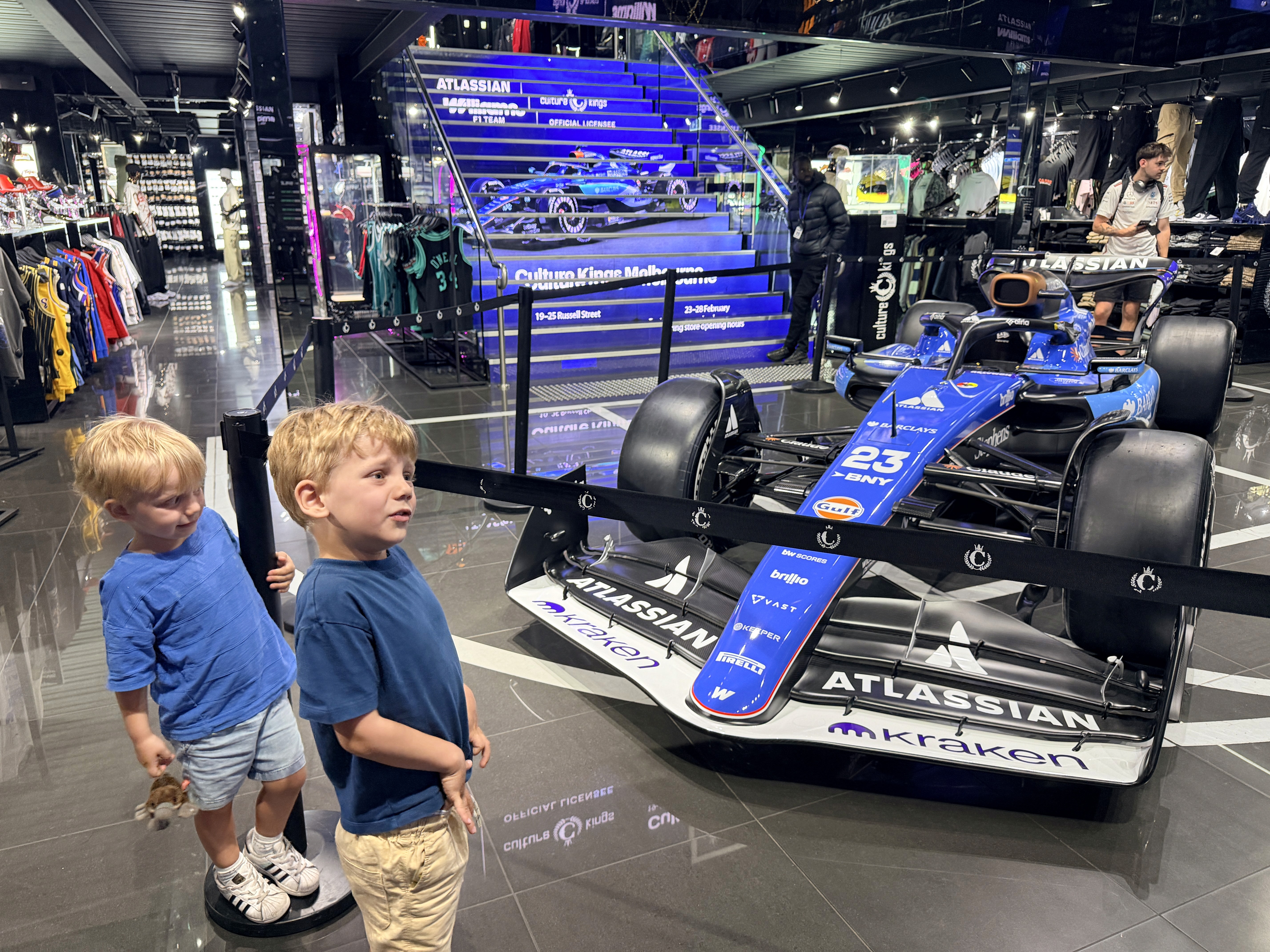 Siamo entrati nello store Williams F1 e i bambini erano ipnotizzati dalla macchina. Per strada abbiamo visto una vera F1 in prova — entusiasmo totale.