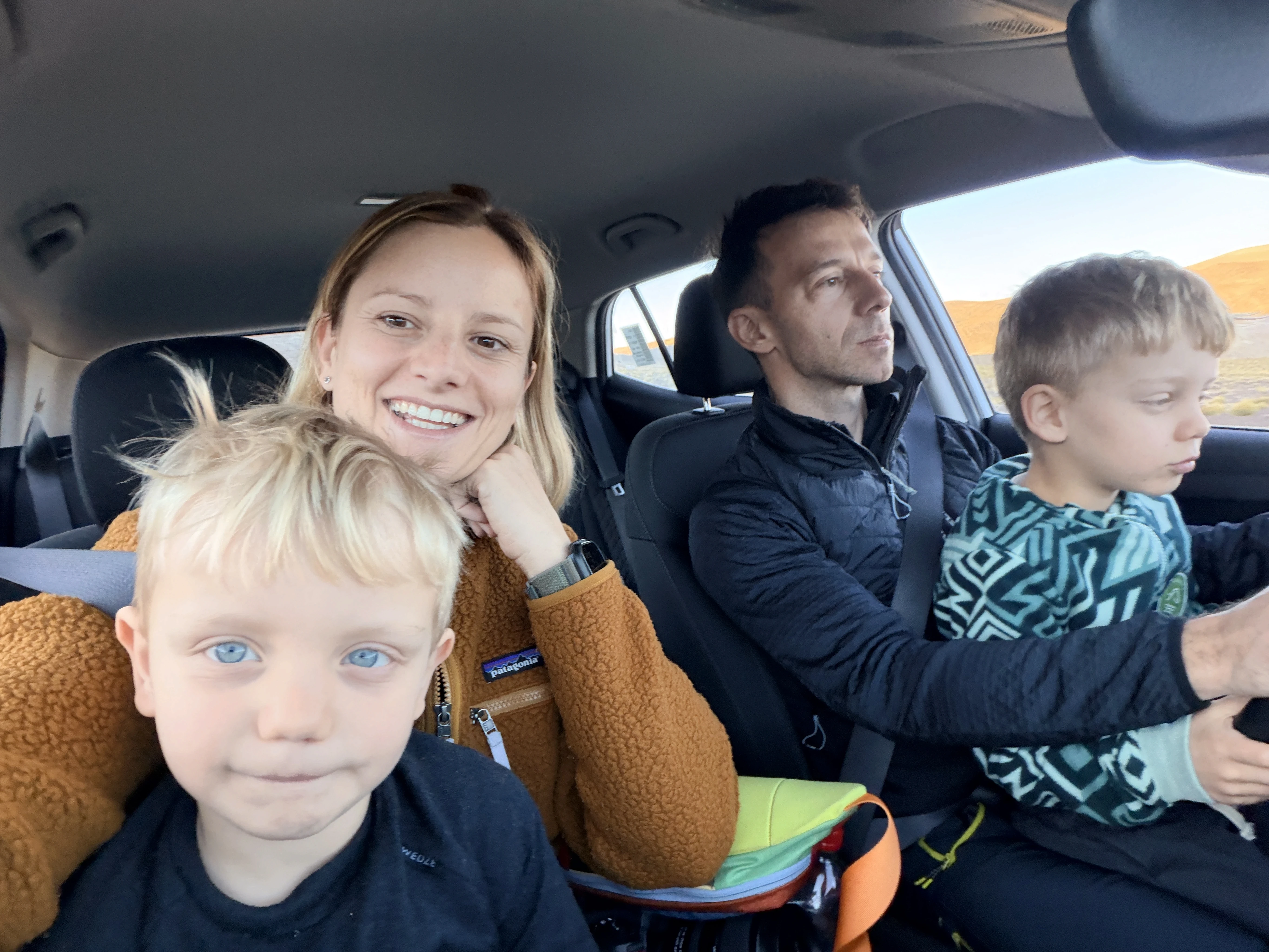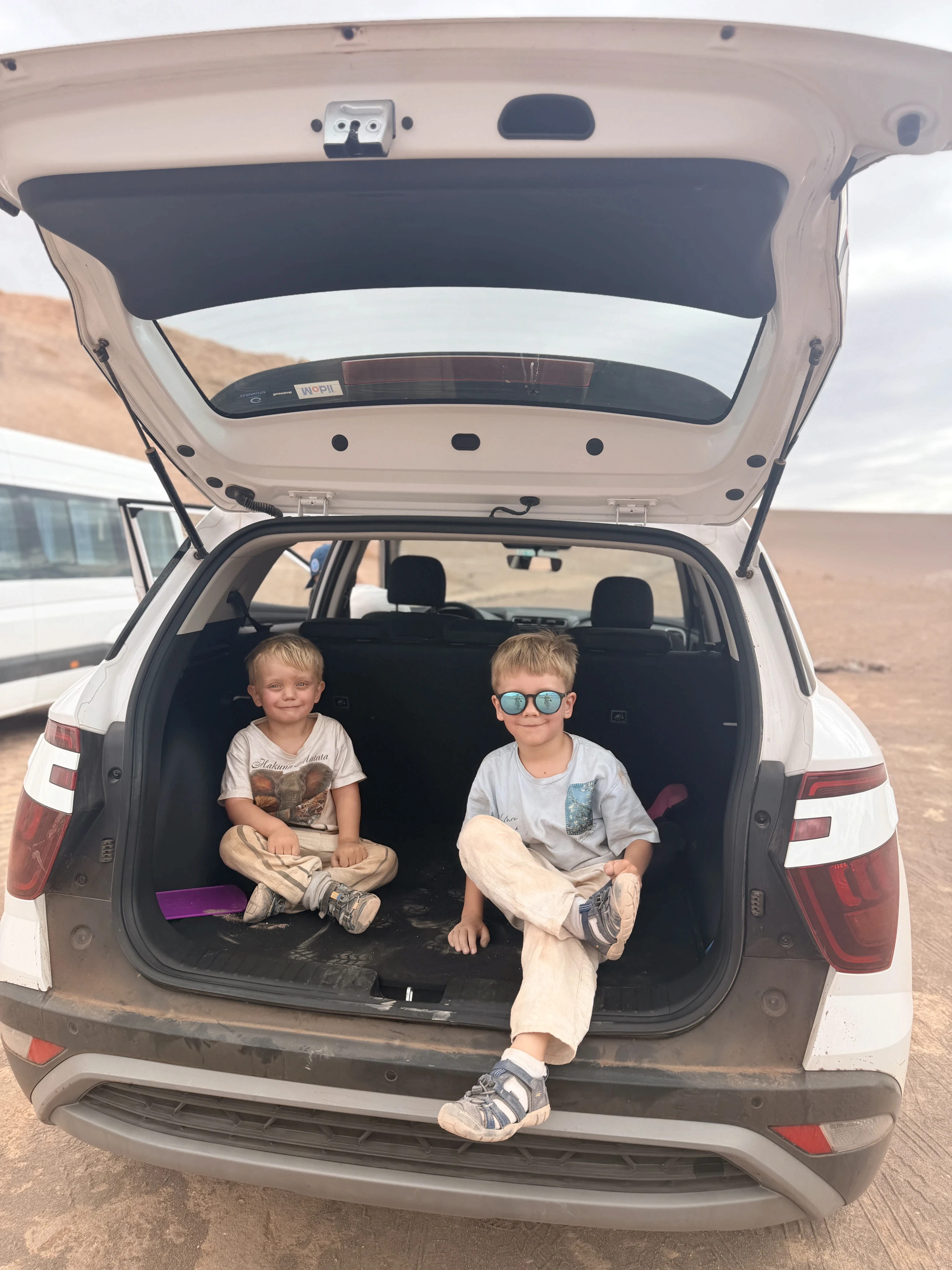 Dopo una lunga mattinata con attività scelte dai bimbi – quindi colazione, piscina e cartoni – siamo partiti verso le 3 del pomeriggio per il deserto. In macchina, come al solito: urla, anarchia, stanchezza, giochi di lotta, pesca con le cinture. Arriviamo già un po’ stanchi, ma pieni di aspettative.