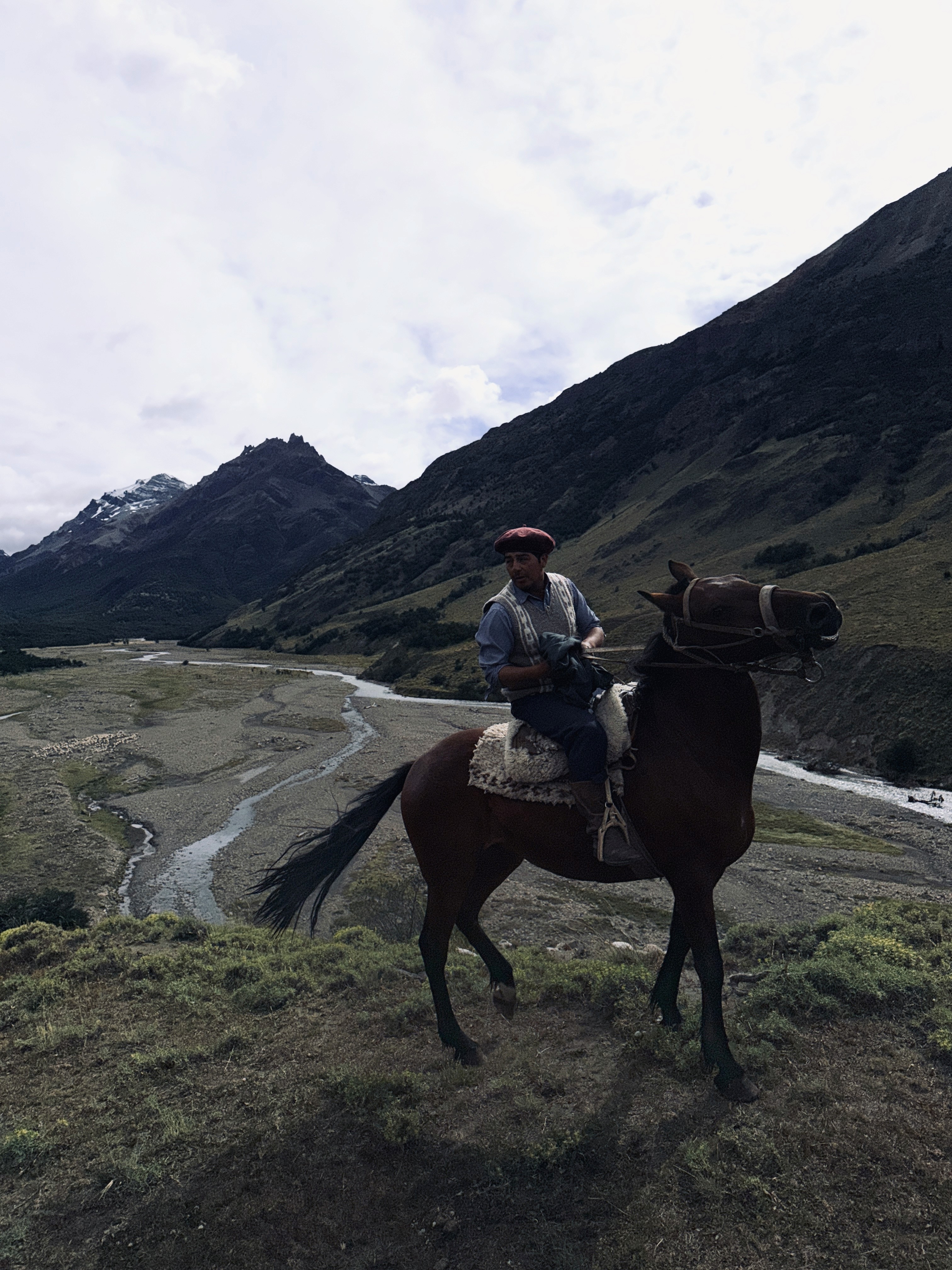 A un certo punto, dopo una discesa, assistiamo a una scena da film: un gregge di pecore che scende veloce, spinto da un gaucho che agita la camicia in una mano e indossa il suo basco argentino. Tre cani le guidano: due maremmani e un border collie.