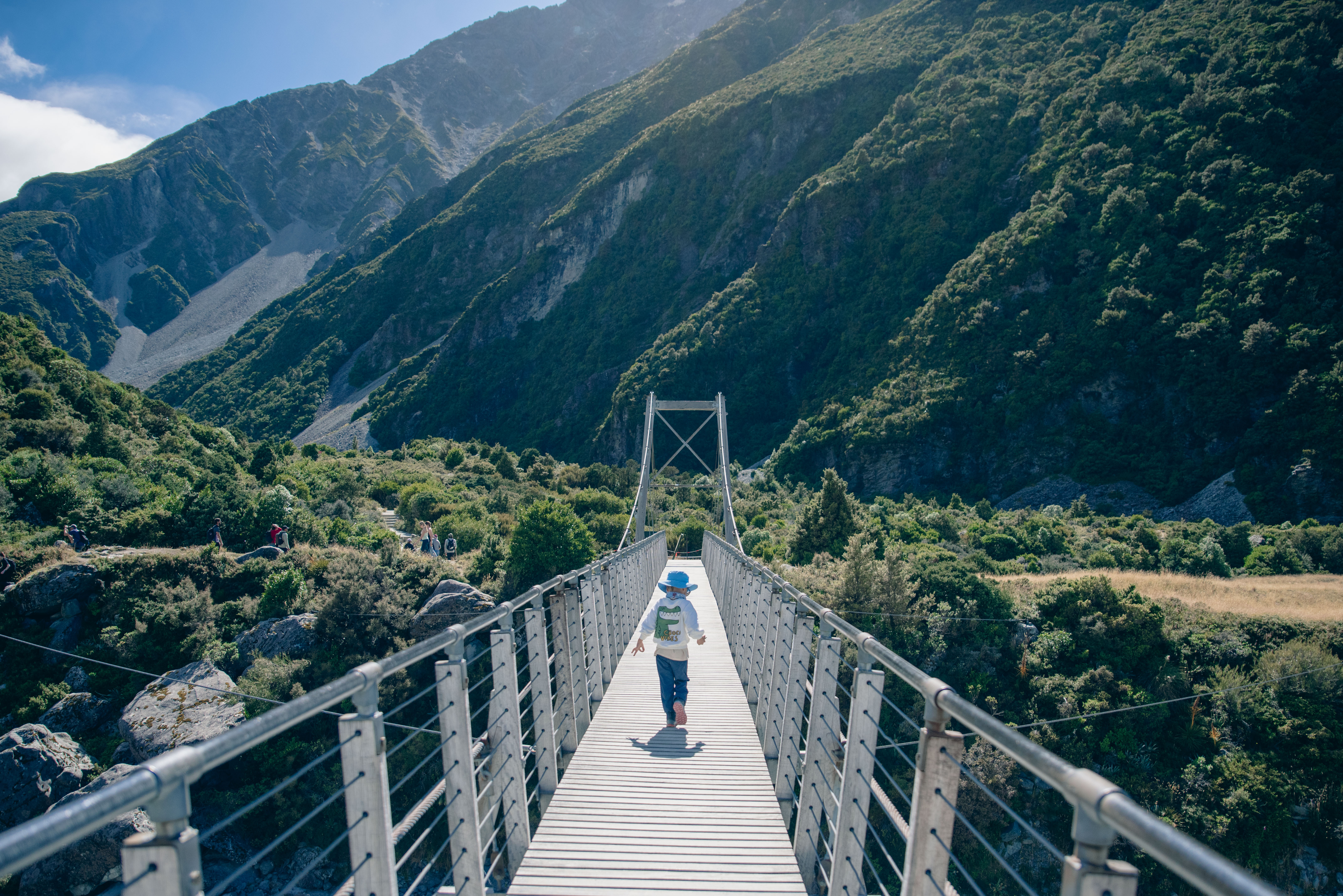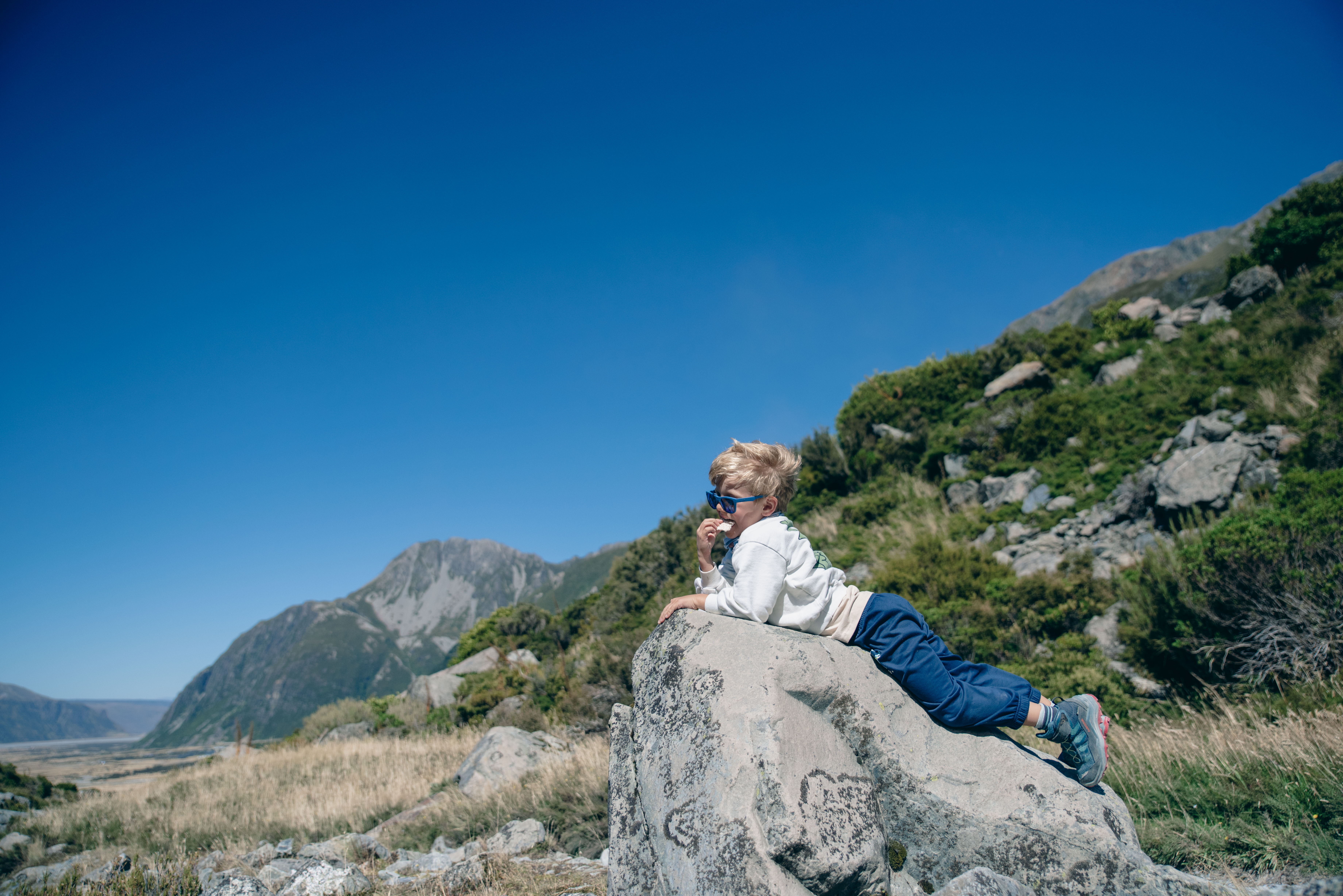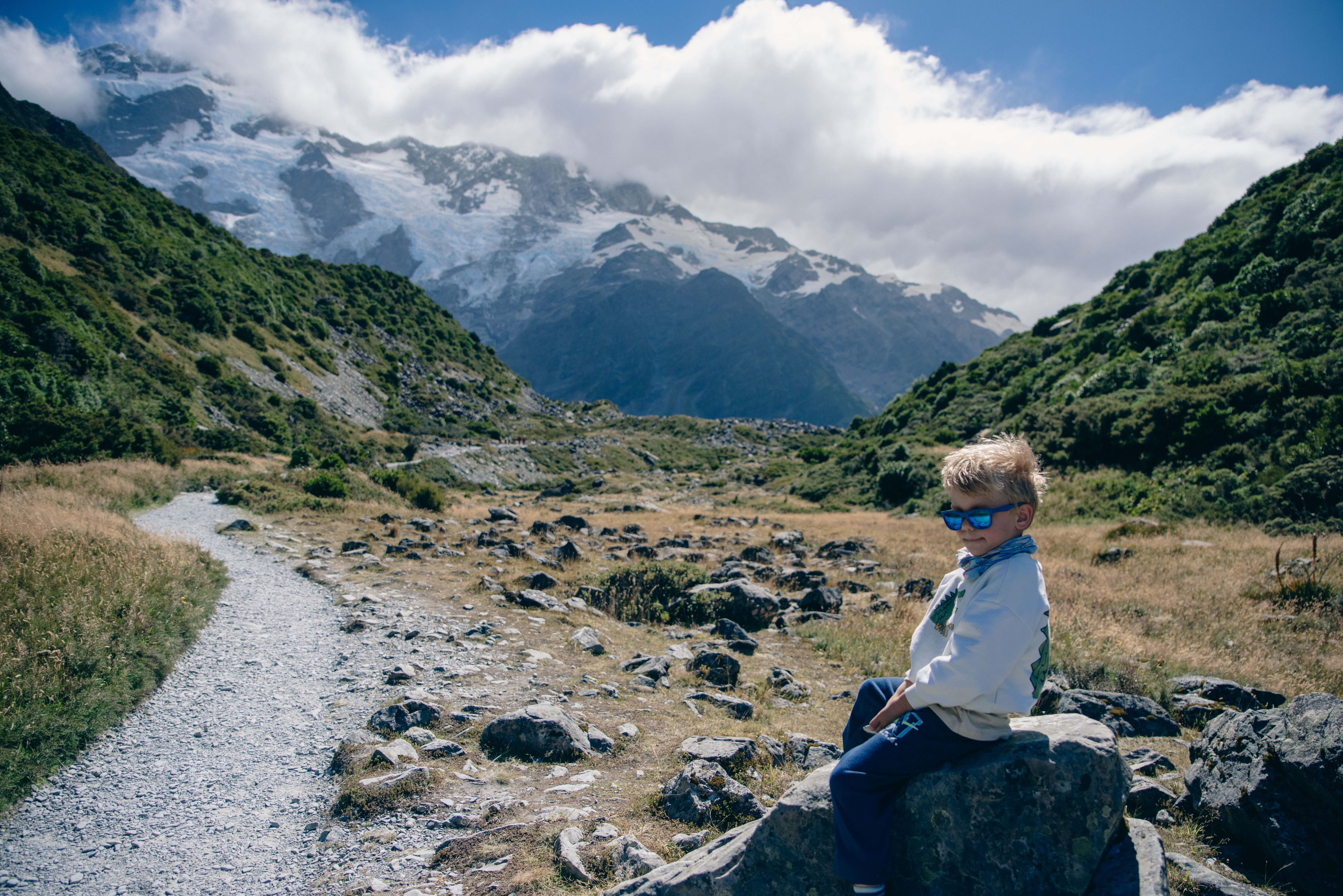 Da Lake Tekapo andiamo verso Mount Cook. Lì il paesaggio cambia di nuovo. Facciamo una camminata di 6 chilometri con i bambini, e già questo mi sembra notevole. C’è un vento folle, di quelli che ti prendono il corpo intero, ti spostano il cappello, ti fanno stringere gli occhi e ridere nello stesso momento. È bellissimo. Bello davvero, senza bisogno di aggiungere altro. Ricordo il vento più di tutto: il rumore, la forza, i bambini che continuano ad andare.