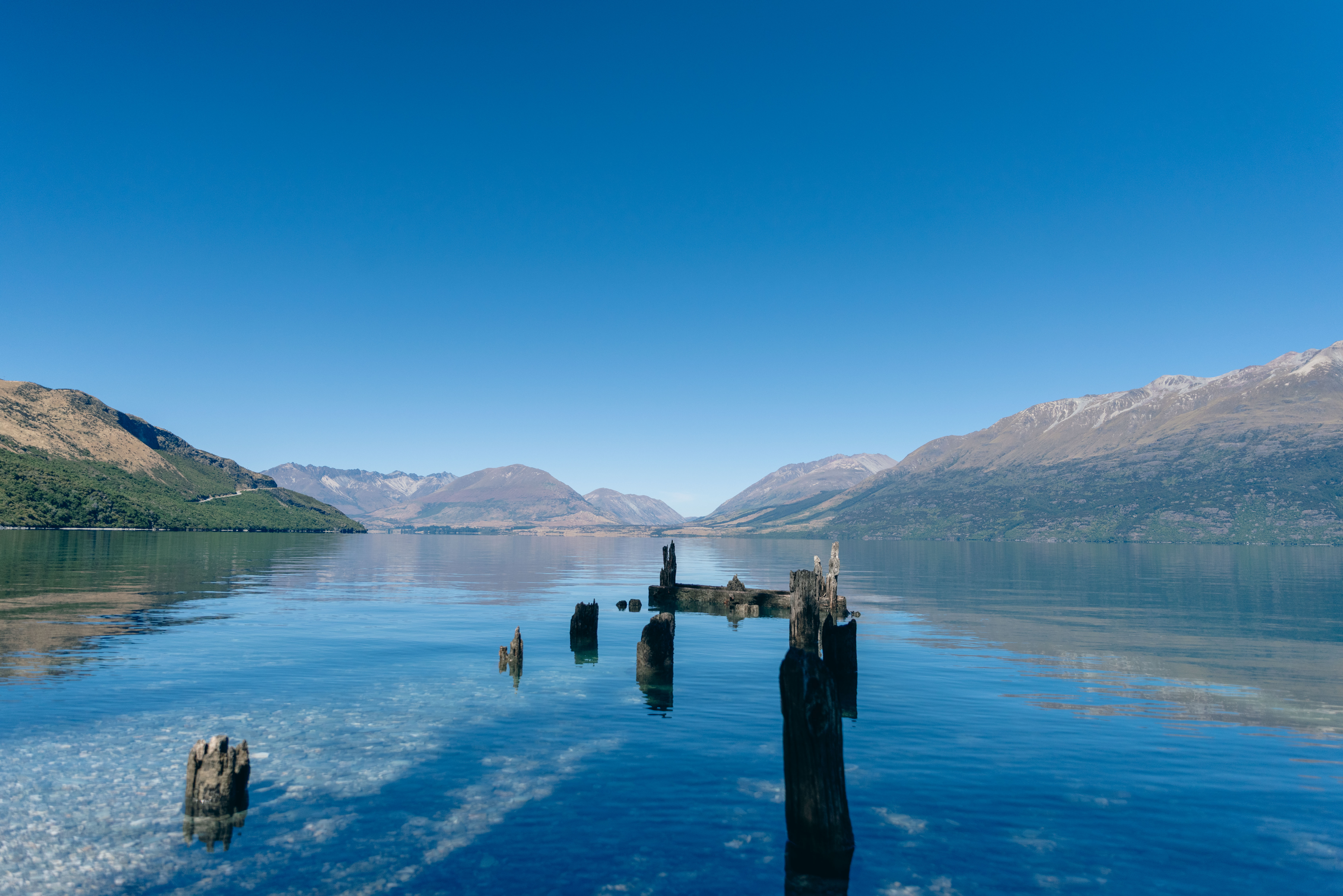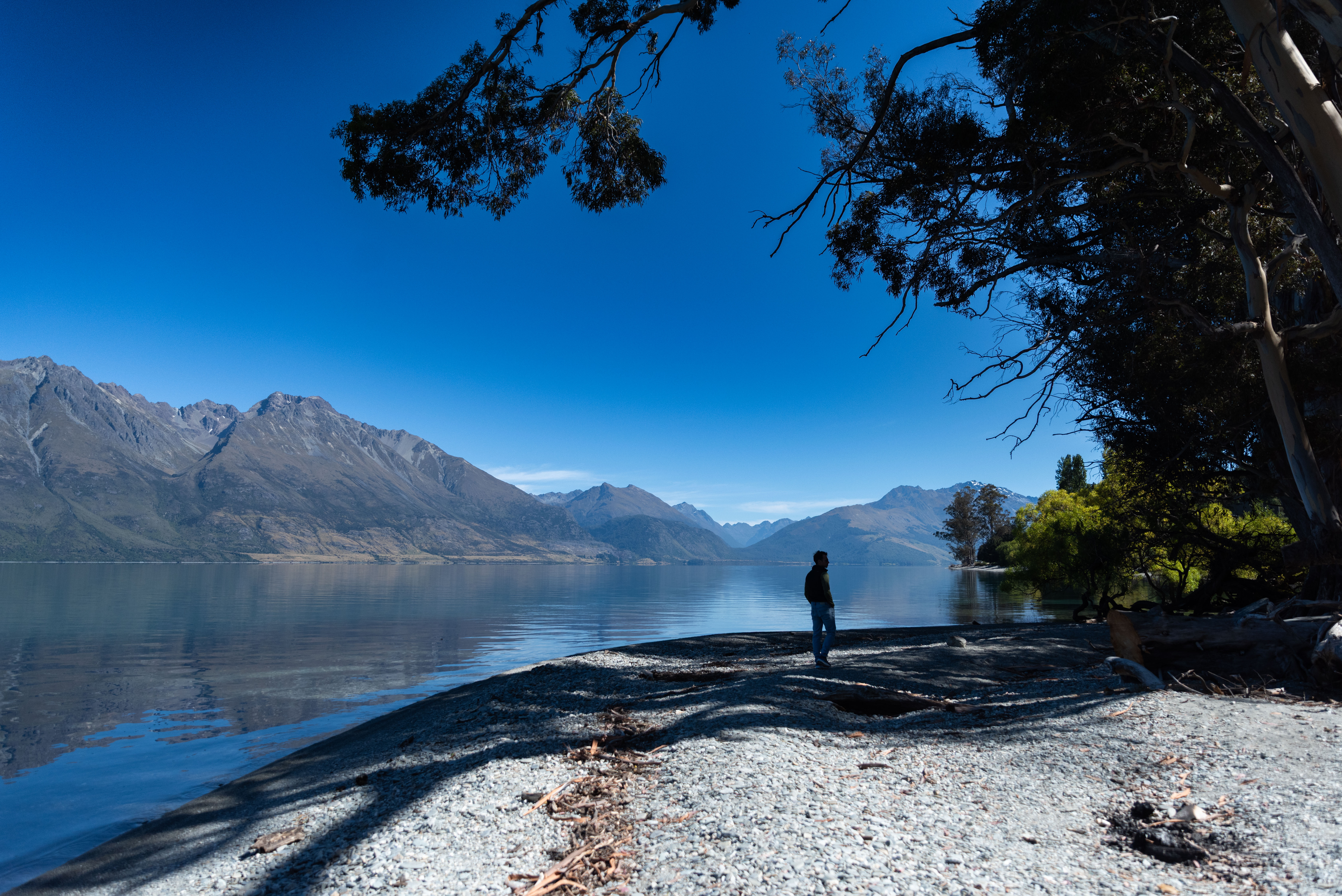 Il giorno dopo guidiamo verso Glenorchy. È una delle strade più belle che abbiamo fatto in tutto il viaggio. L’acqua è blu, piatta, piena di riflessi così precisi da sembrare disegnati. Avrei voluto fermarmi ovunque.
