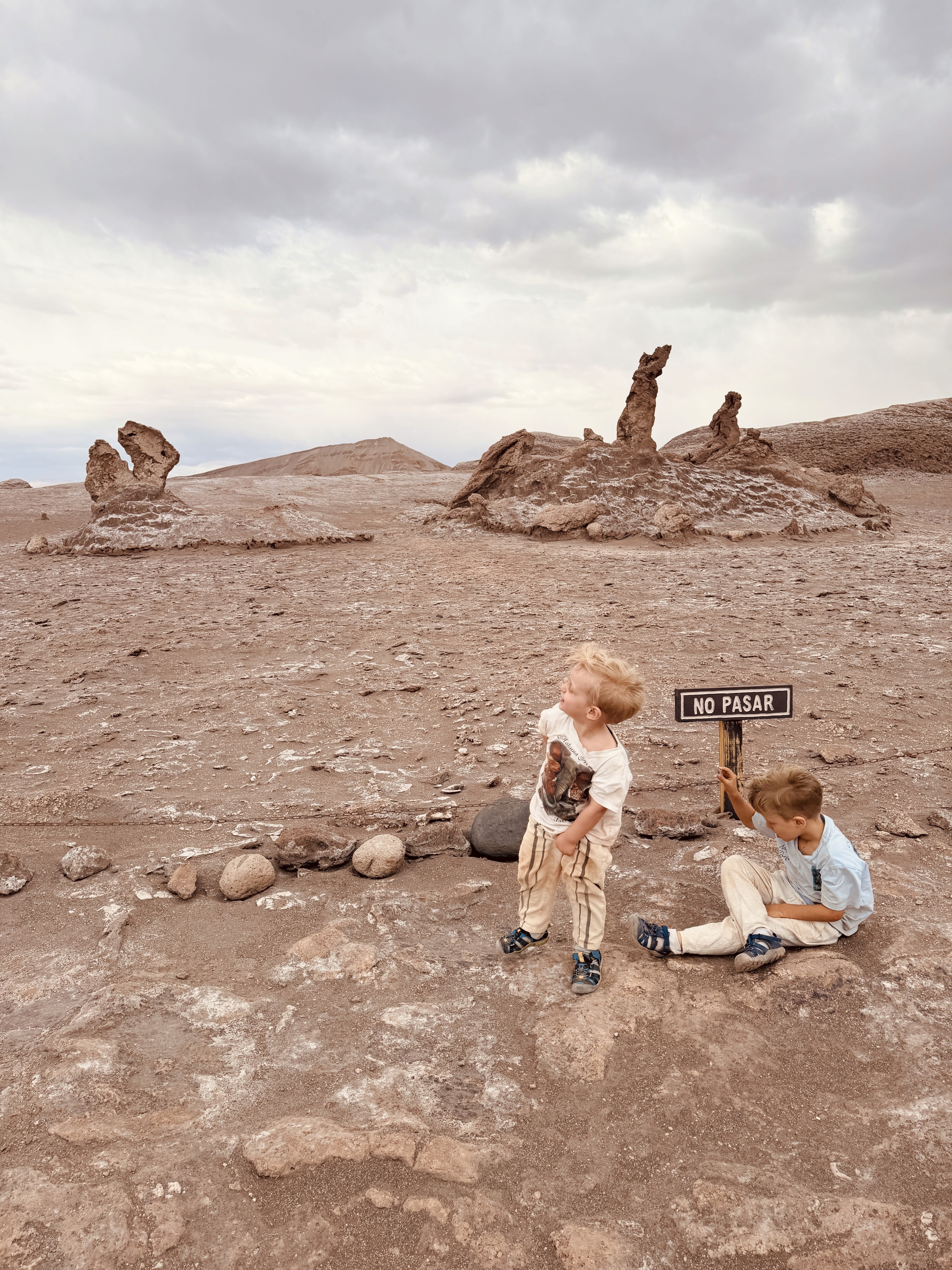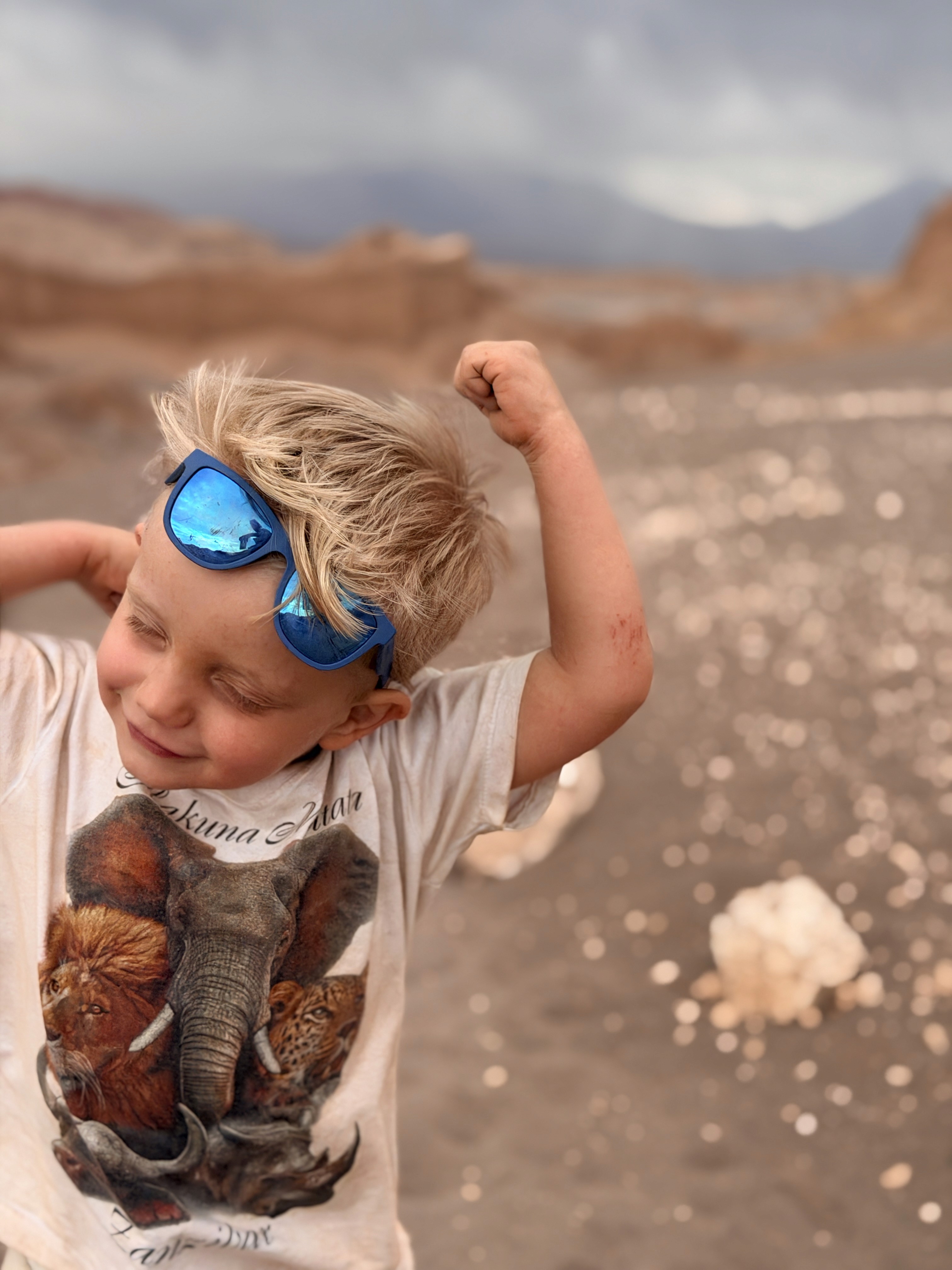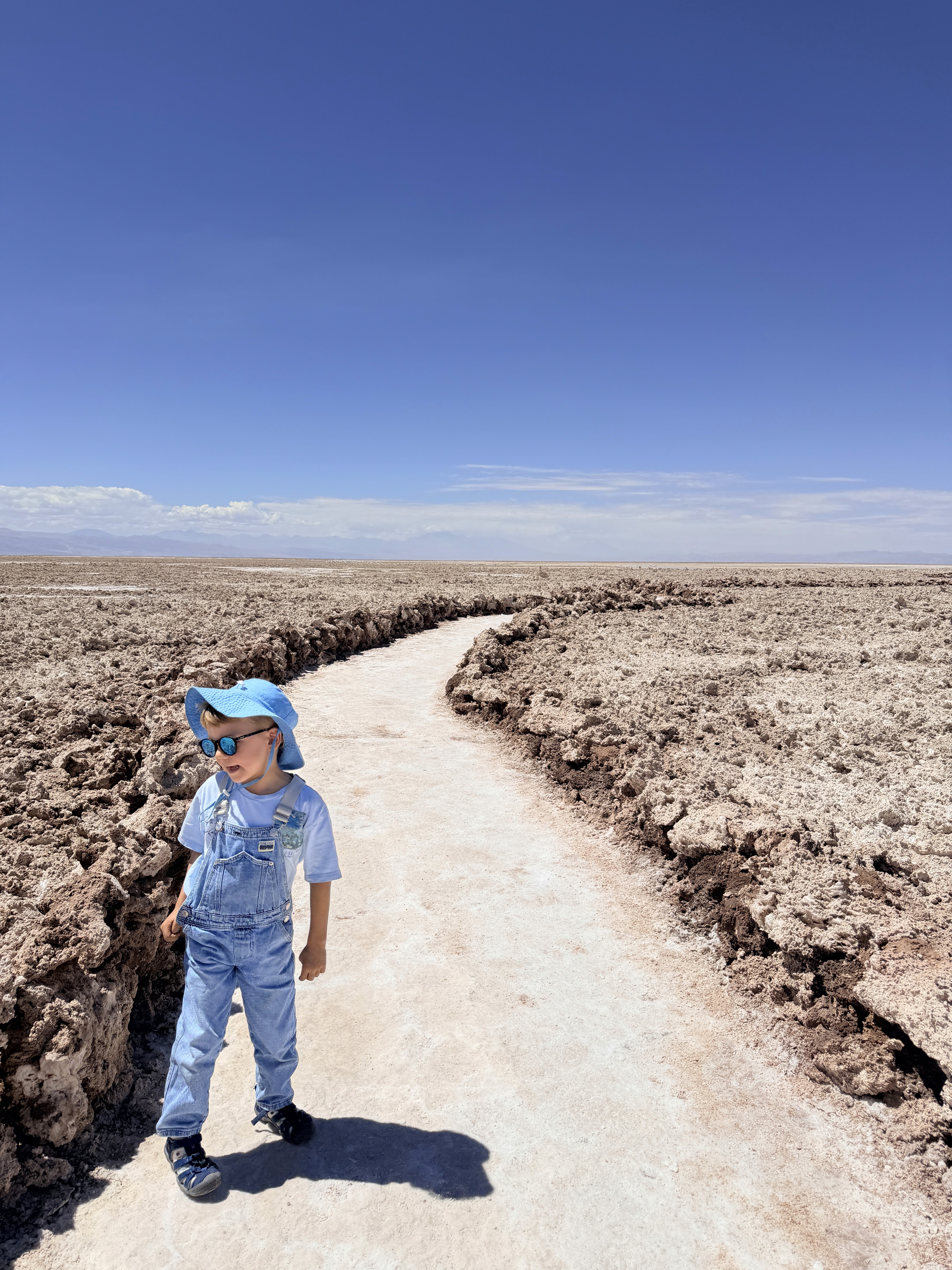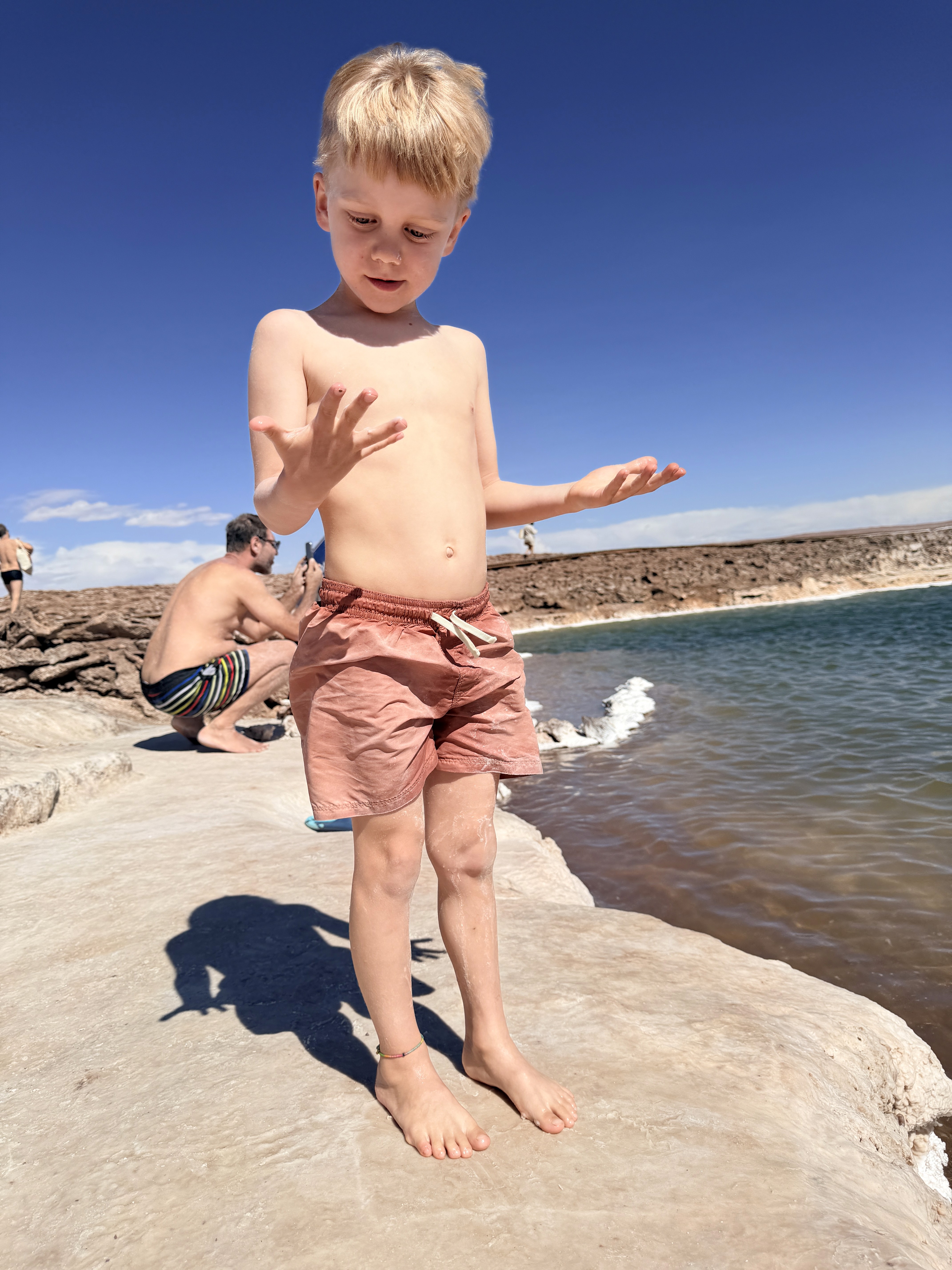 L’acqua è così salina che ti morde la pelle. I bimbi potevano fare solo un tuffo veloce. Axel si è anche toccato gli occhi e gli bruciavano tantissimo. Il vento era fortissimo e la passeggiata nel deserto sotto il sole cocente, con la sabbia negli occhi, è stata lunga. Poi la coda per la doccia, i costumi rovinati dal sale… no grazie.