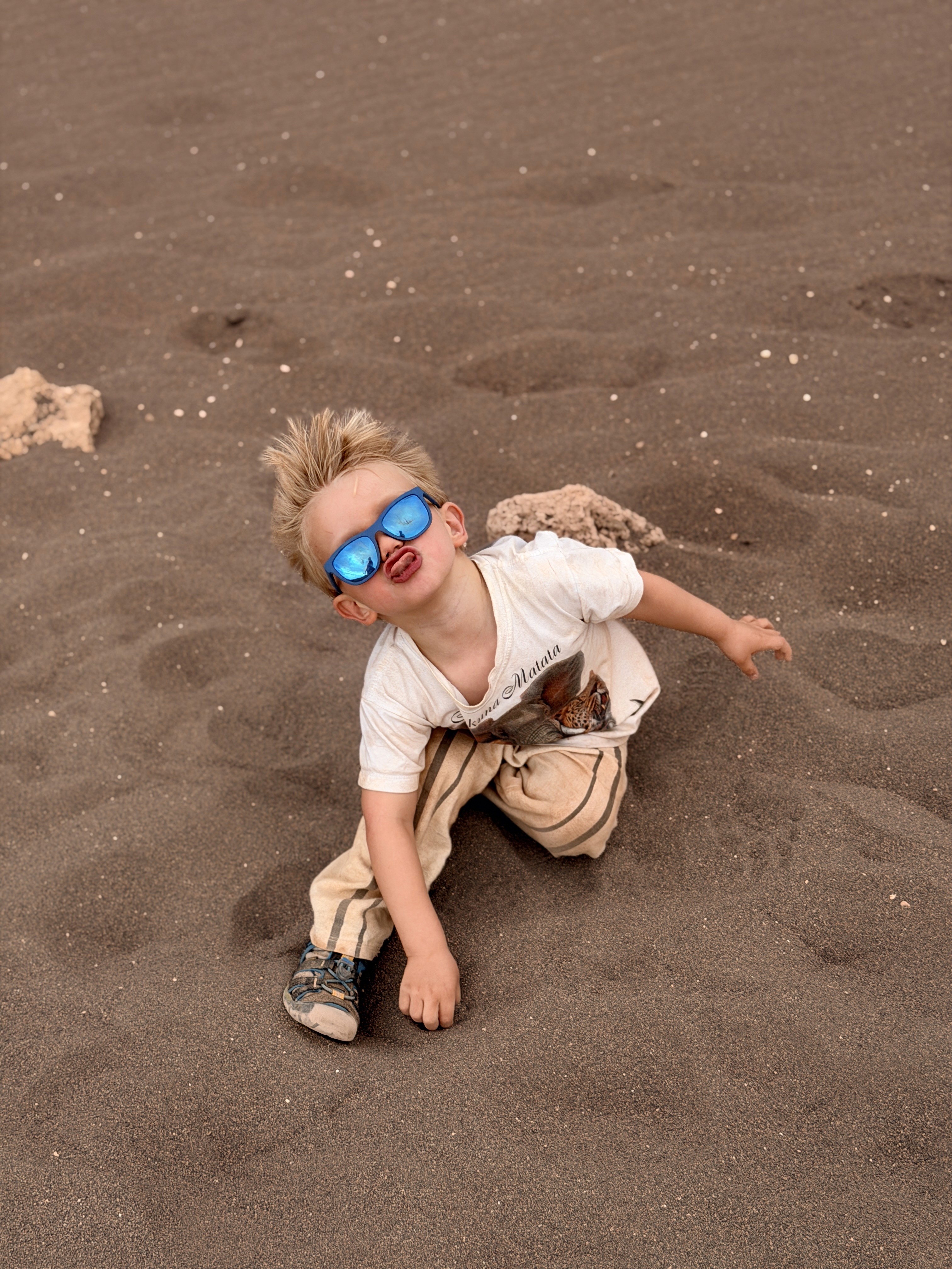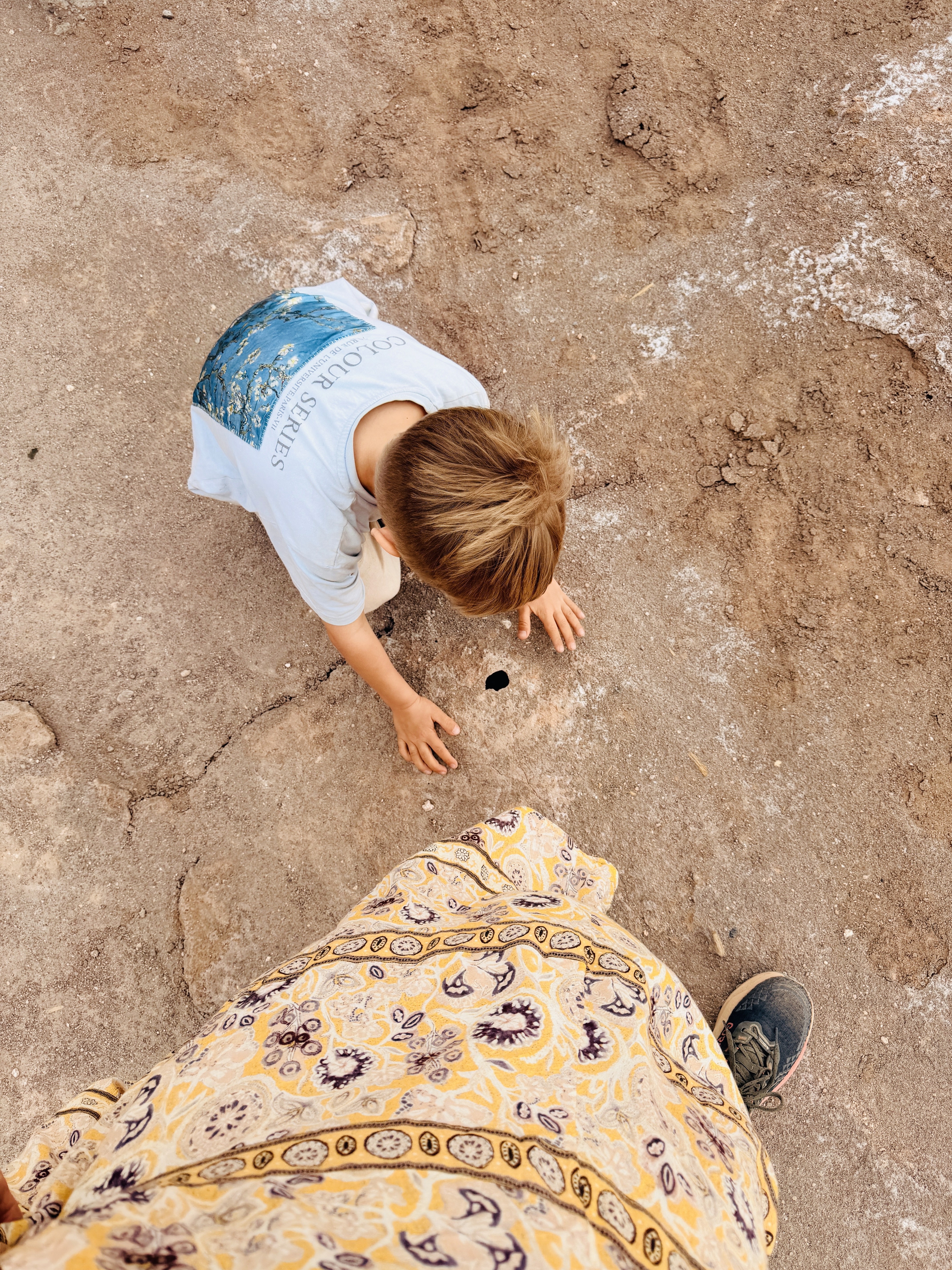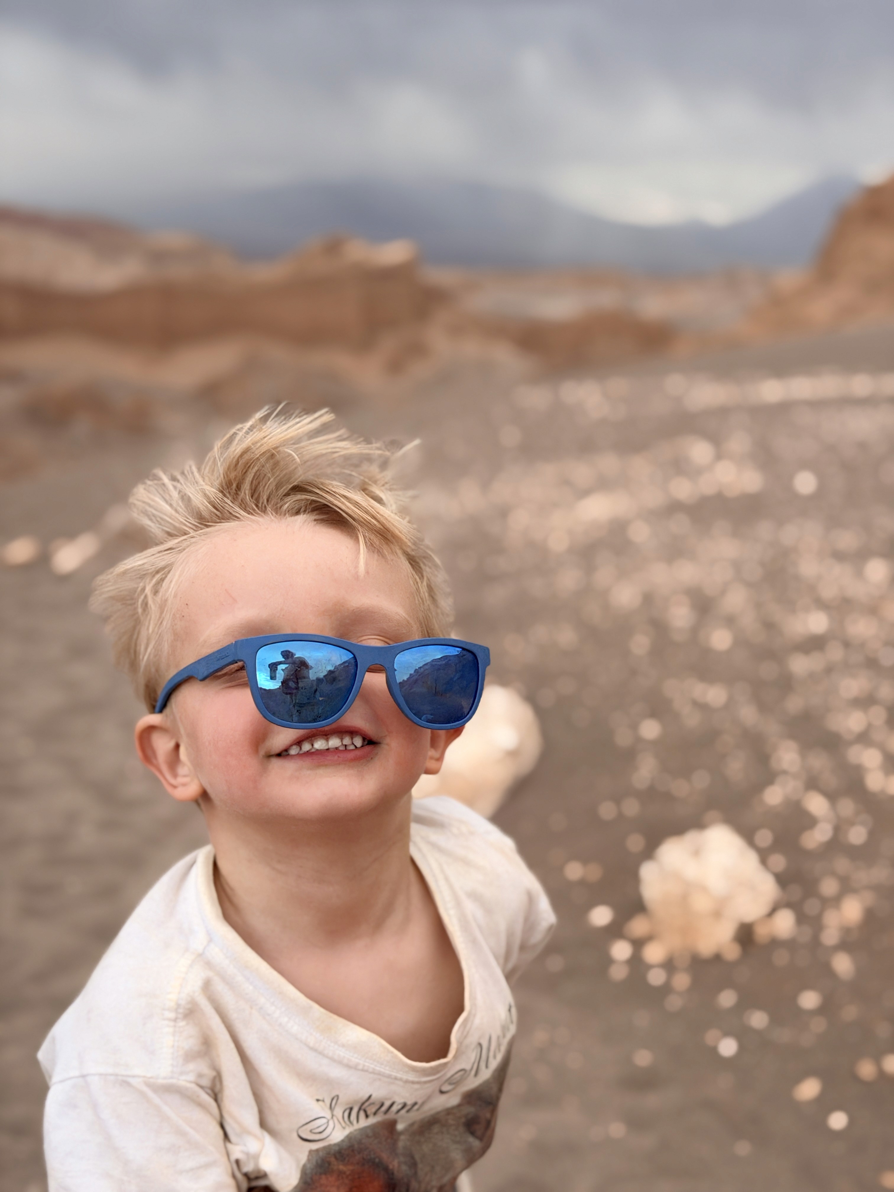 L’acqua è così salina che ti morde la pelle. I bimbi potevano fare solo un tuffo veloce. Axel si è anche toccato gli occhi e gli bruciavano tantissimo. Il vento era fortissimo e la passeggiata nel deserto sotto il sole cocente, con la sabbia negli occhi, è stata lunga. Poi la coda per la doccia, i costumi rovinati dal sale… no grazie.