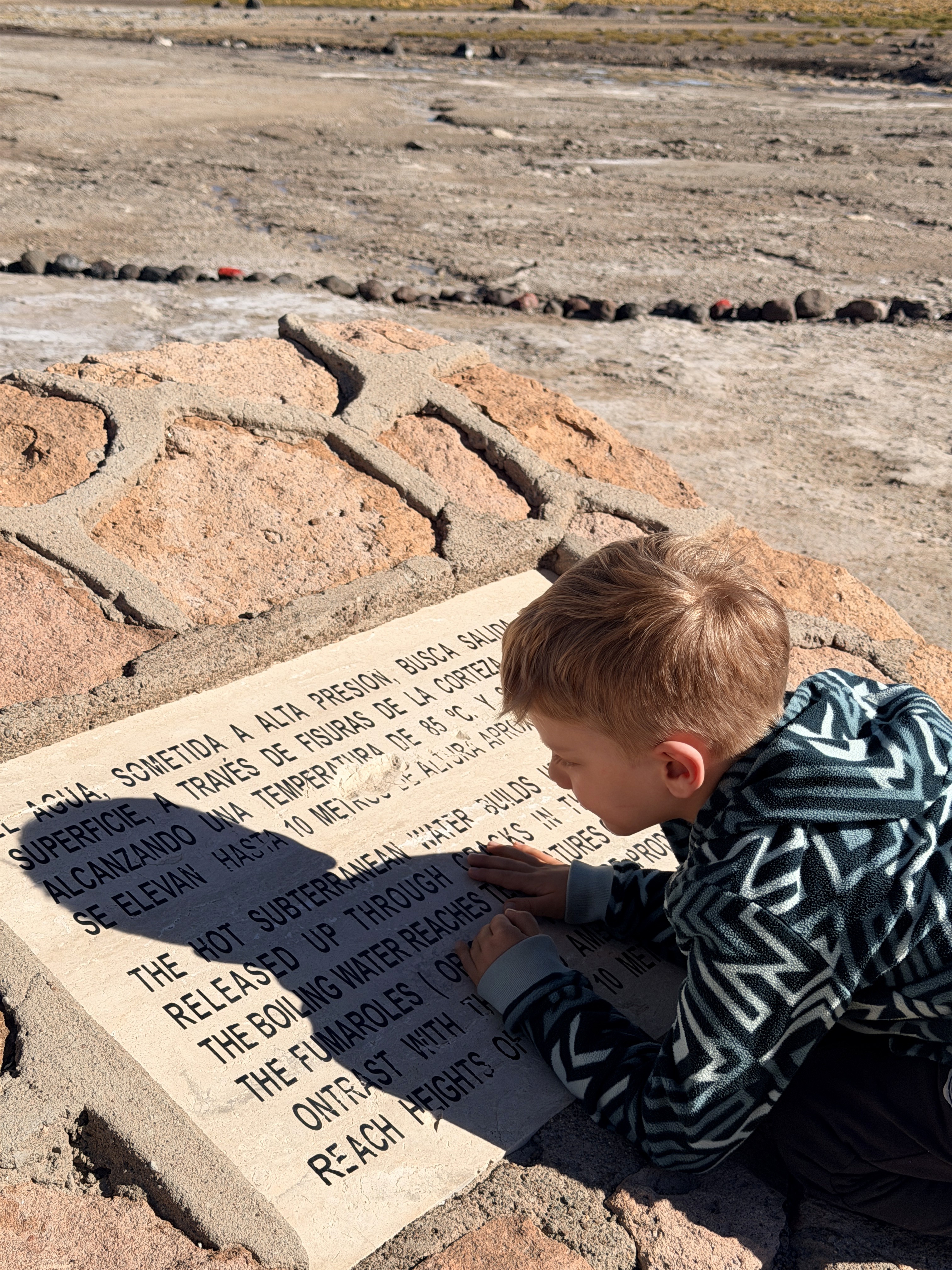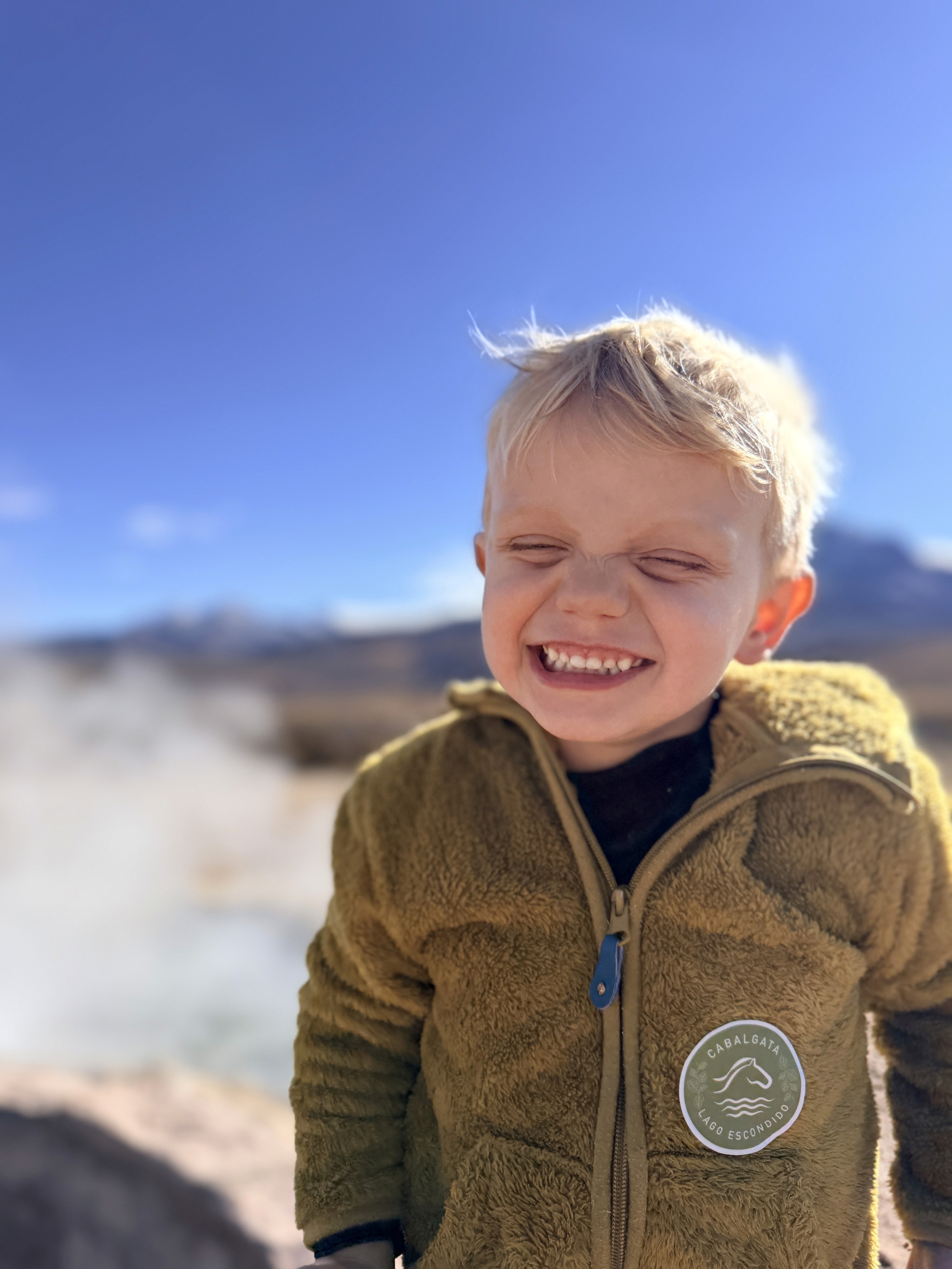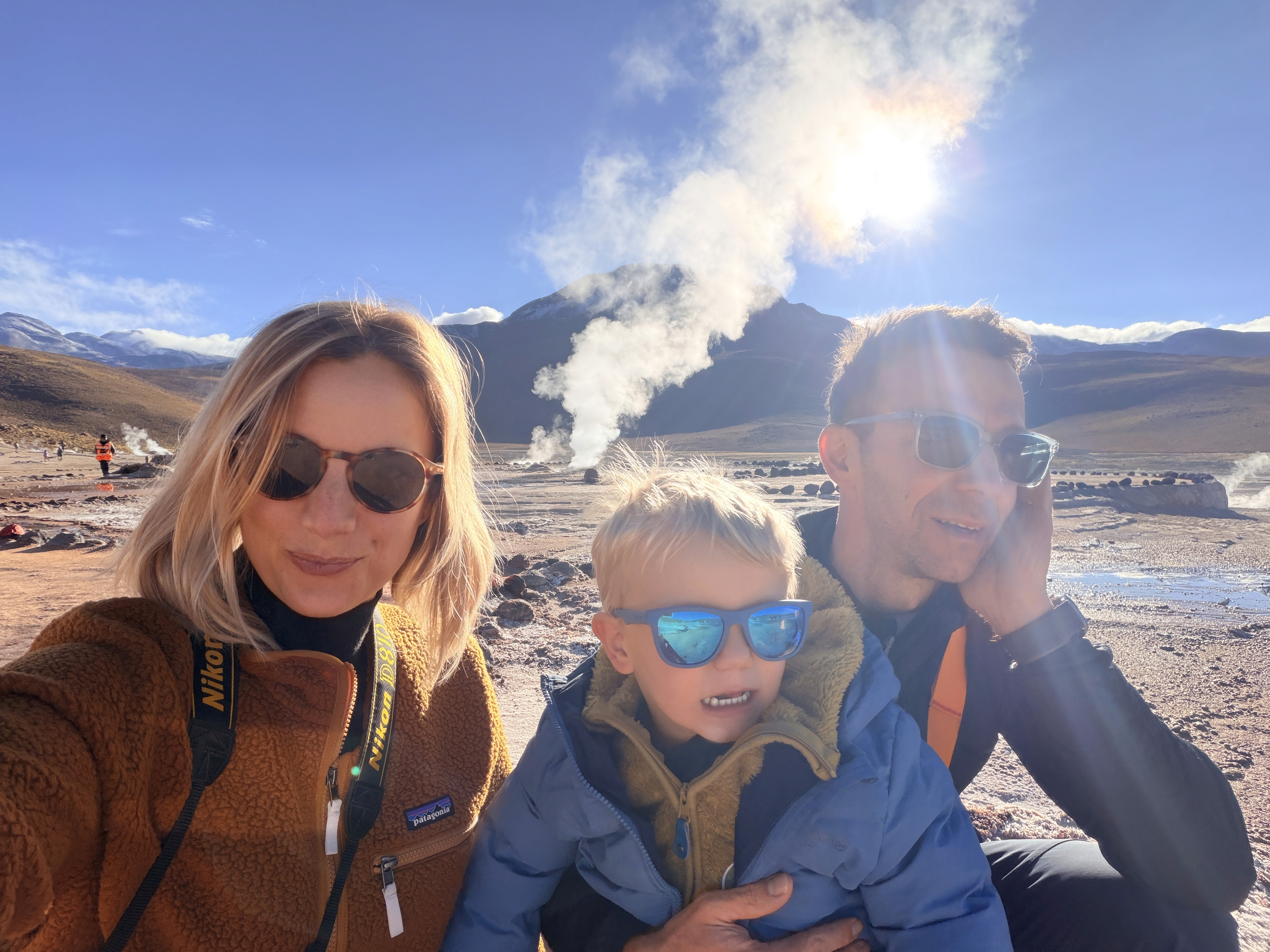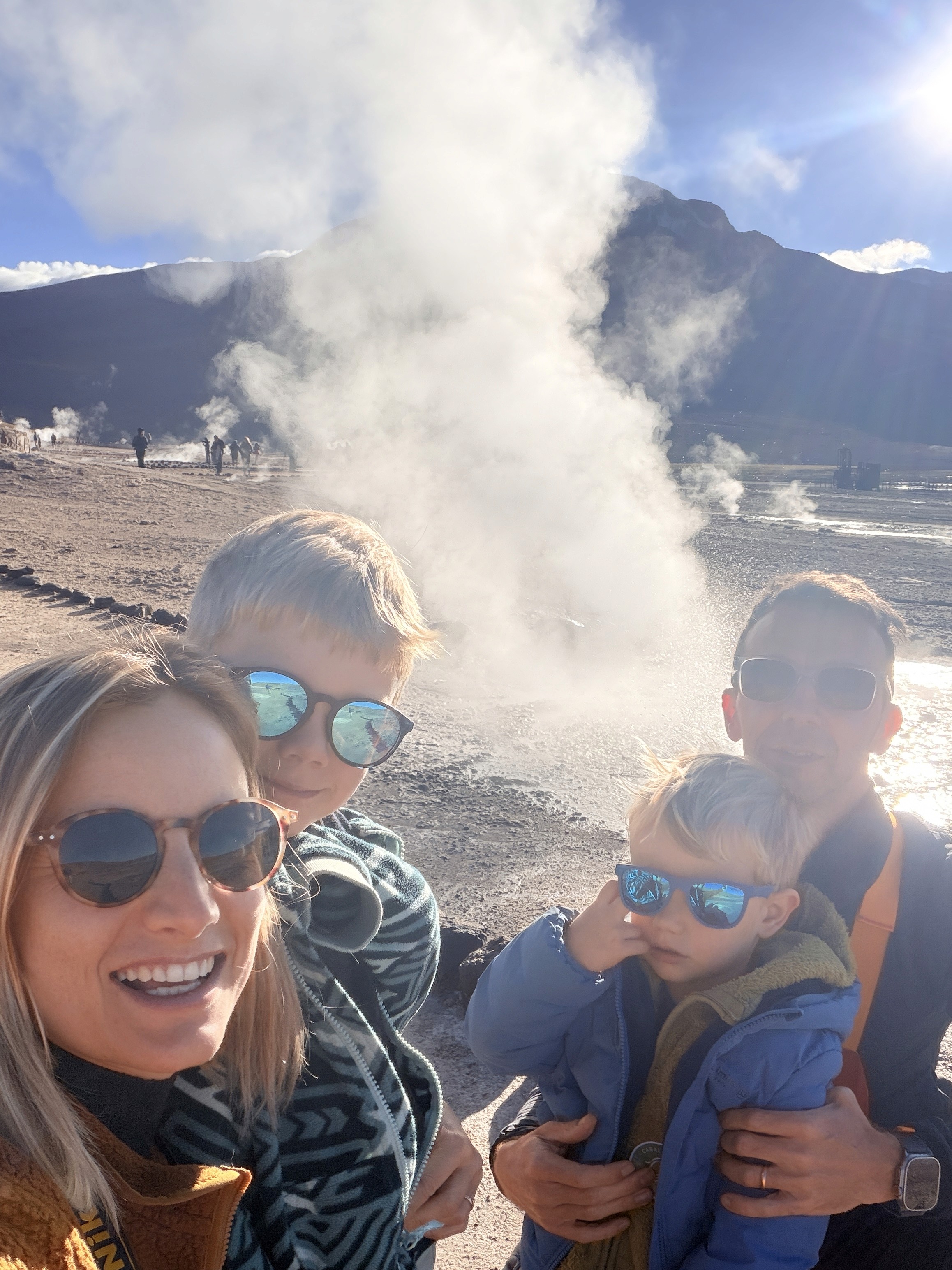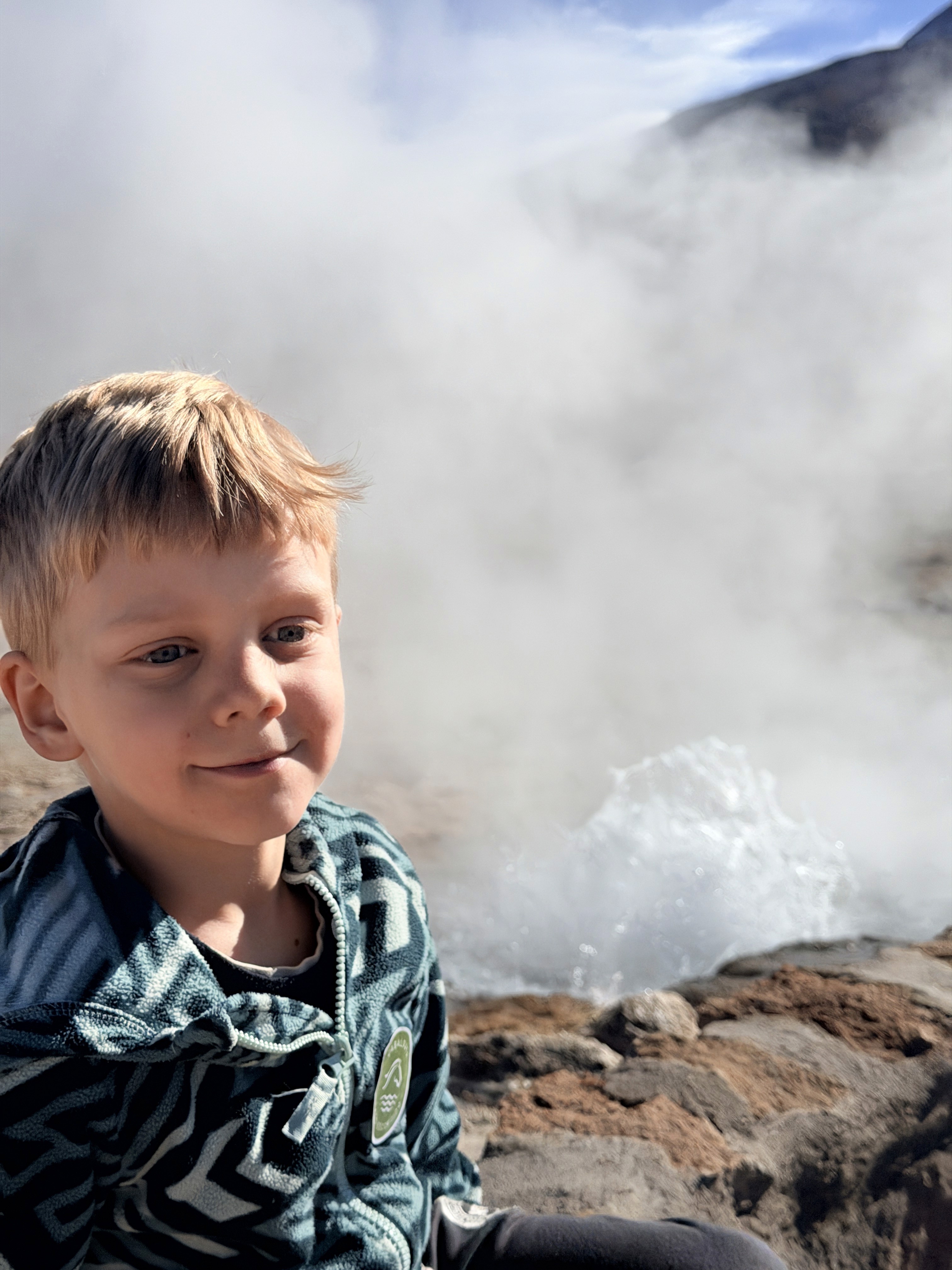 Pochi minuti dopo arriviamo e vediamo il vapore uscire dalla montagna. Arrivati su, sorprendentemente non patiamo troppo l’altitudine dei 4.300 metri. Ari però non vuole camminare, vuole solo stare in braccio.