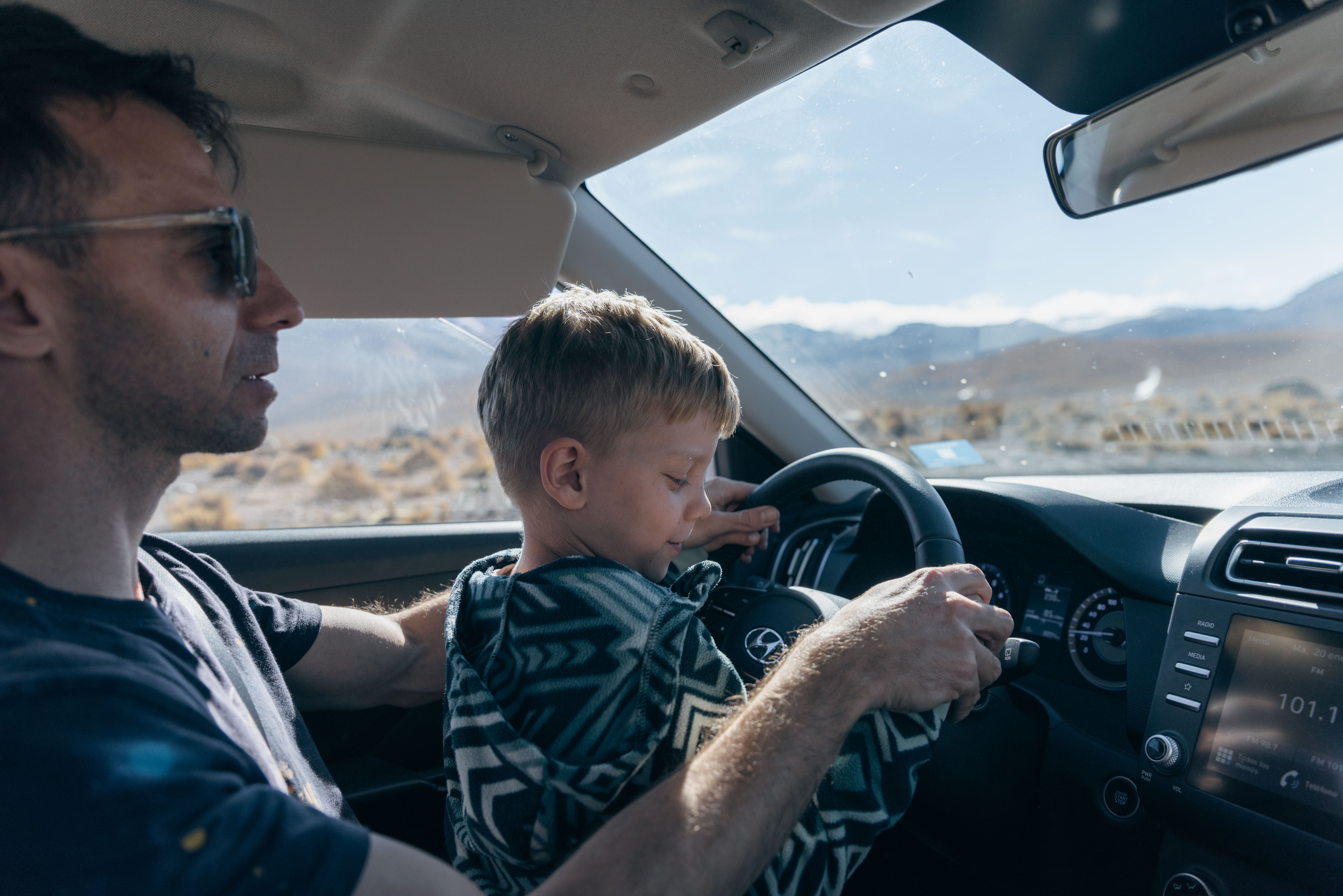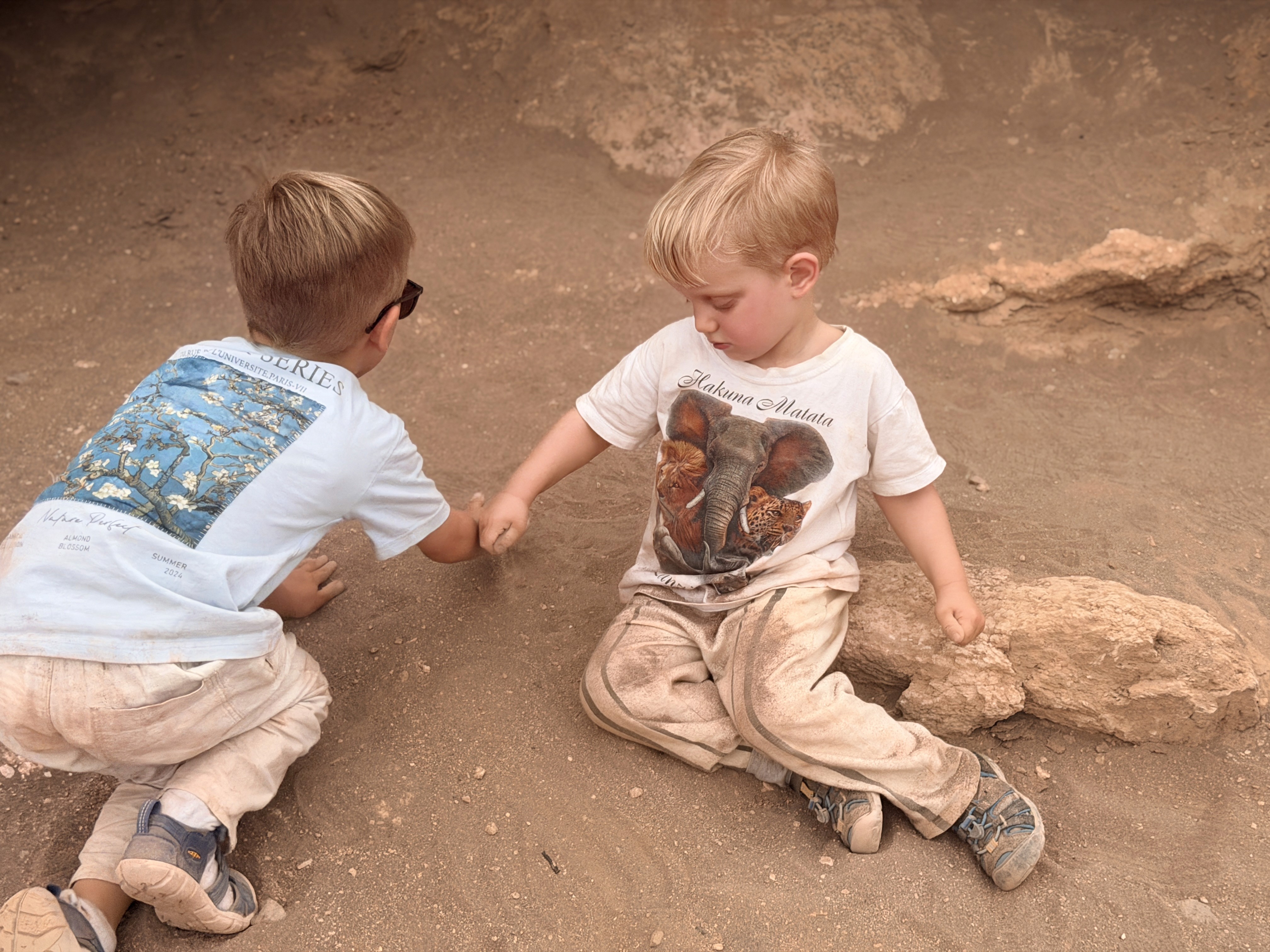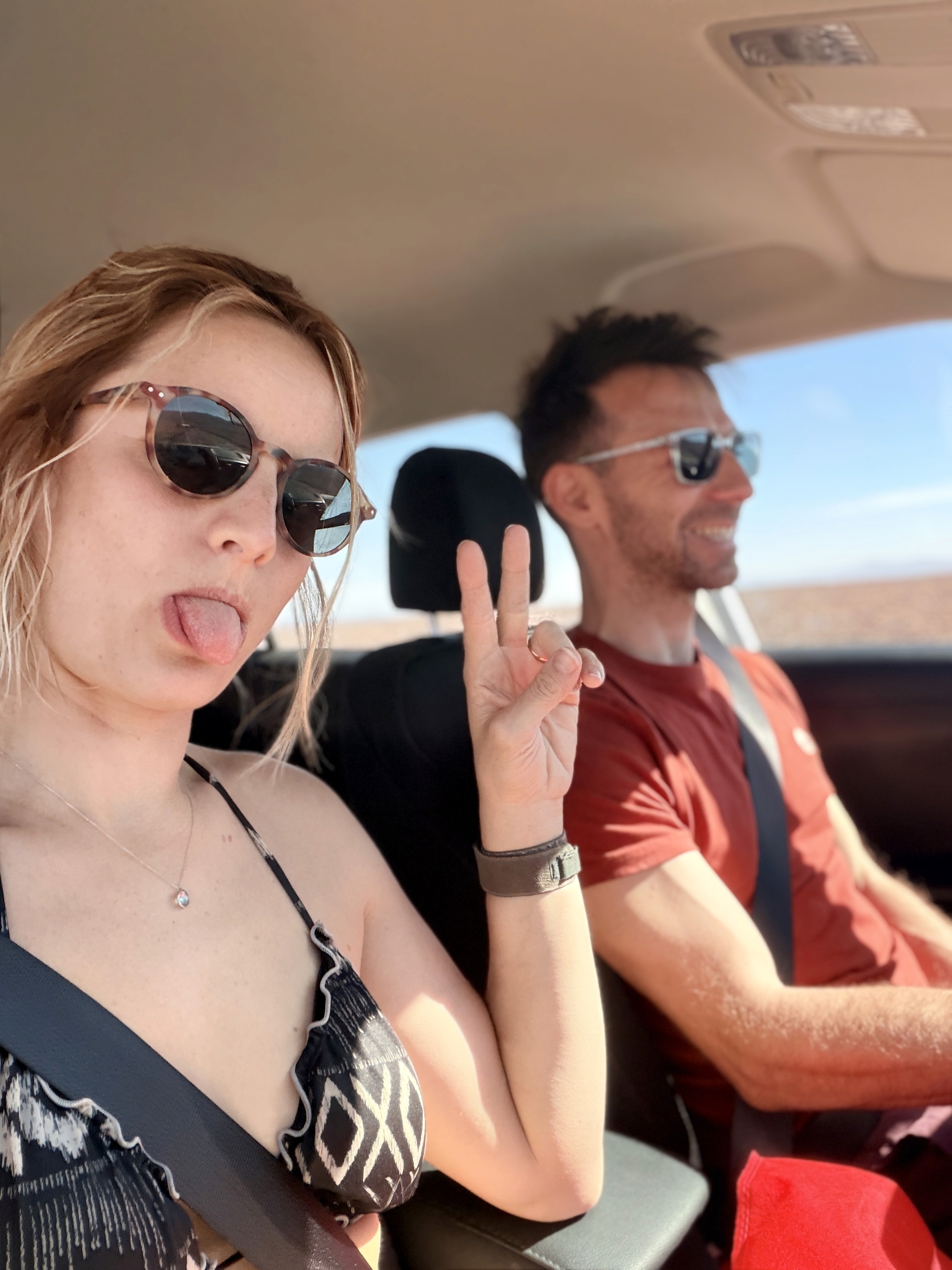 Dopo una lunga mattinata con attività scelte dai bimbi – quindi colazione, piscina e cartoni – siamo partiti verso le 3 del pomeriggio per il deserto. In macchina, come al solito: urla, anarchia, stanchezza, giochi di lotta, pesca con le cinture. Arriviamo già un po’ stanchi, ma pieni di aspettative.
