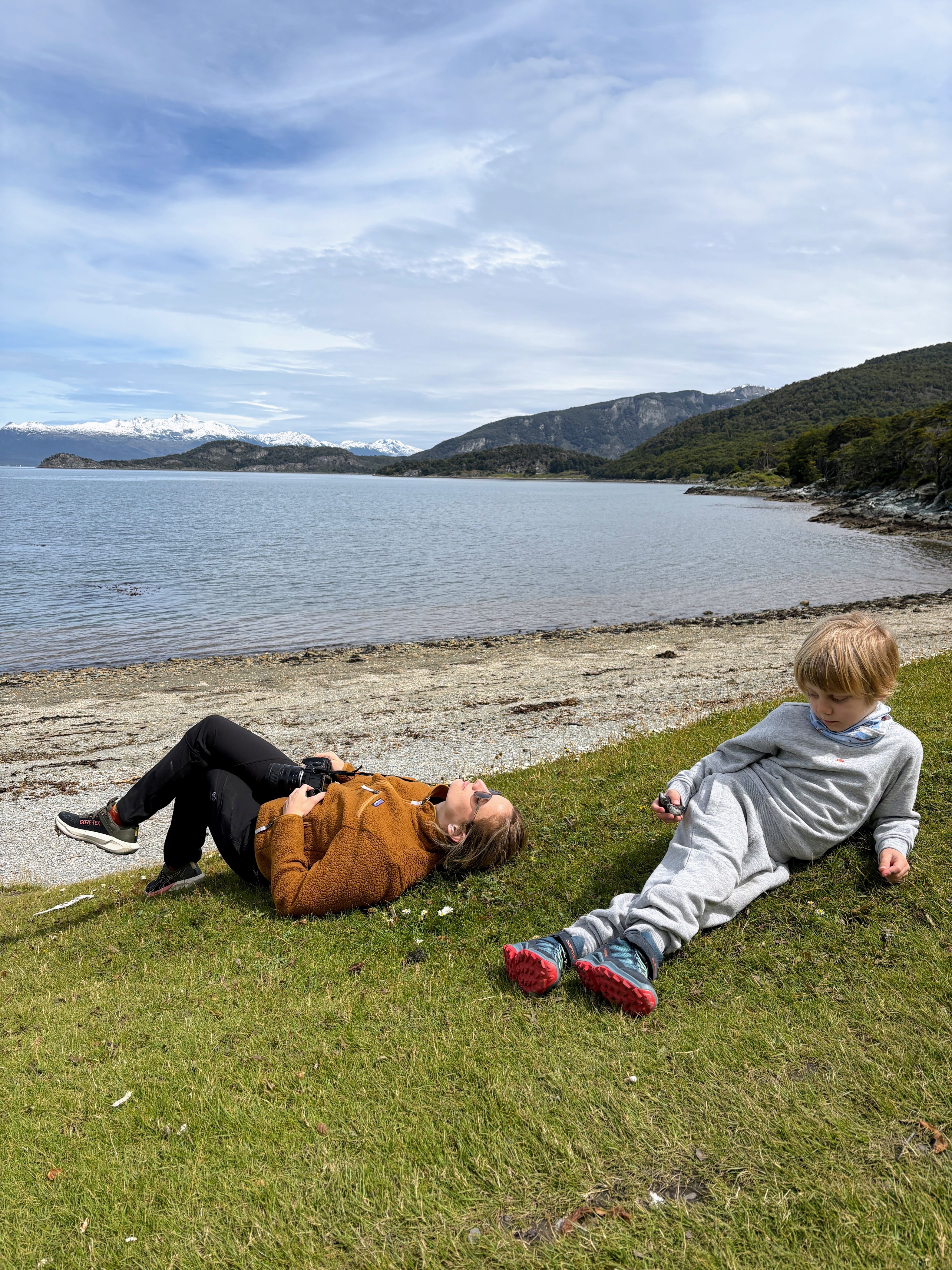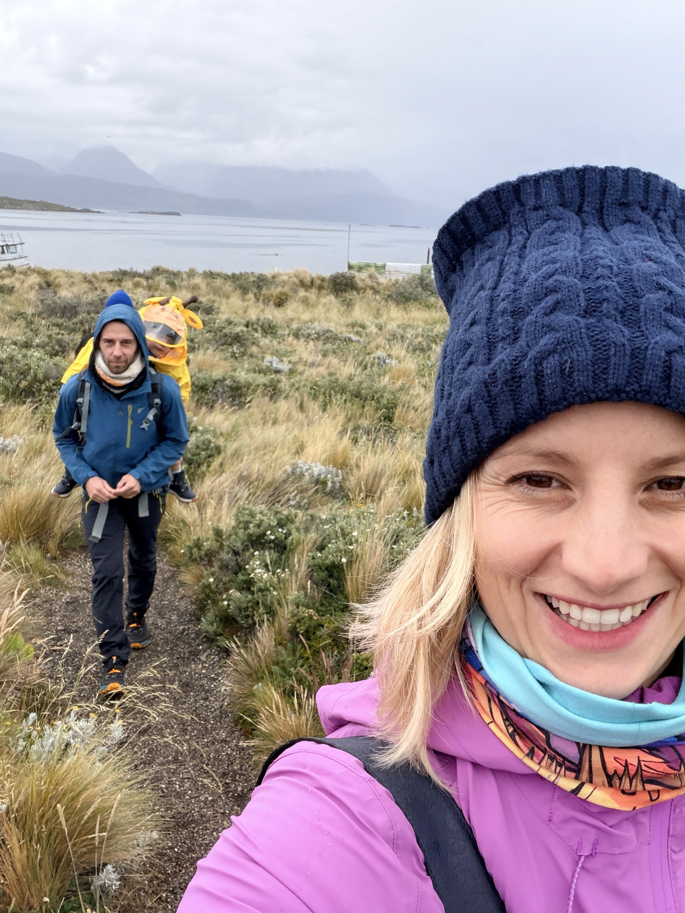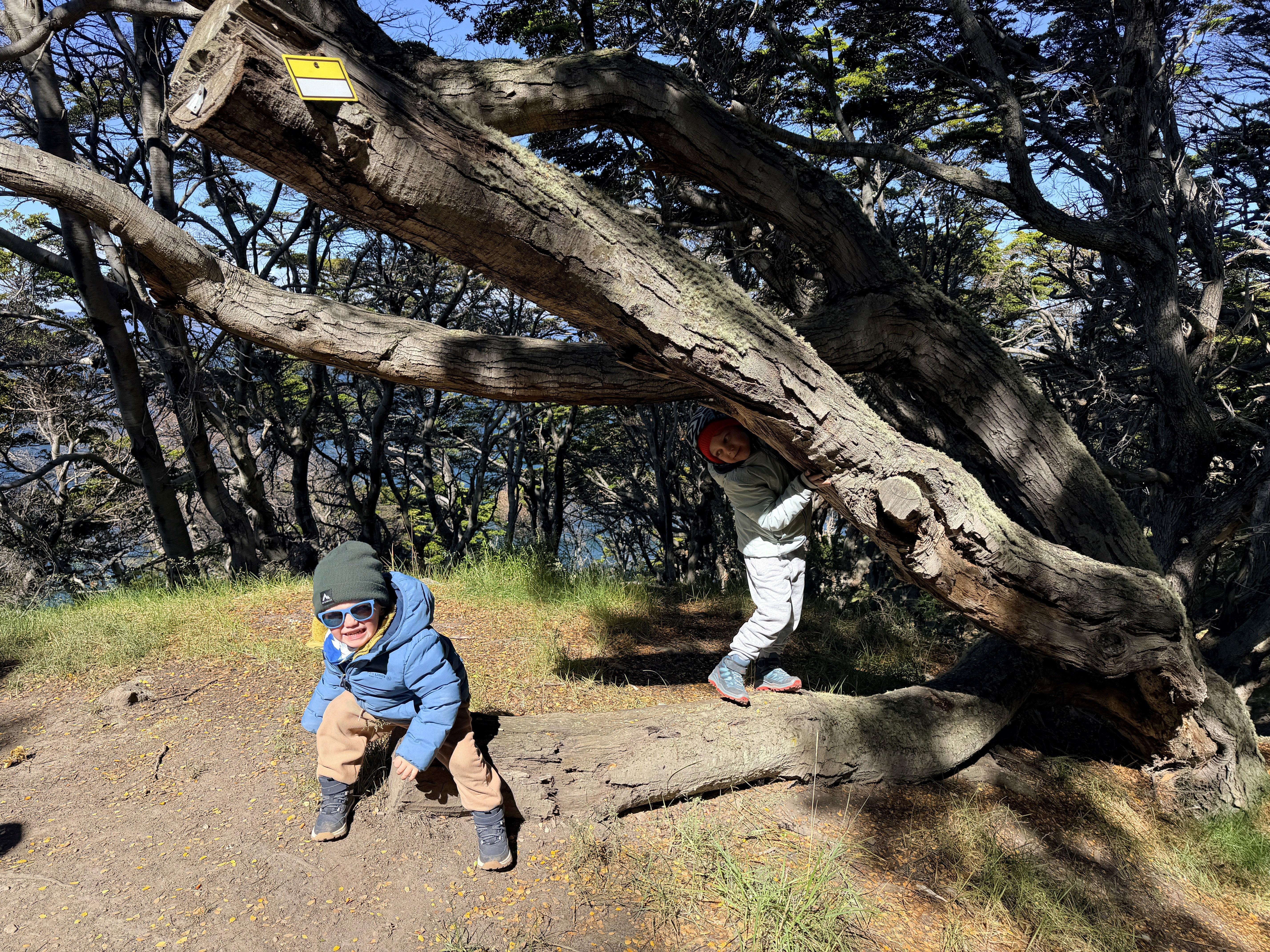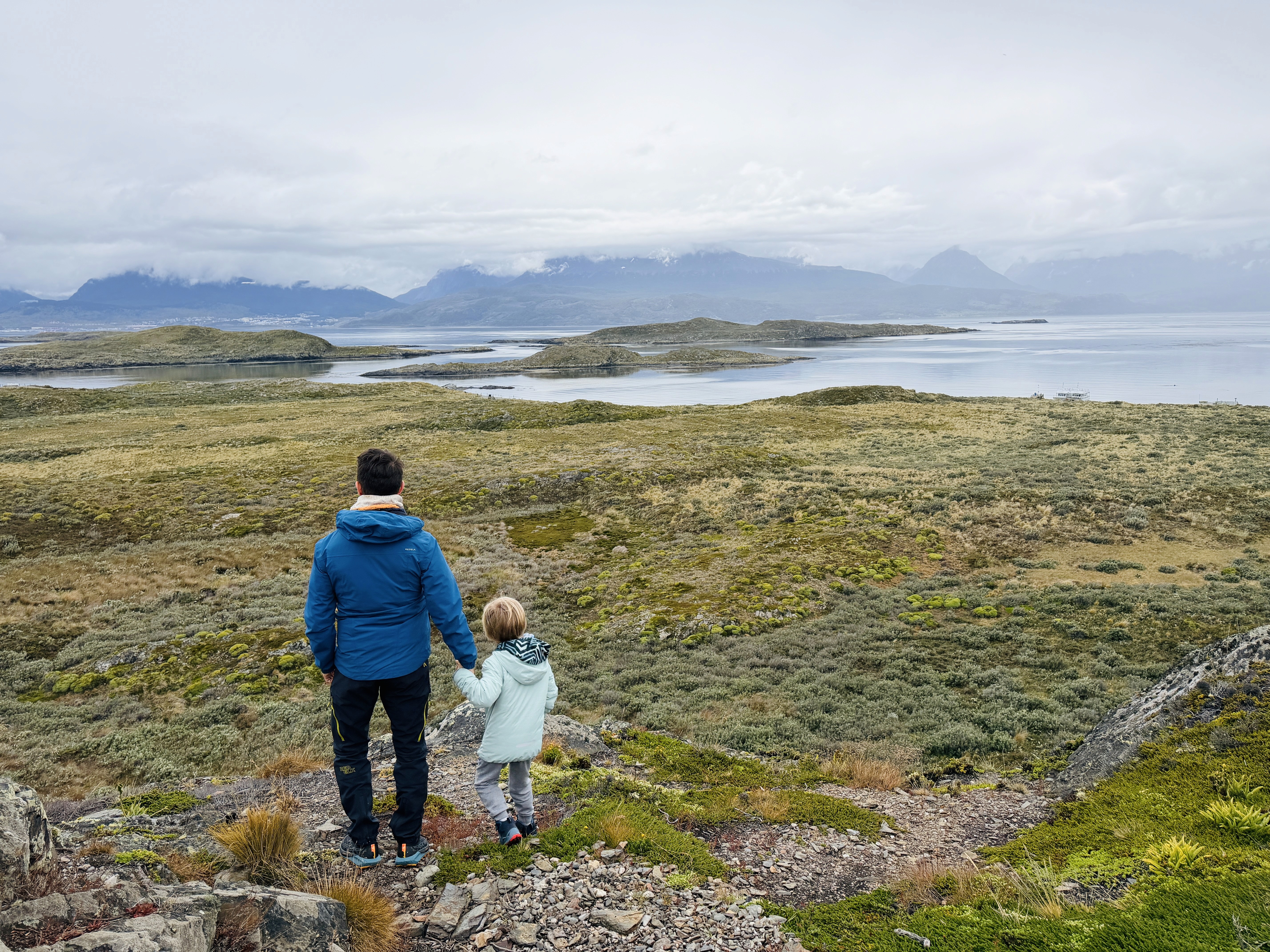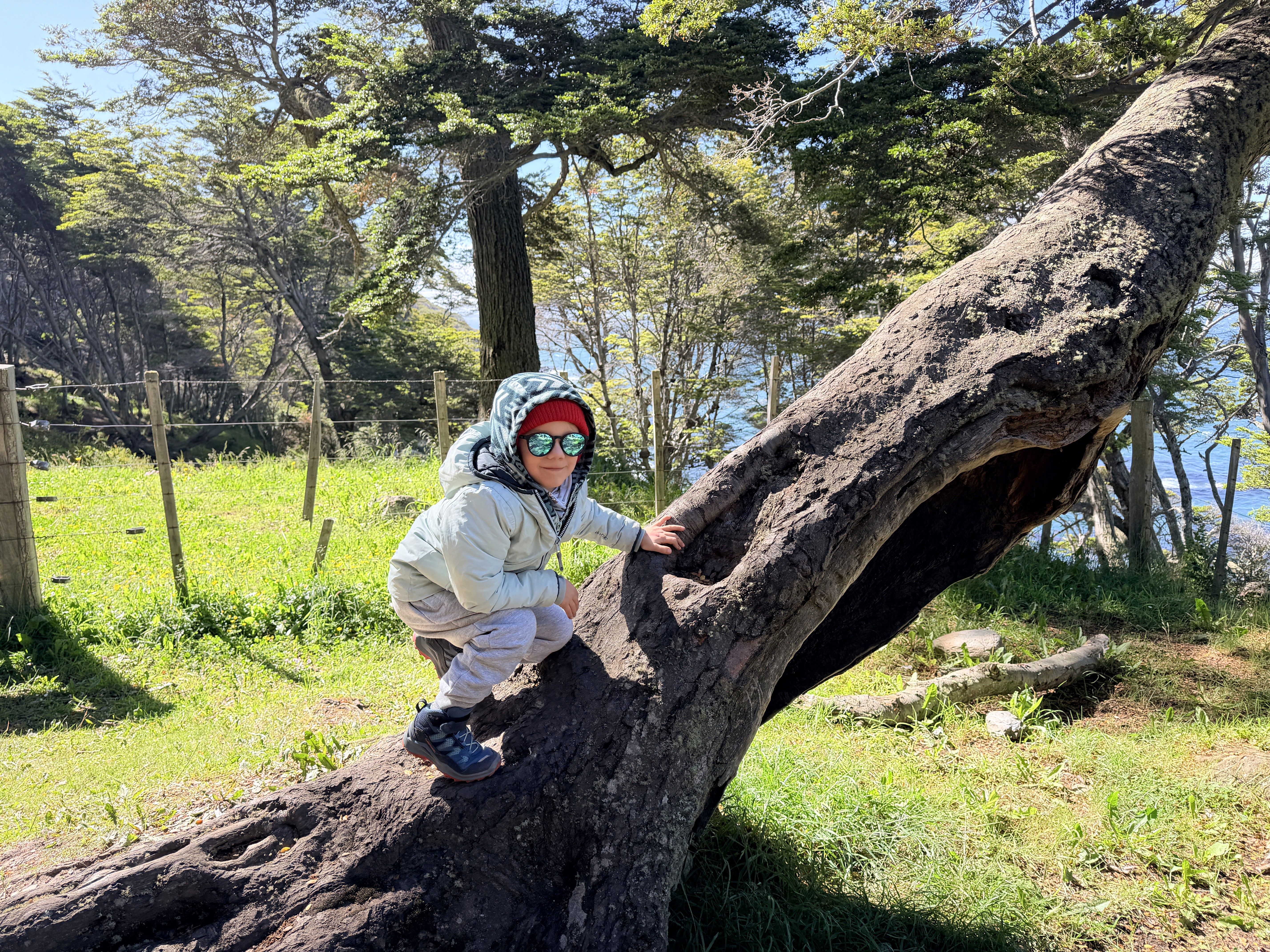 Prima dei pinguini avevamo fatto una piccola hike all’Estancia Túnel. Scelta quasi obbligata: il vento soffiava a 43 km/h e il ghiacciaio non era un’opzione. Circa 4 km. Axel ha corso tutto il tempo. Dopo la foresta, si usciva su un altopiano con vista mare mozzafiato. Ari ha camminato molto da solo, poi lo abbiamo portato in spalla per accelerare. È stata, per me, la giornata più bella a Ushuaia. Nonostante il vento. Nonostante la stanchezza.