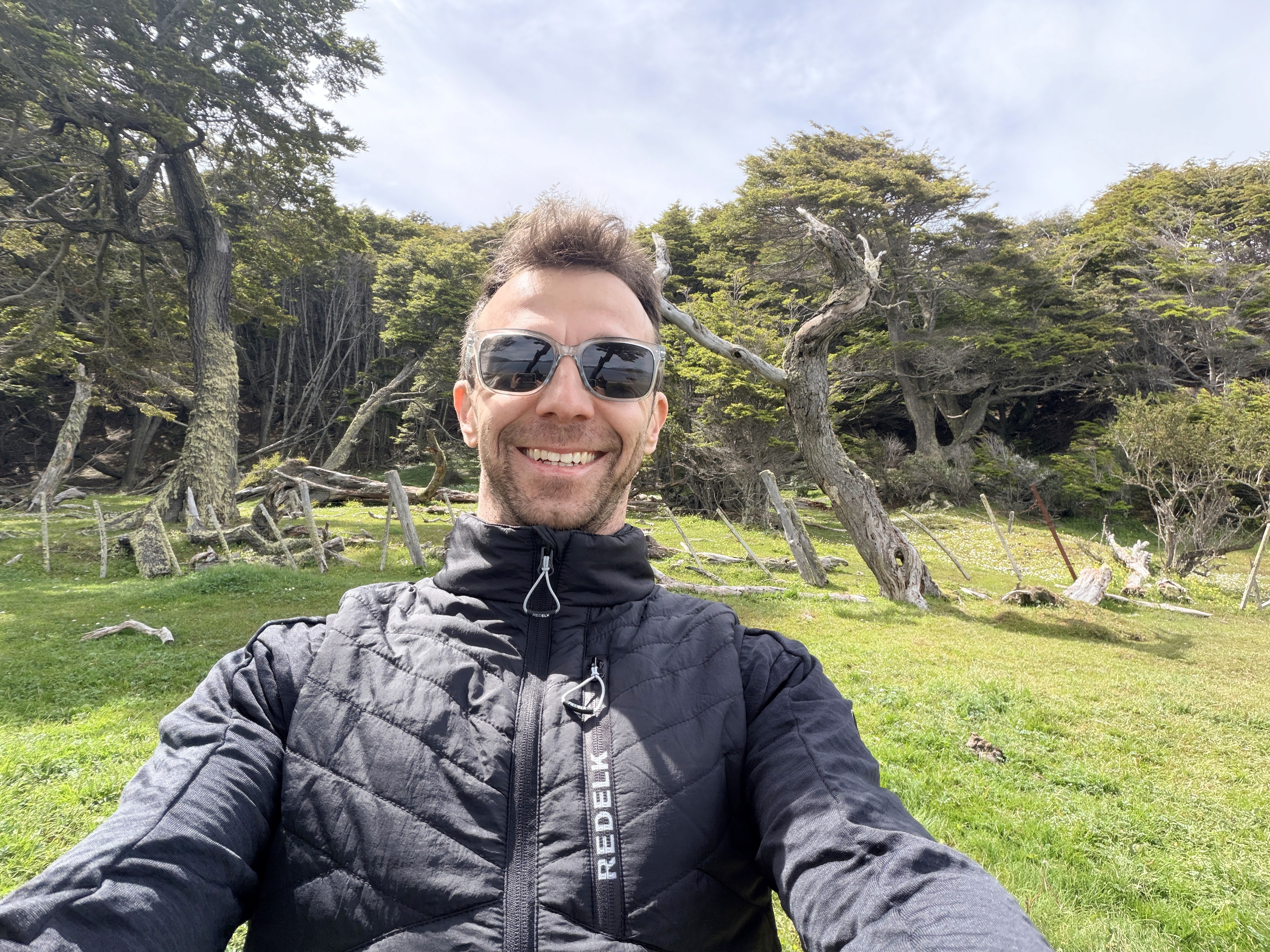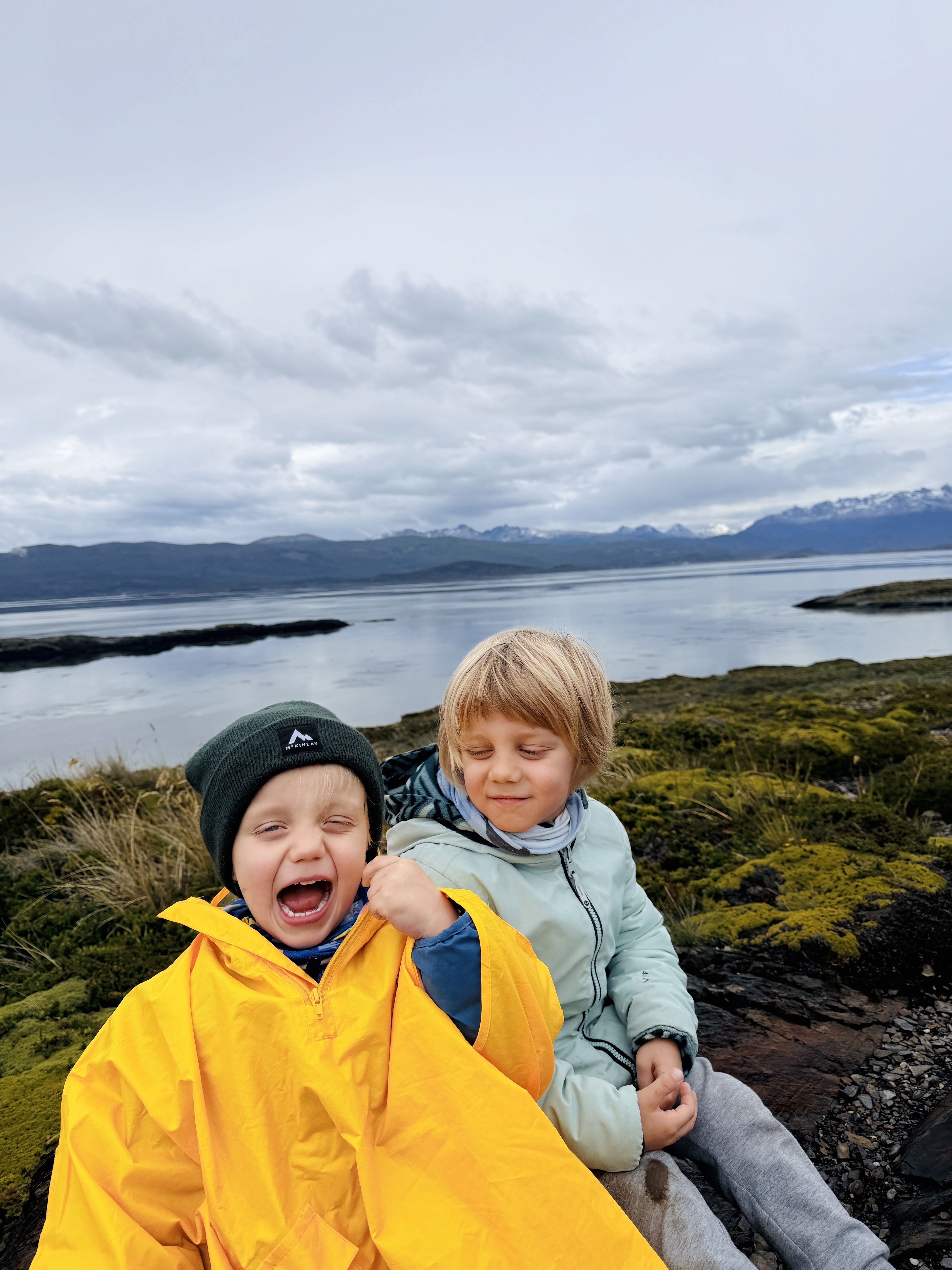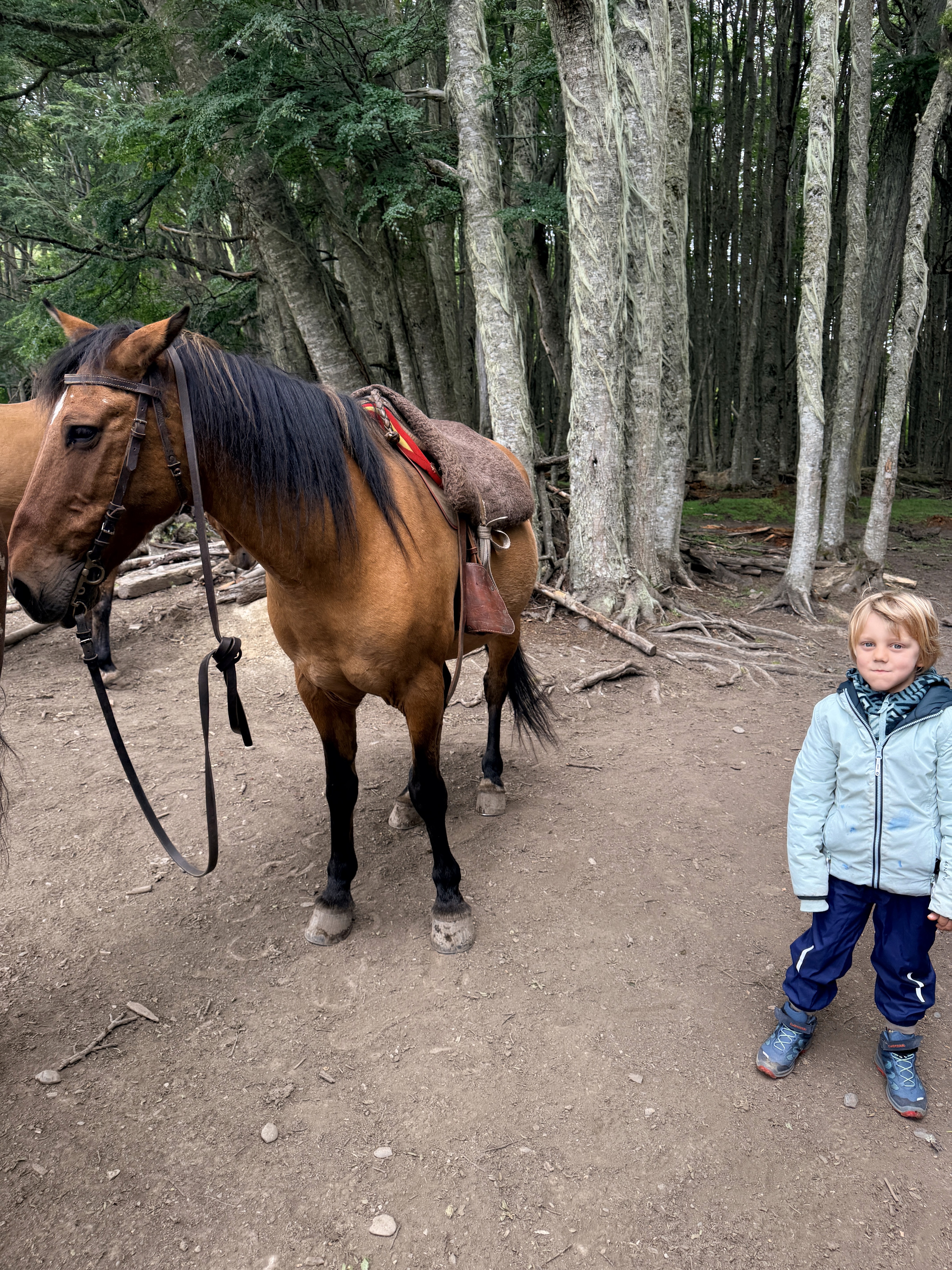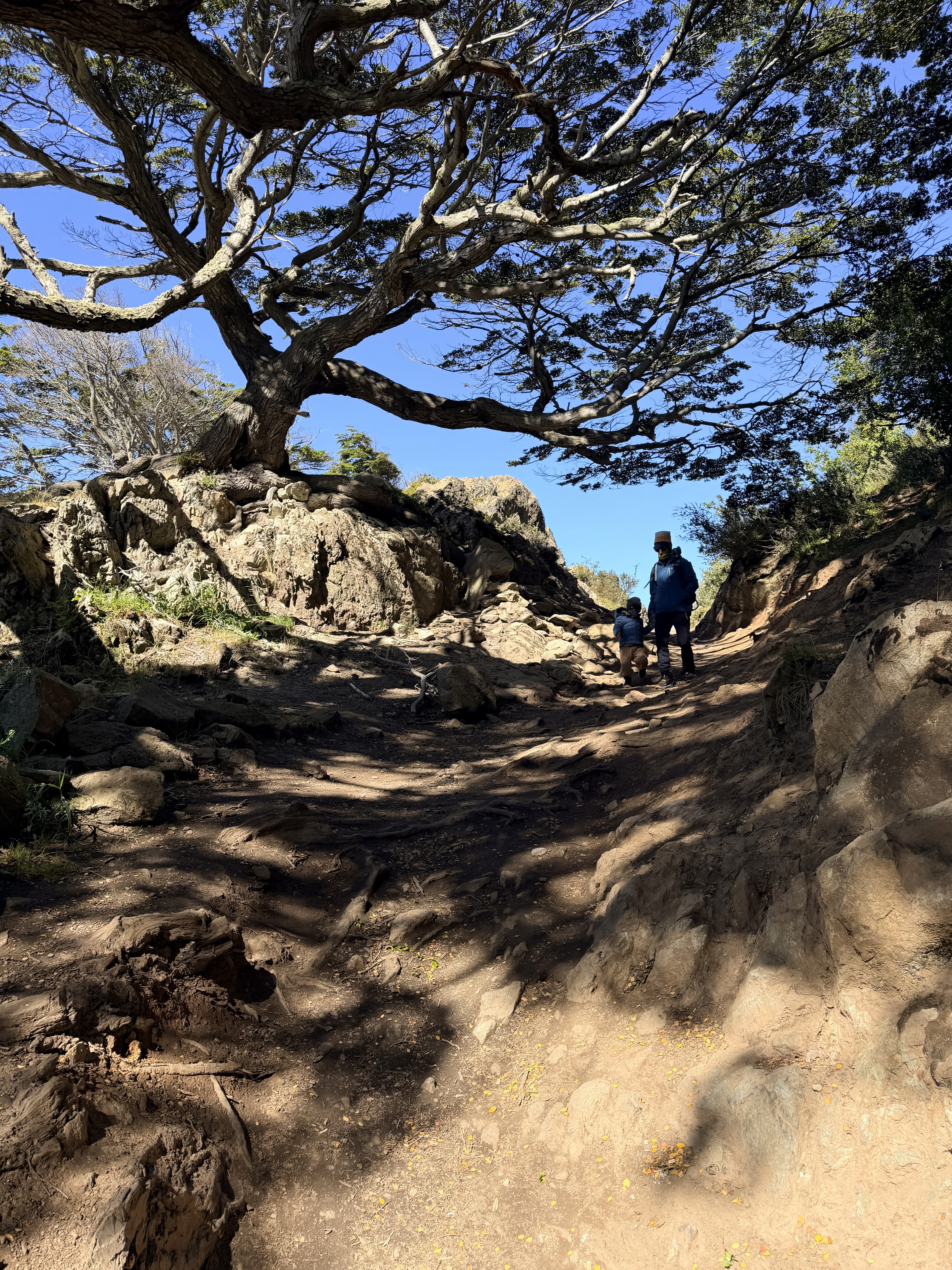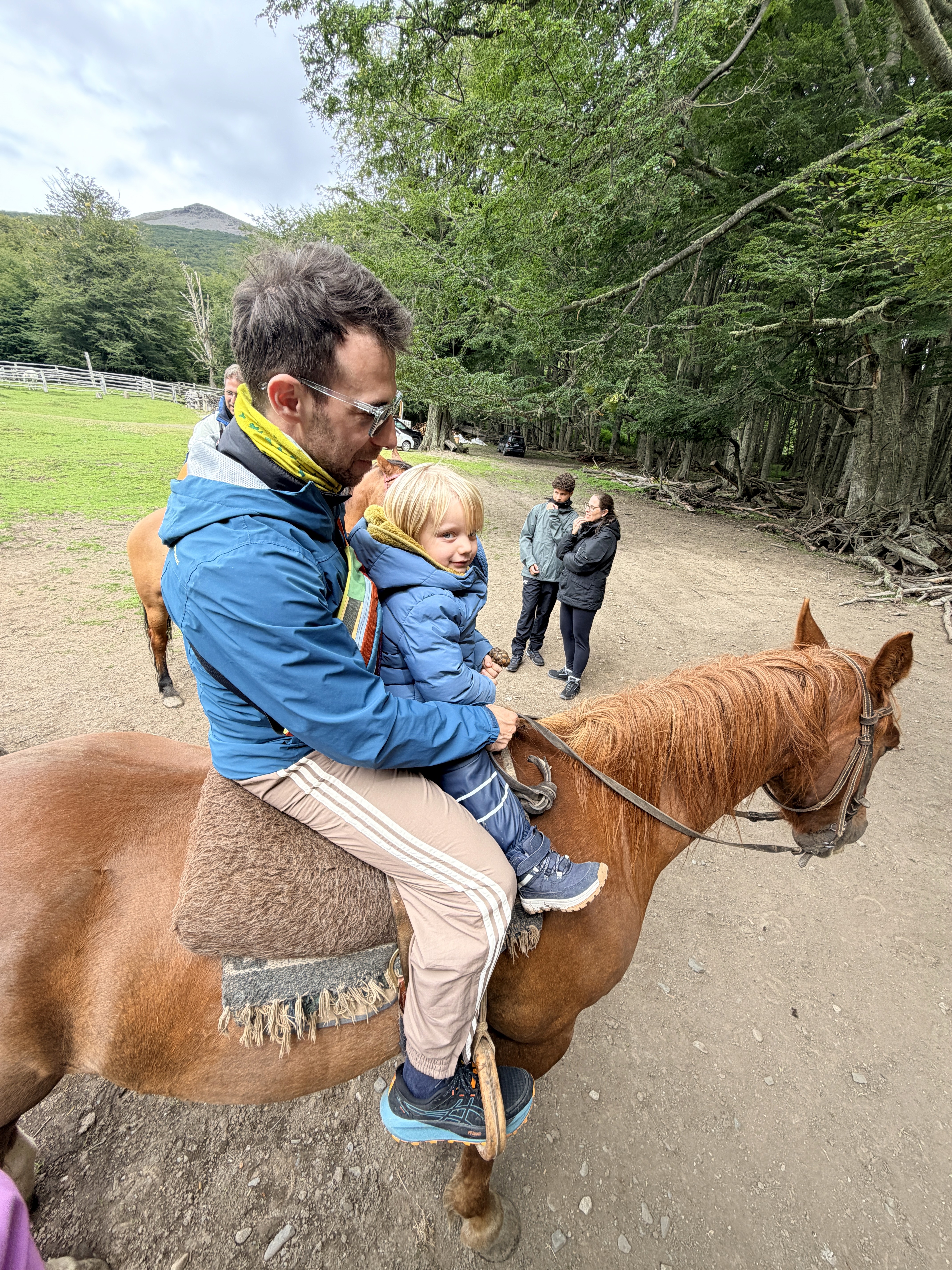 Prima dei pinguini avevamo fatto una piccola hike all’Estancia Túnel. Scelta quasi obbligata: il vento soffiava a 43 km/h e il ghiacciaio non era un’opzione. Circa 4 km. Axel ha corso tutto il tempo. Dopo la foresta, si usciva su un altopiano con vista mare mozzafiato. Ari ha camminato molto da solo, poi lo abbiamo portato in spalla per accelerare. È stata, per me, la giornata più bella a Ushuaia. Nonostante il vento. Nonostante la stanchezza.