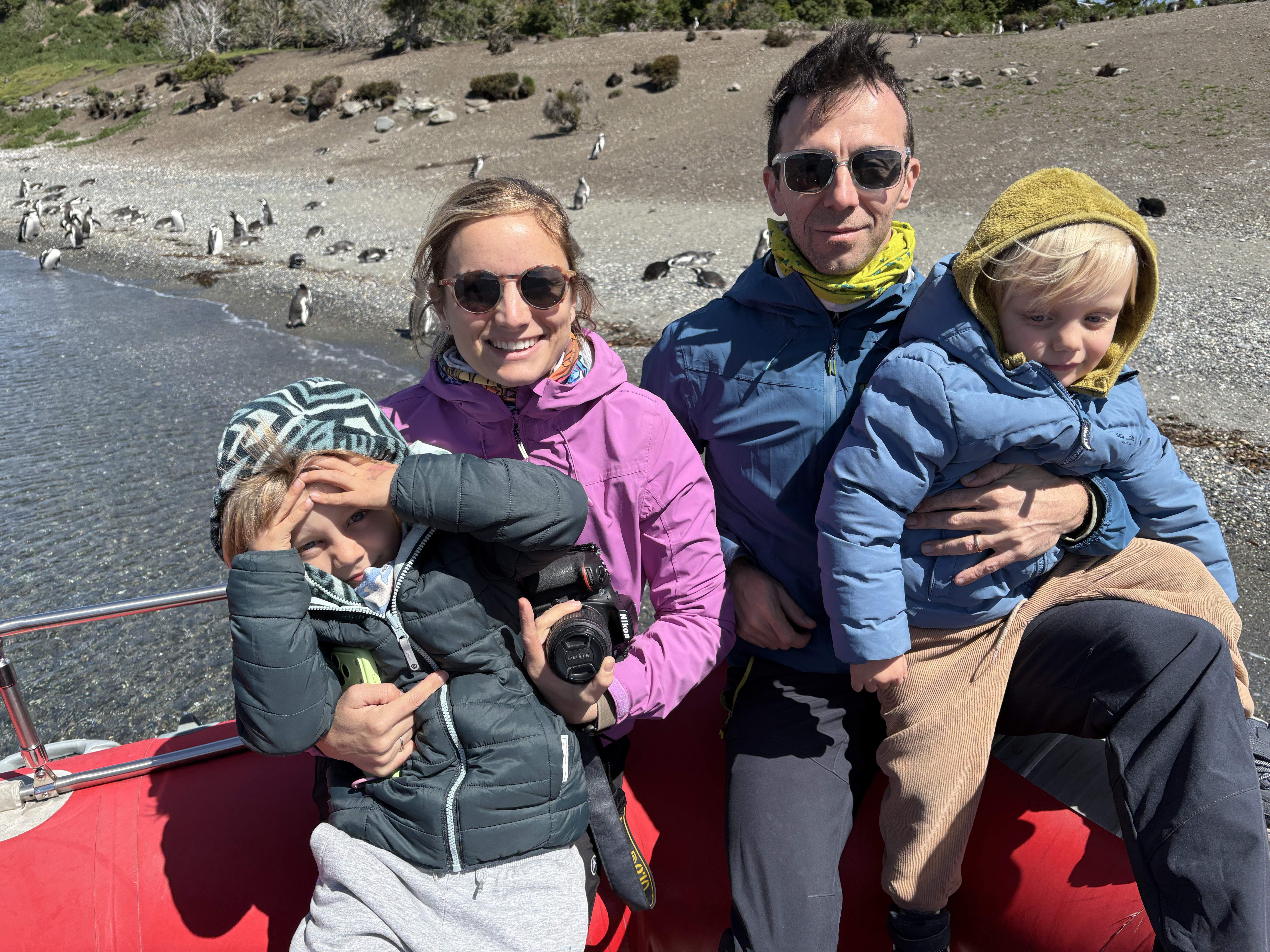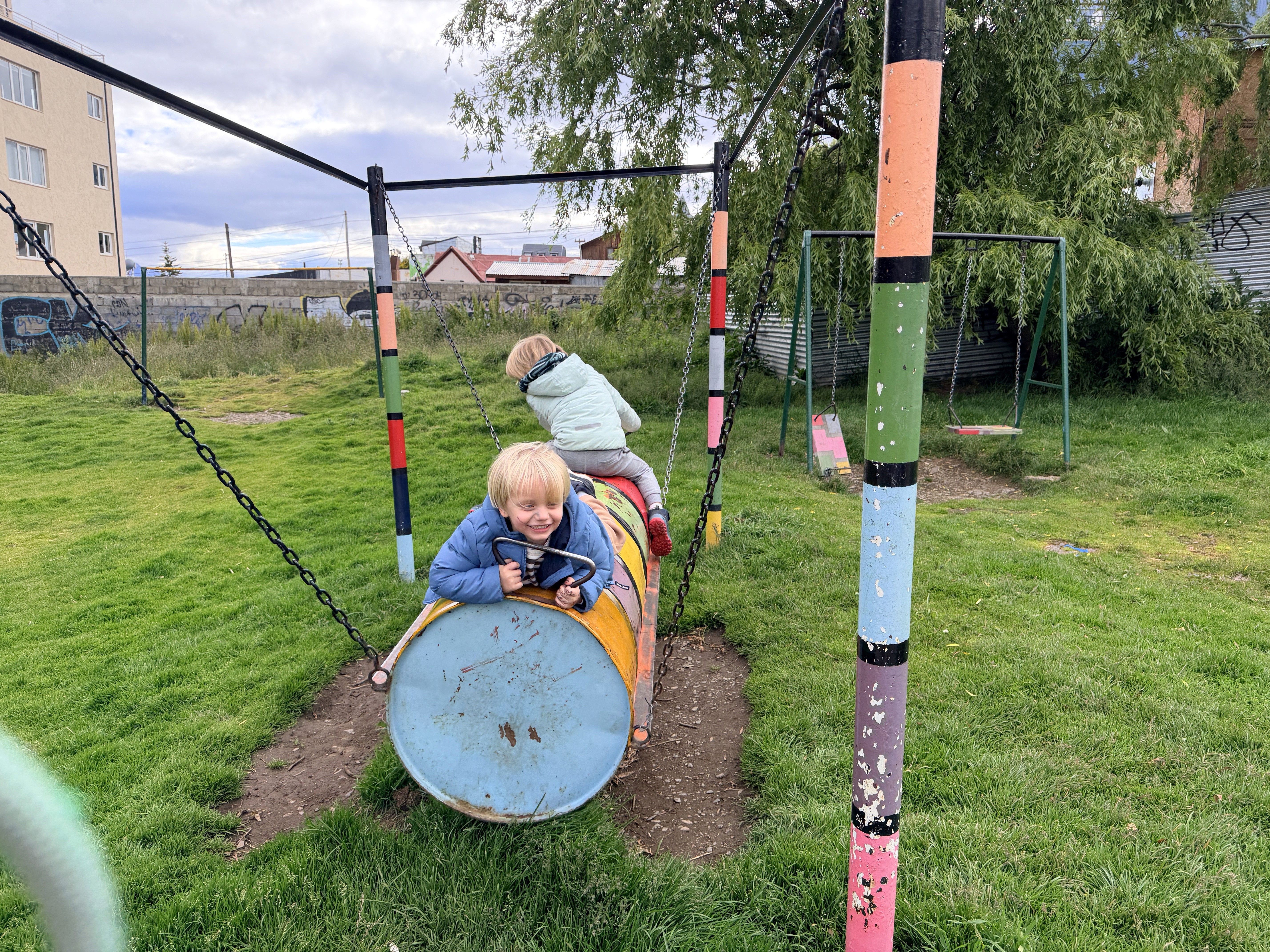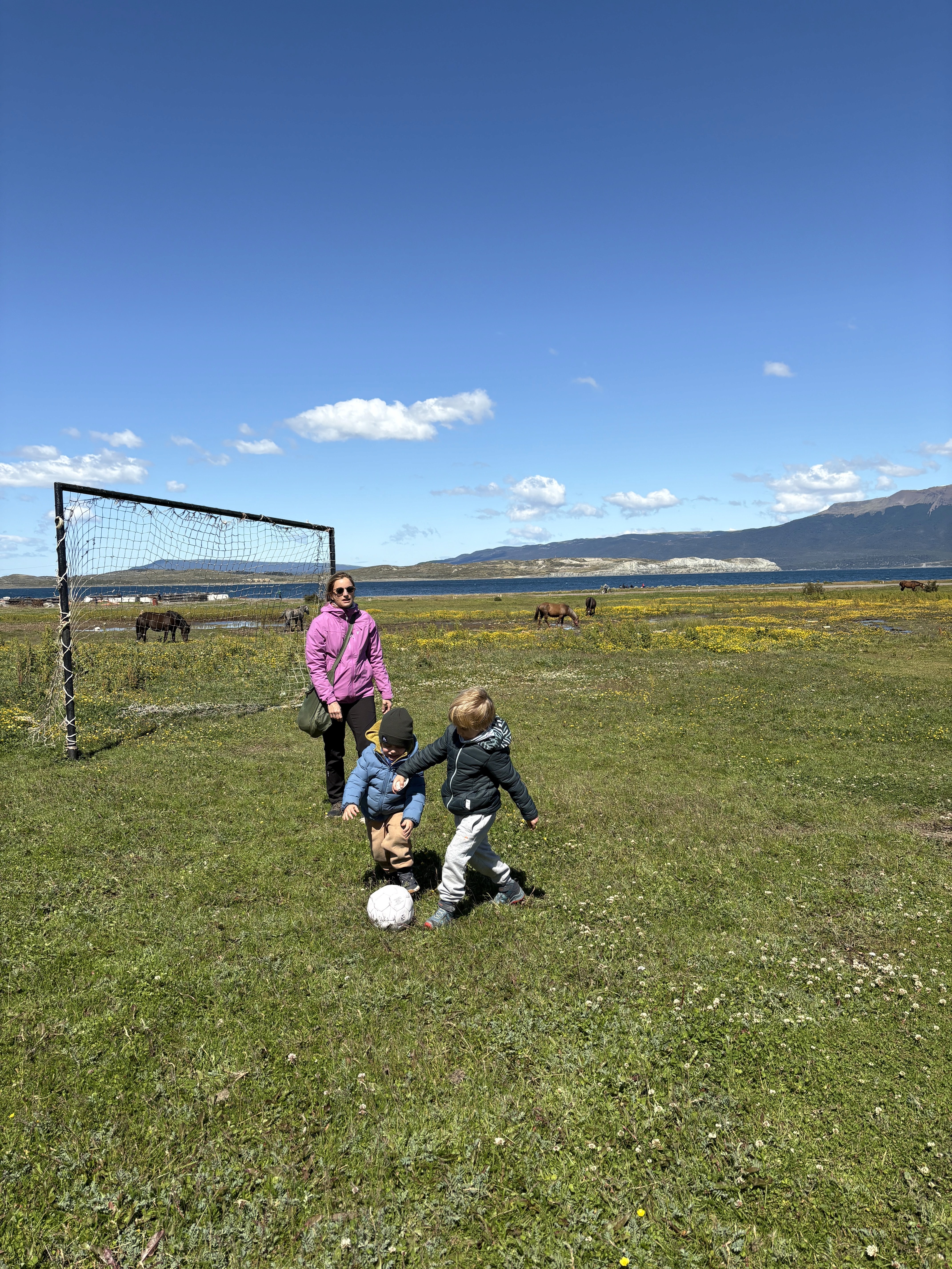 La parte preferita dei bambini, però, non sono stati i pinguini. È stato trovare un pallone da calcio in un campo di erba tagliata male e giocare noi quattro insieme. Erano insaziabili. Attorno a noi, cavalli che pascolavano avidamente. Poco più in là, uno scivolo fatto con assi di legno, altalene e saliscendi di metallo dipinto. Io ho fatto qualche foto mentre loro giocavano e ho ricaricato le pile.