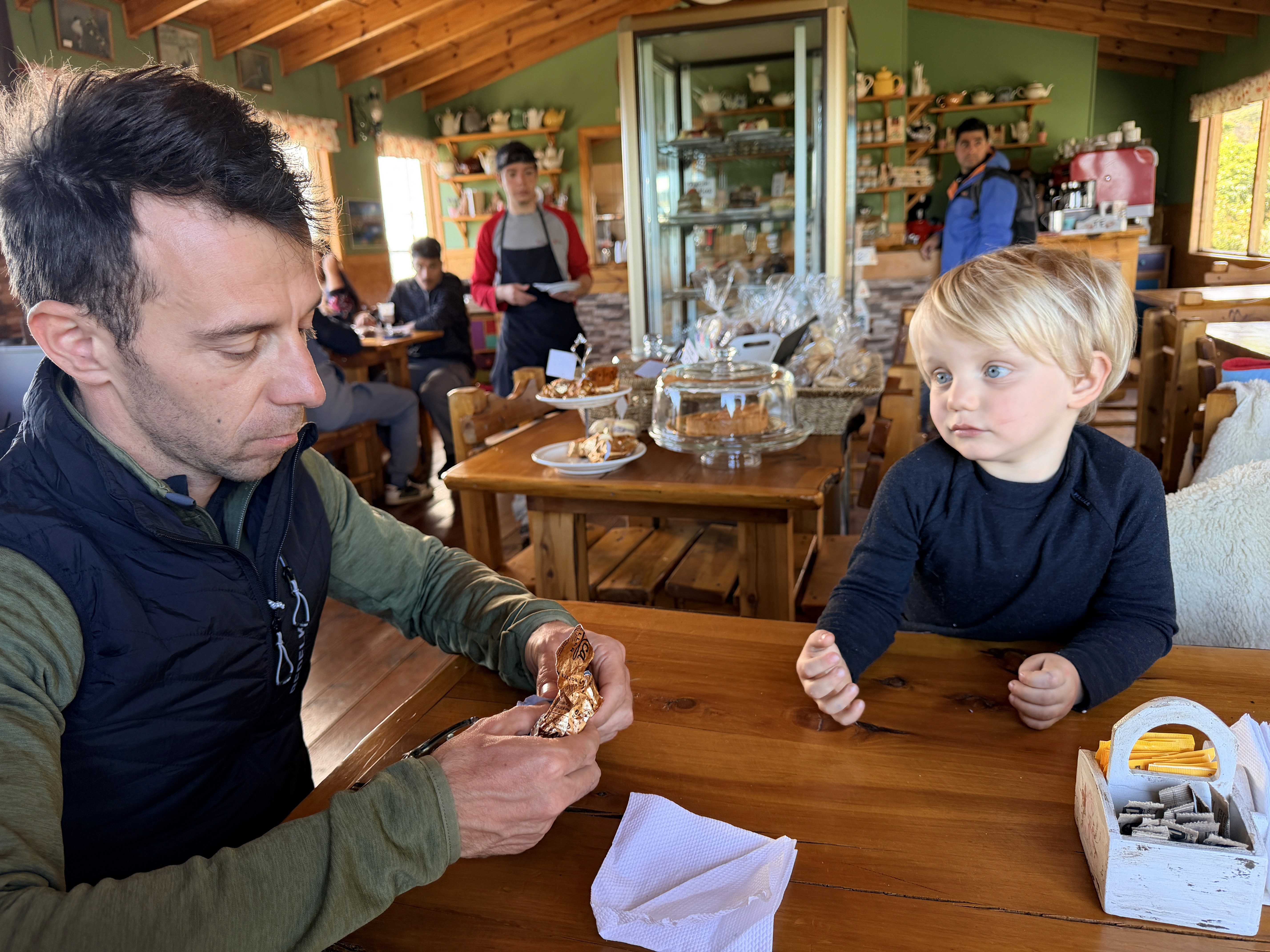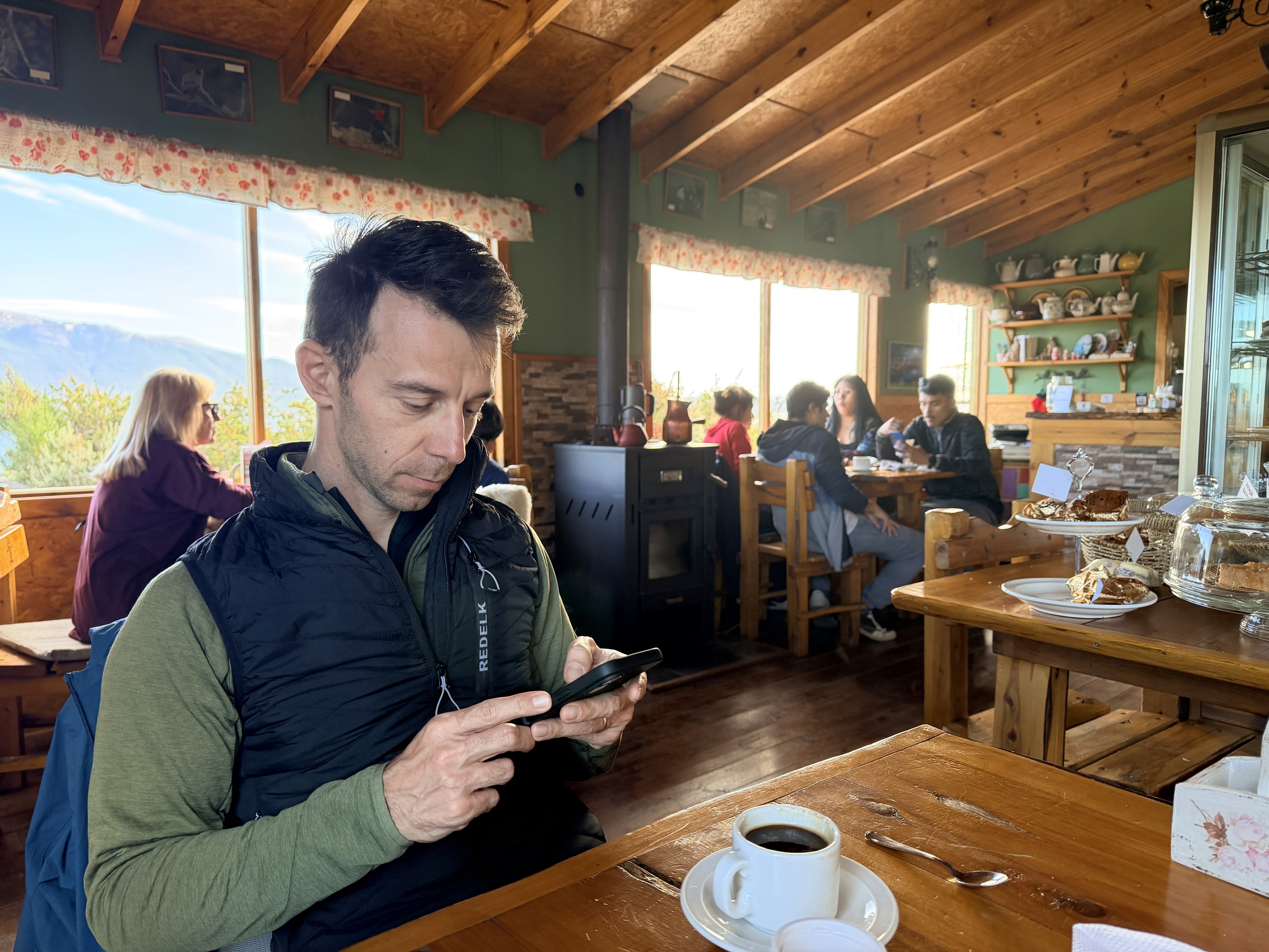Al ritorno, allungando la strada, ci siamo fermati in un caffè di un paesino nascosto. Due espressi. Io una torta al rabarbaro, Paolo un alfajor con dulce de leiche.