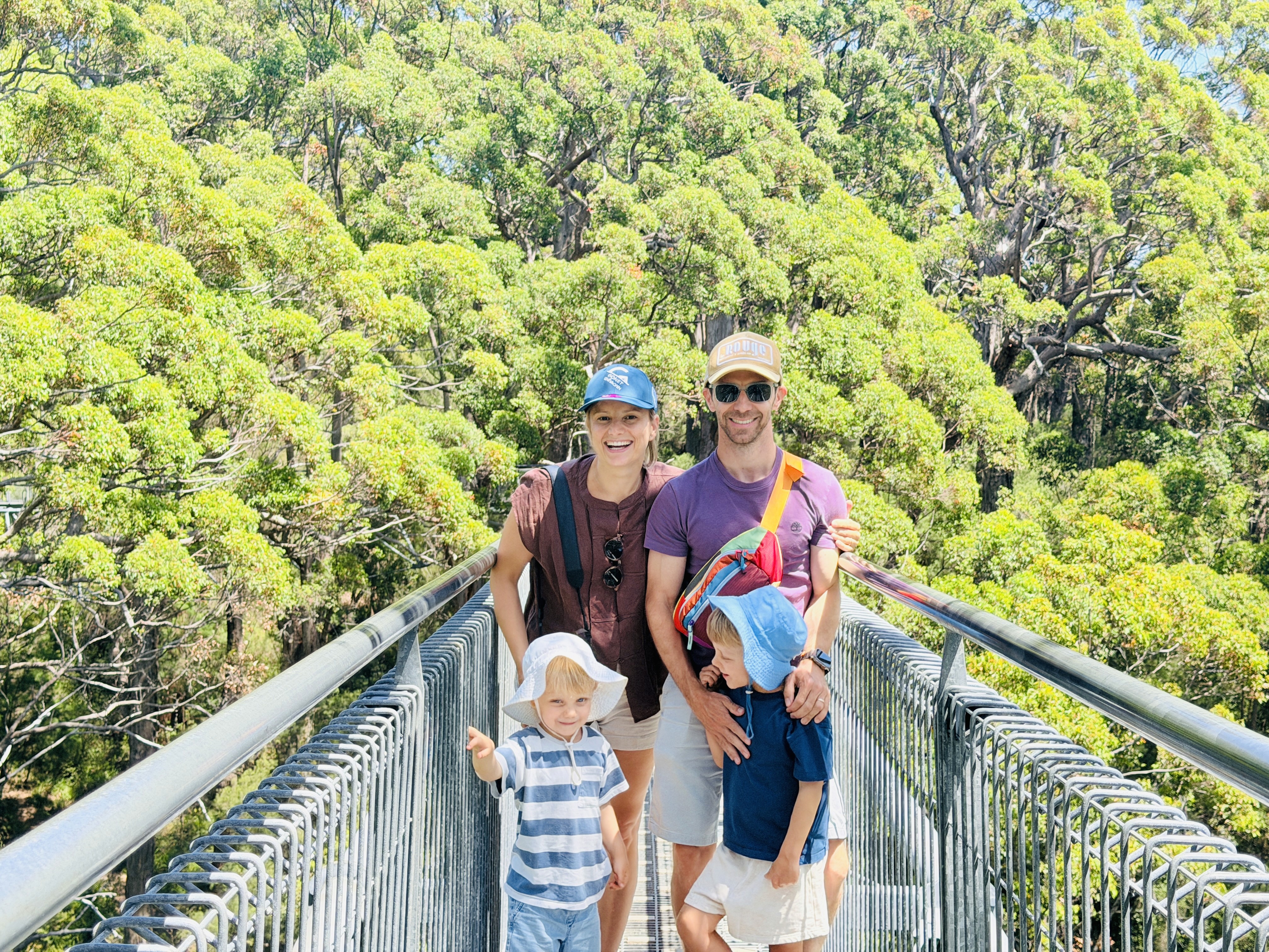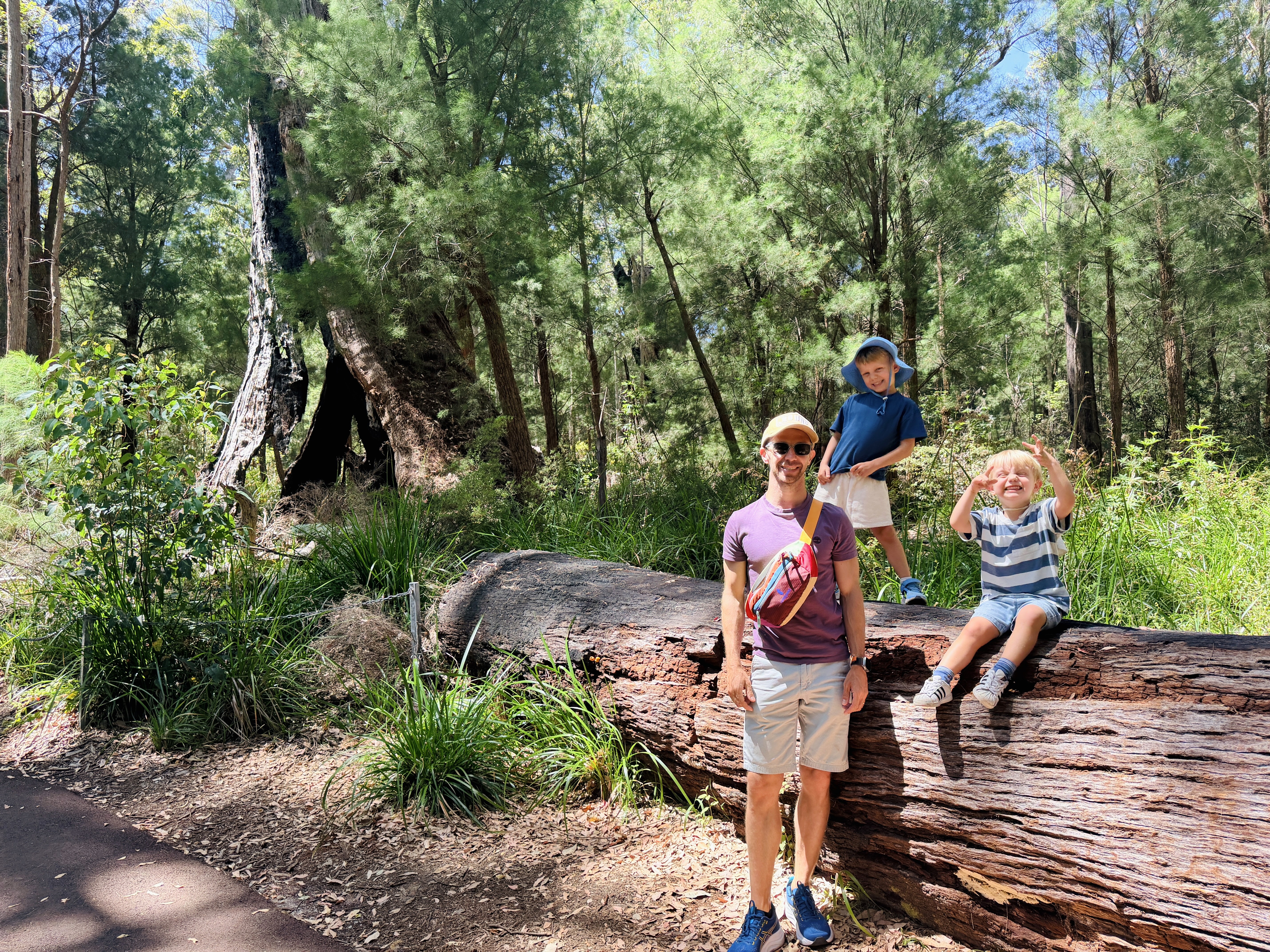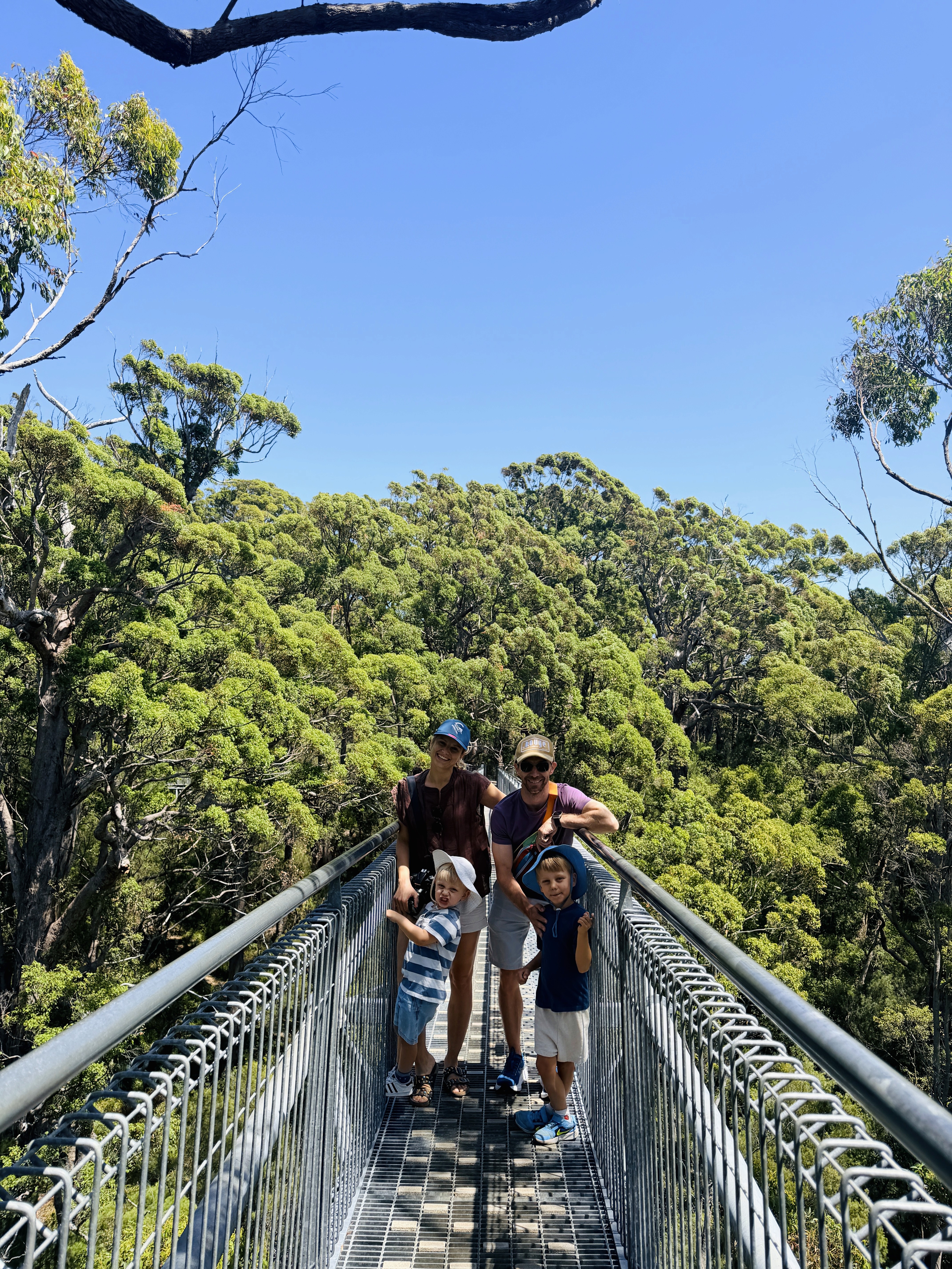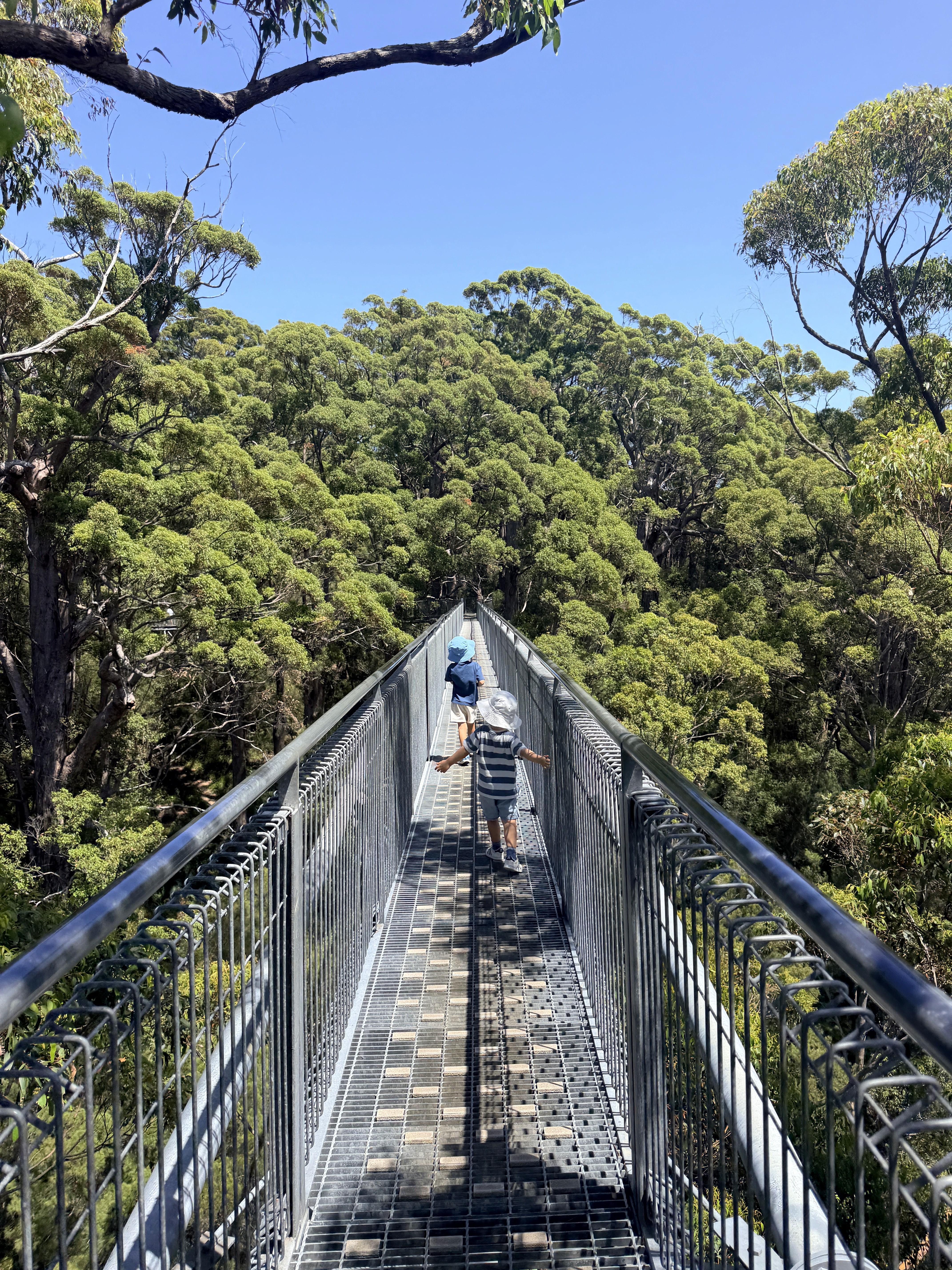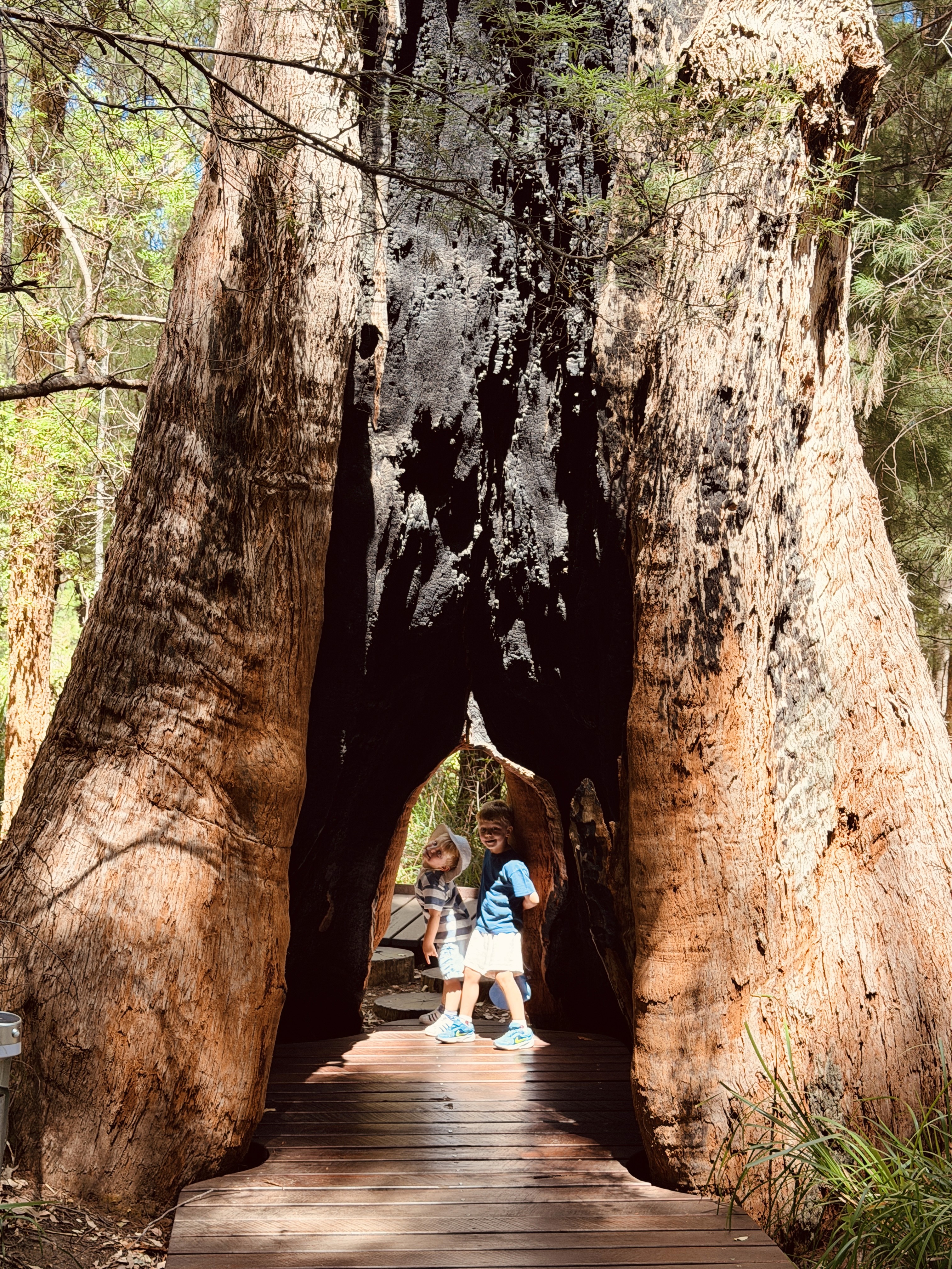 Sulla strada per Margaret River ci fermiamo nella foresta dei Karri giganti. Camminare sotto quegli alberi è come entrare in una cattedrale naturale, spesso bruciati all’interno e popolati da pipistrelli. Poi saliamo sulla passerella sospesa tra i tronchi.