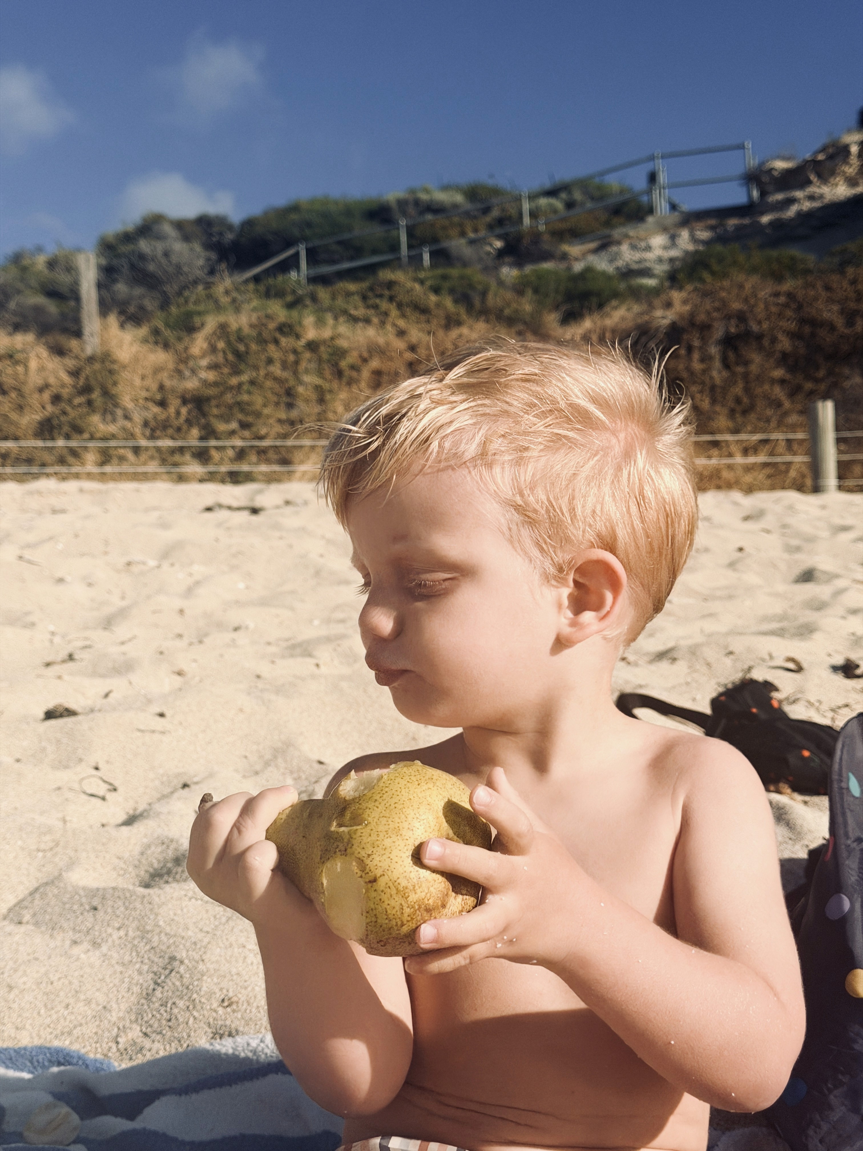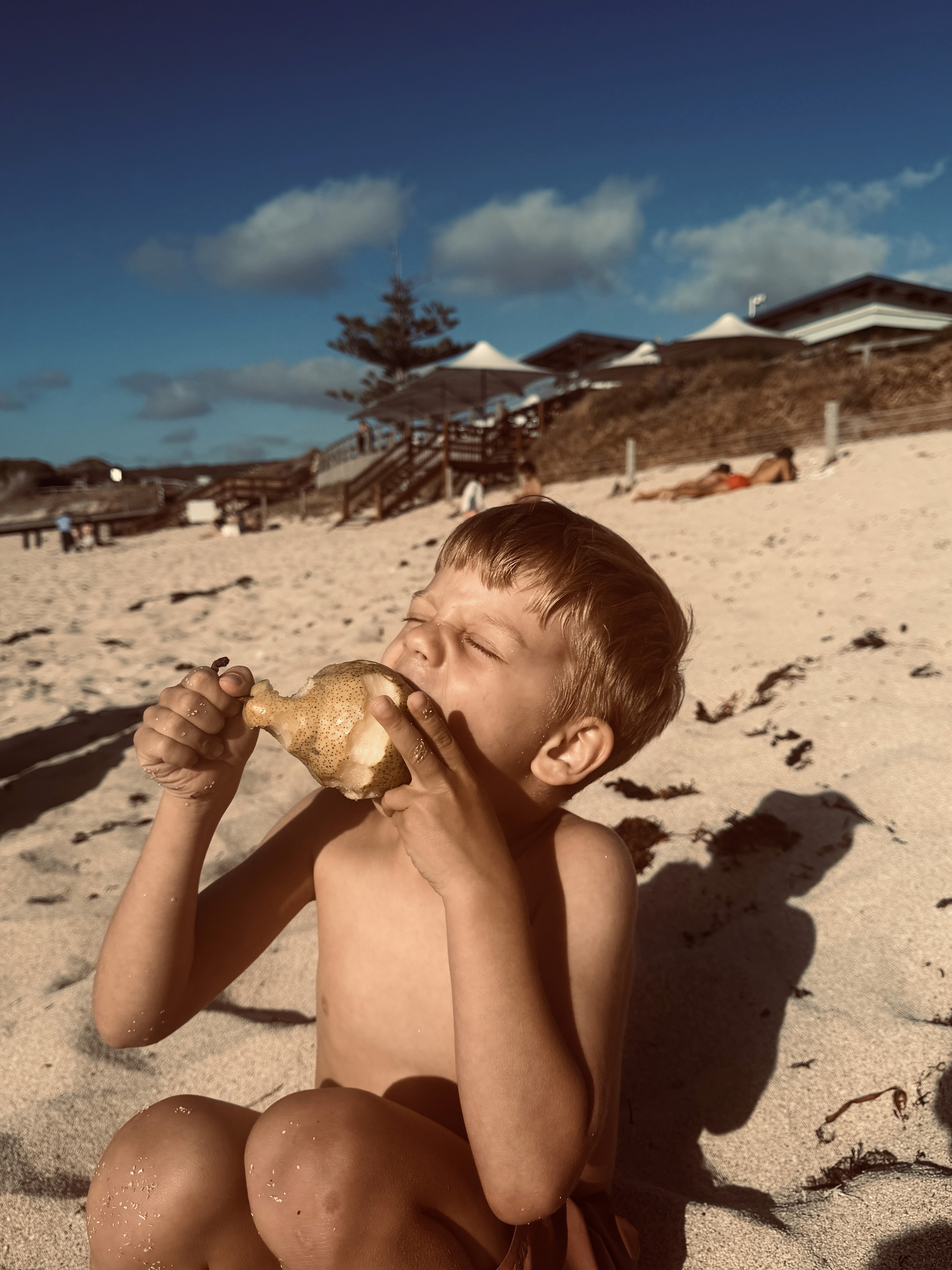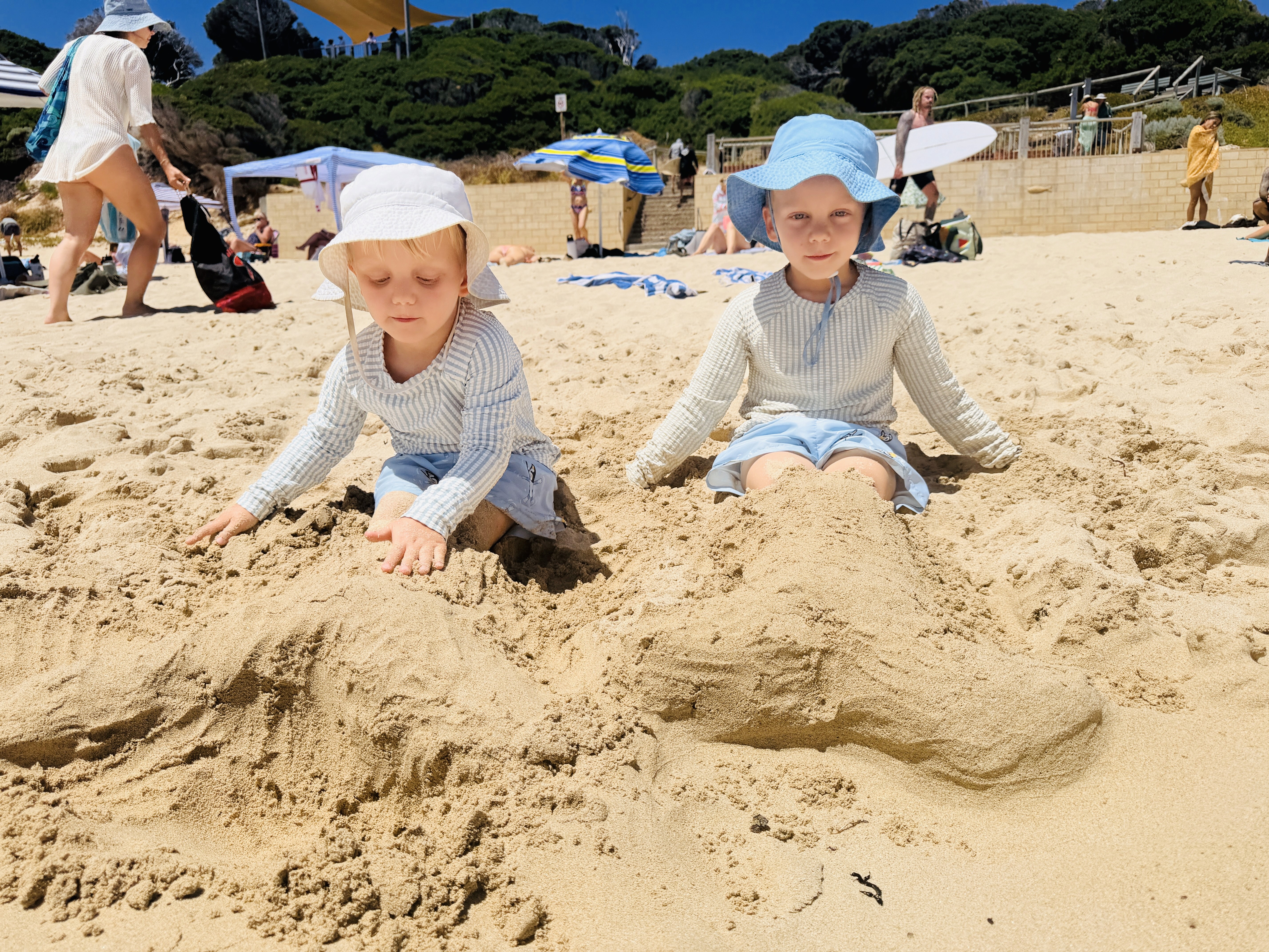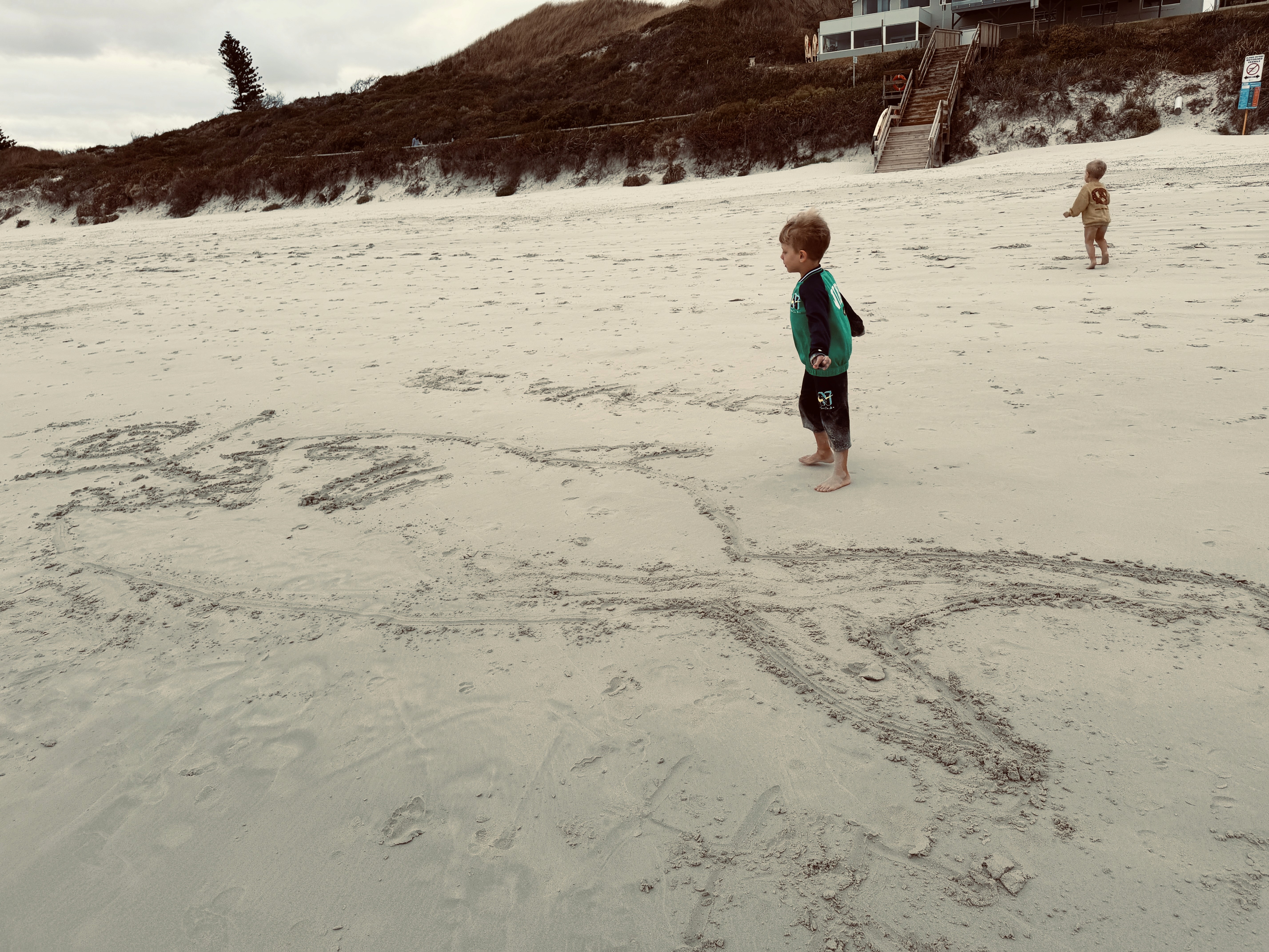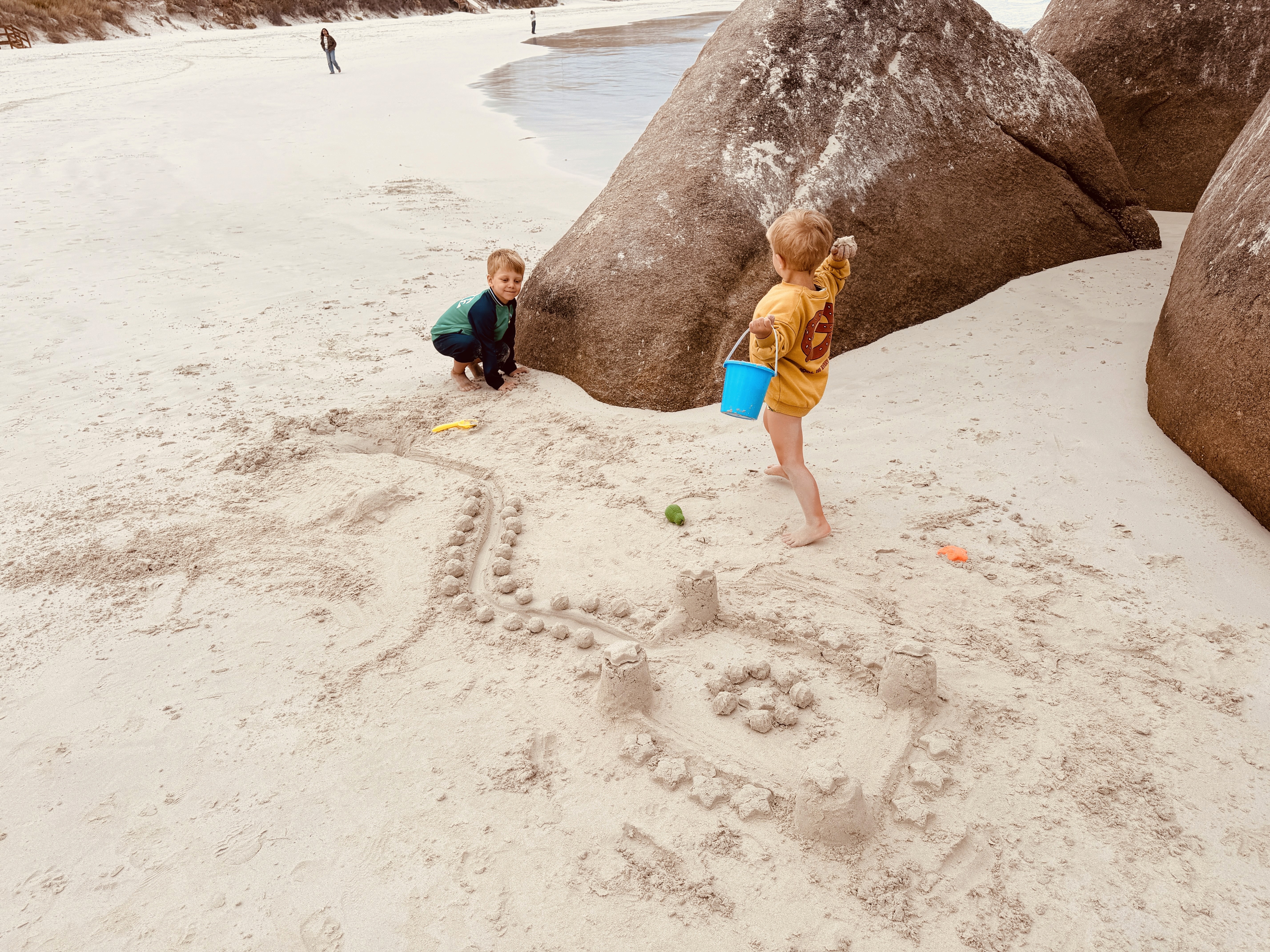 Gnarabup non mi conquista, ma i bambini sono felici: raccolgono conchiglie, costruiscono montagne di alghe lavorando in squadra. Axel le raccoglie dall’acqua e Ari le accumula sulla spiaggia.