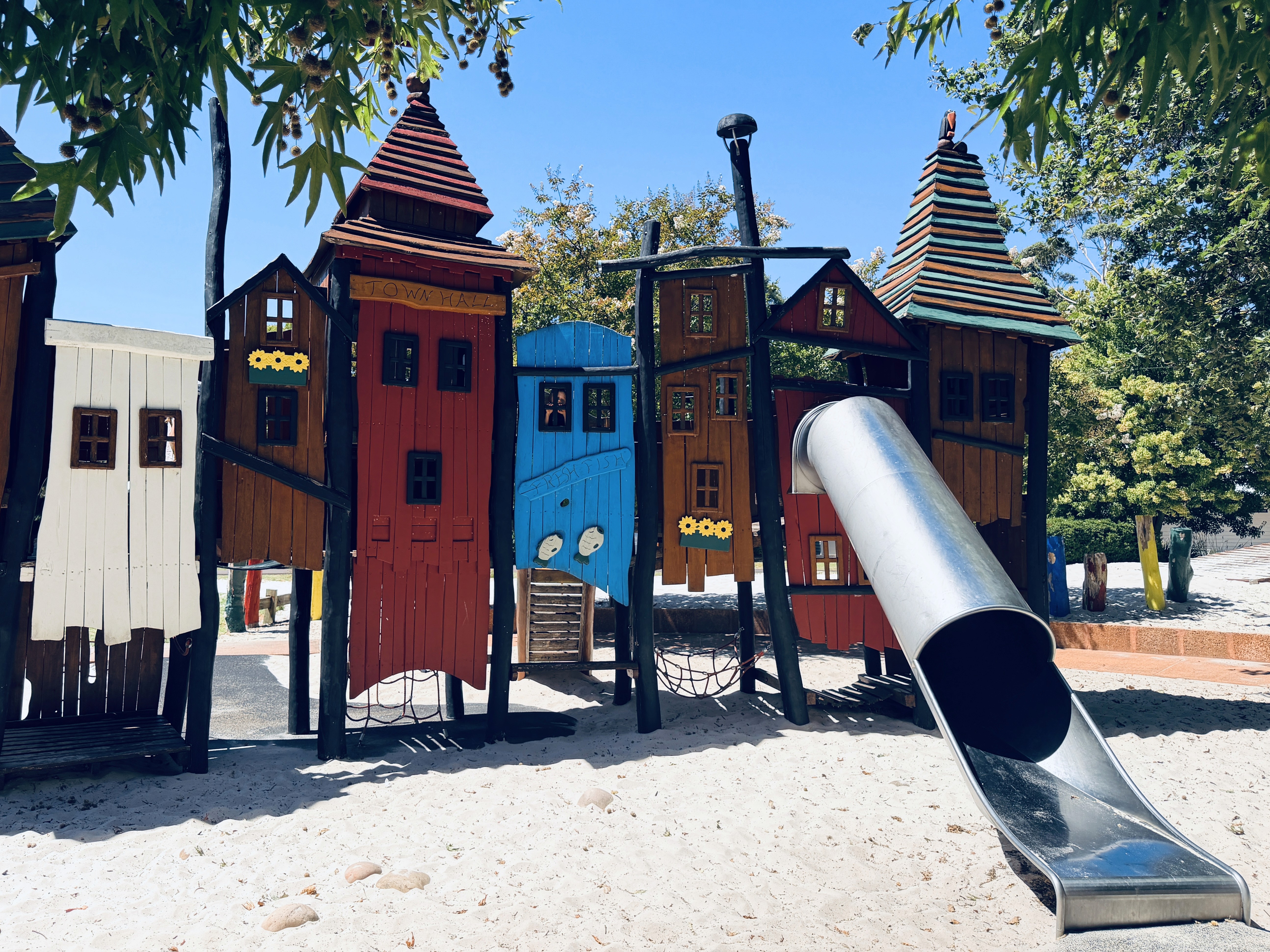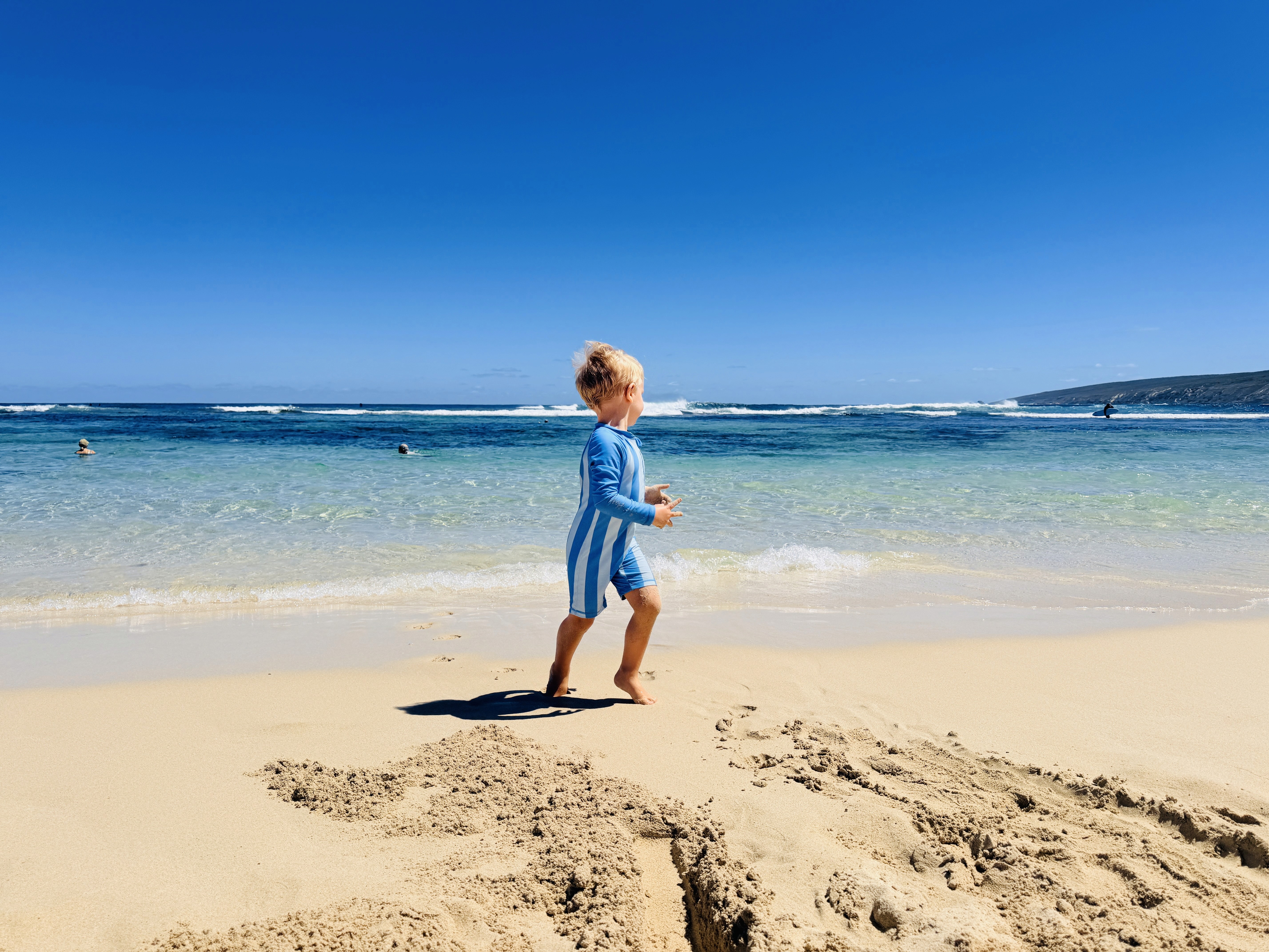 Yallingup Beach, invece ci soddisfa. Enorme spiaggia, surfisti in acqua, un parco giochi con un’onda in cemento blu e una tavola da surf a molle.