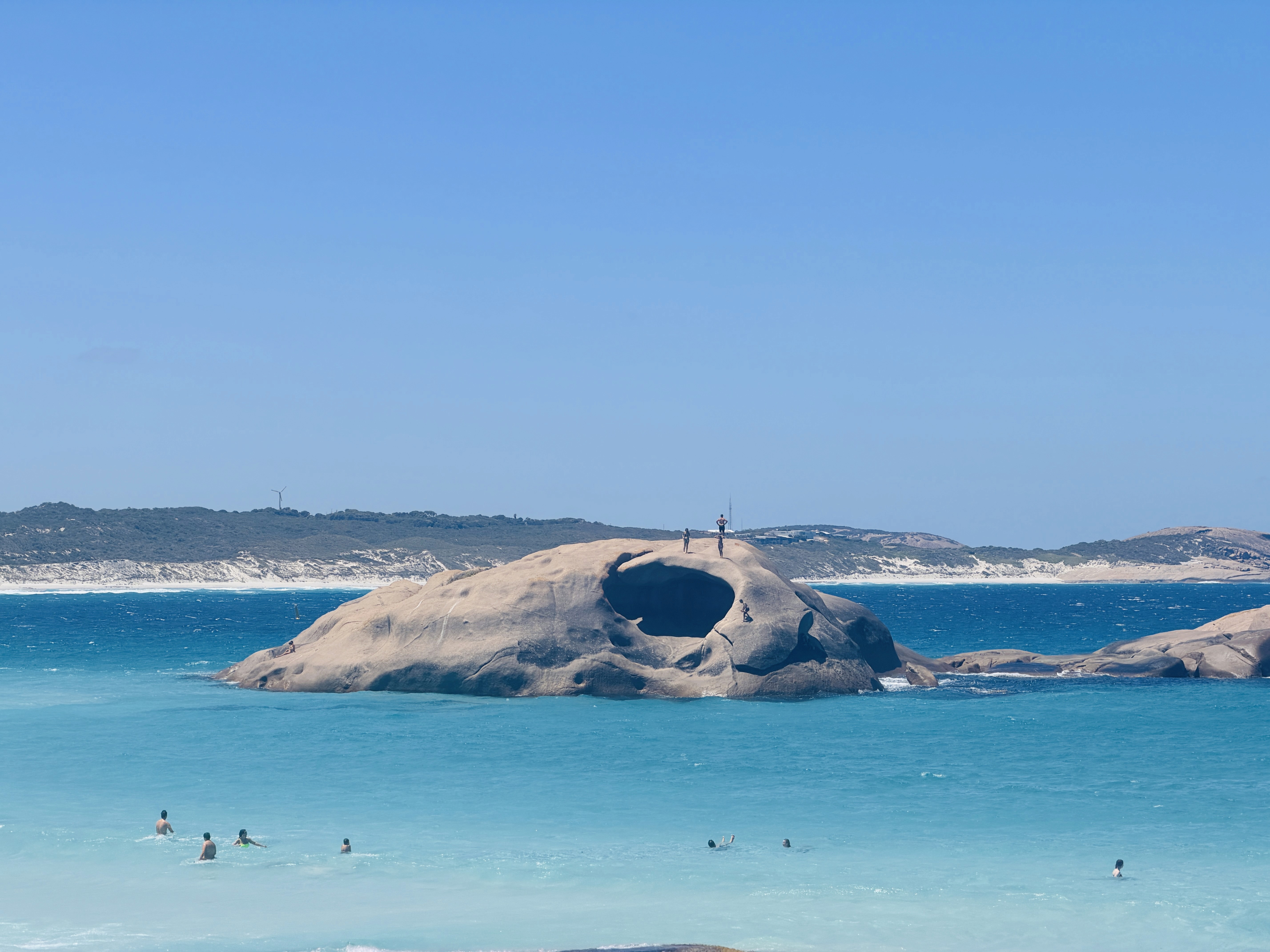 Twilight Beach è enorme, con la famosa roccia davanti. Il vento arriva puntuale a mezzogiorno, come se qualcuno girasse un interruttore.Raccontano di ragazzi rimasti bloccati sulla roccia per un allarme squali. Storie che qui fanno parte della normalità. C’è uno squalo disegnato sulla spiaggia che inghiotte un uomo. Quel giorno ne hanno avvistato uno a 50m dalla riva.