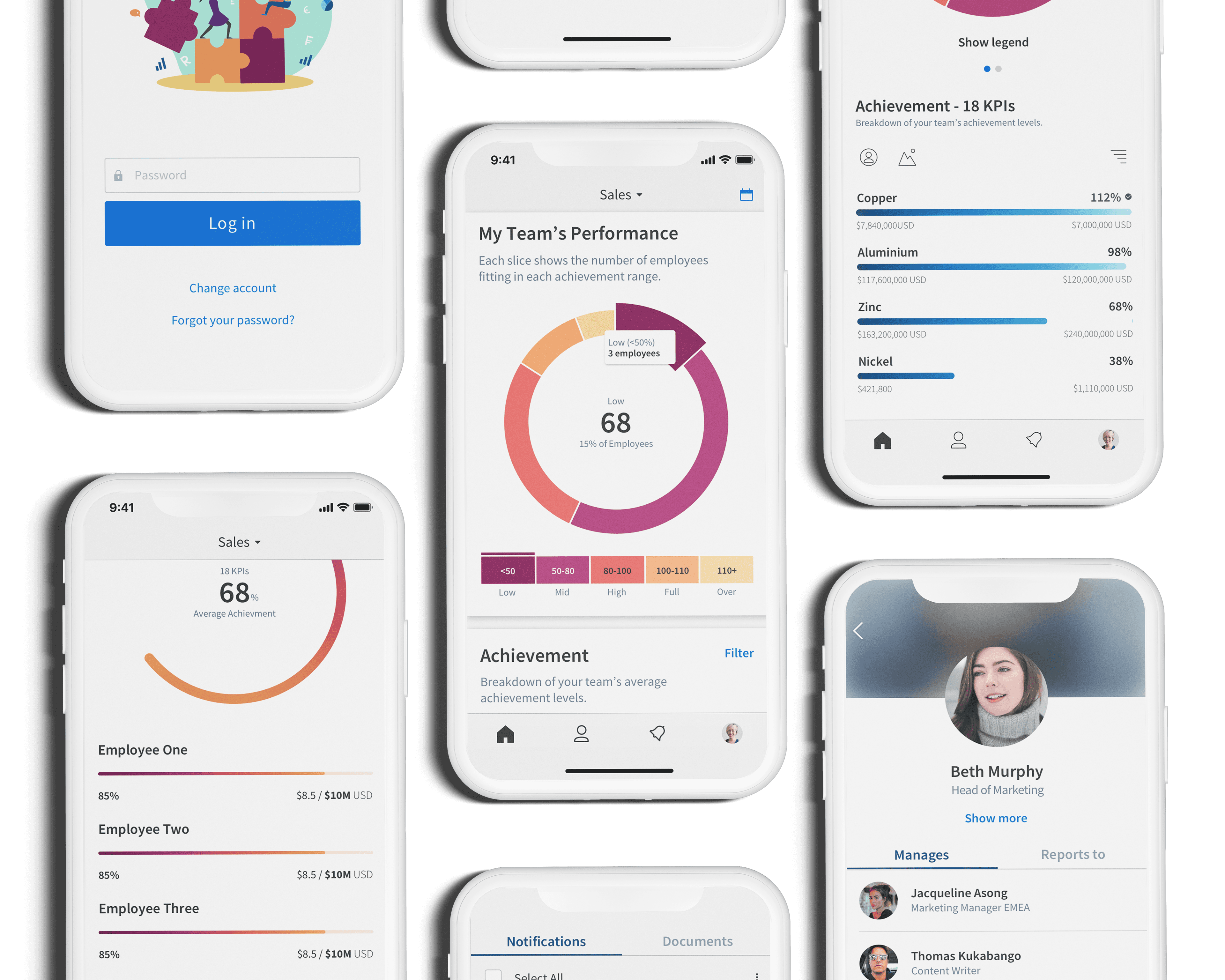 The outcome is an application where managers can log in quickly to see both their personal goals and achievements, but mainly where they can dig deep into their team's performances. At a glance they can find out if their team is underperforming or over performing and they can compare current results with achievements that occurred in the past. Some employees are payed depending on their achievements per KPI, therefore managers can view sales by KPI, as well as per employee or per region (in the example below sales of Copper are doing tremendously well compared to Nickel, while each of the employees has the same achievement rate of 85%).